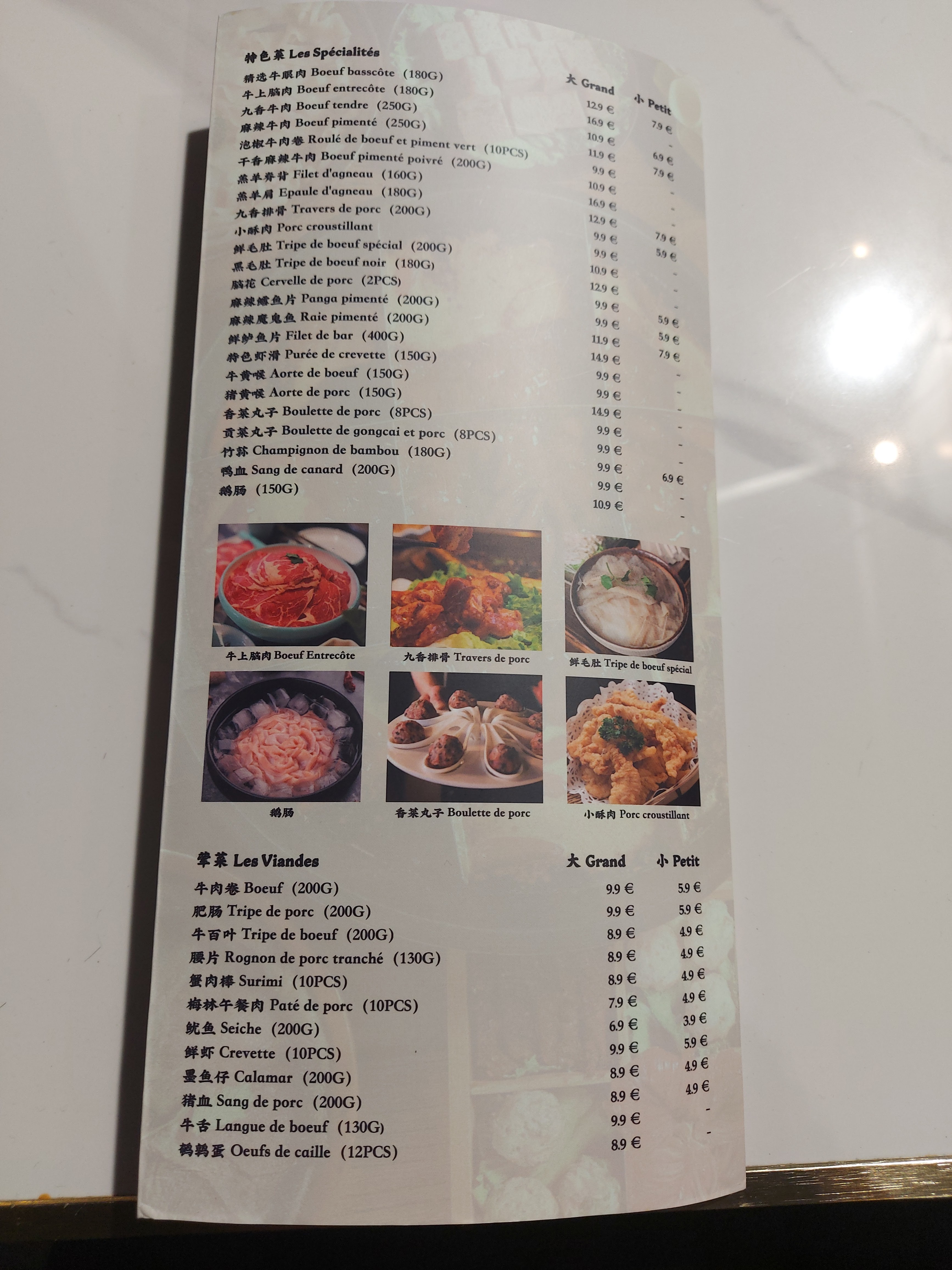 C'est mon restaurant fondu préféré. Pas loin de chez moi et le prix est correct. Pour un prix menu pour deux personnes de 57€, vous avez la viande bœuf et agneau, tripes, poisson, les légumes (carrots, pomme de terre, champignons, choux chinois, un autre legume vert), nouilles, et tofu. Comme nous étions trois et il y avait un gourmand, nous avon ajouter quelques plats de plus. Les boulettes au poisson et une petit assiette de bœuf, et des champignons. C'est mieux de réserver car il y a du monde surtout le week-end.