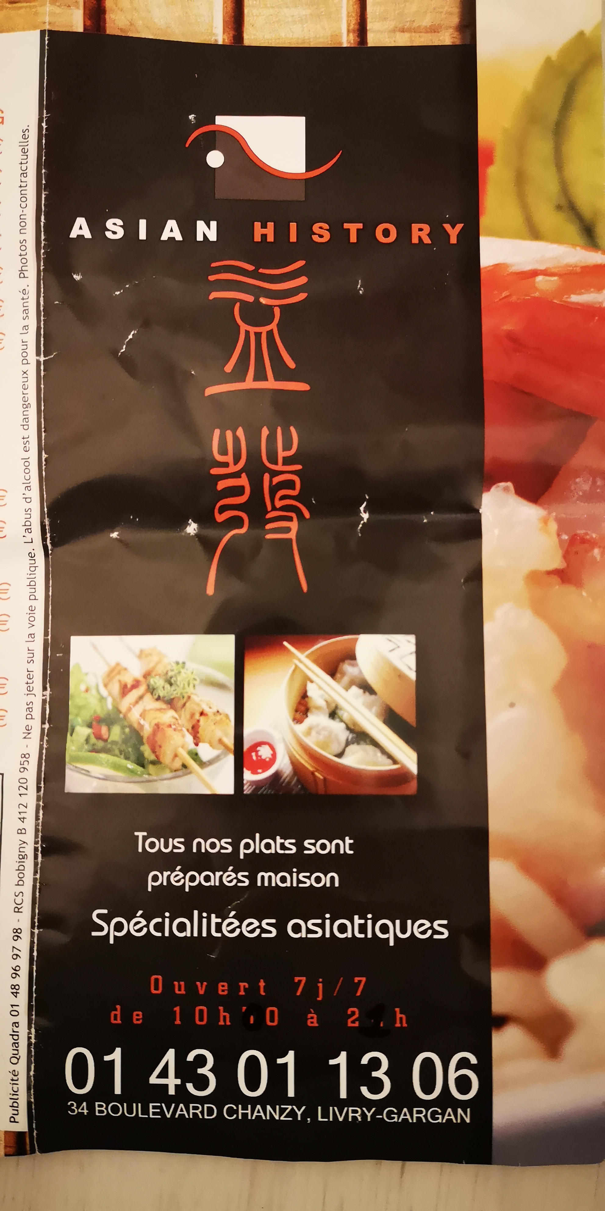 Bonjour, Tout d’abord, nous n’avons pas de site internet. Nous faisons la livraison mais UNIQUEMENT sur Uber Eats. Je ne vois pas pourquoi je vous renverrais sur cette plateforme, qui nous prélève aussi des frais, si nous faisions la livraison avec nos propres livreurs, ce qui n’est pas le cas! Votre commentaire n’est pas approprié. Cordialement, Asian History