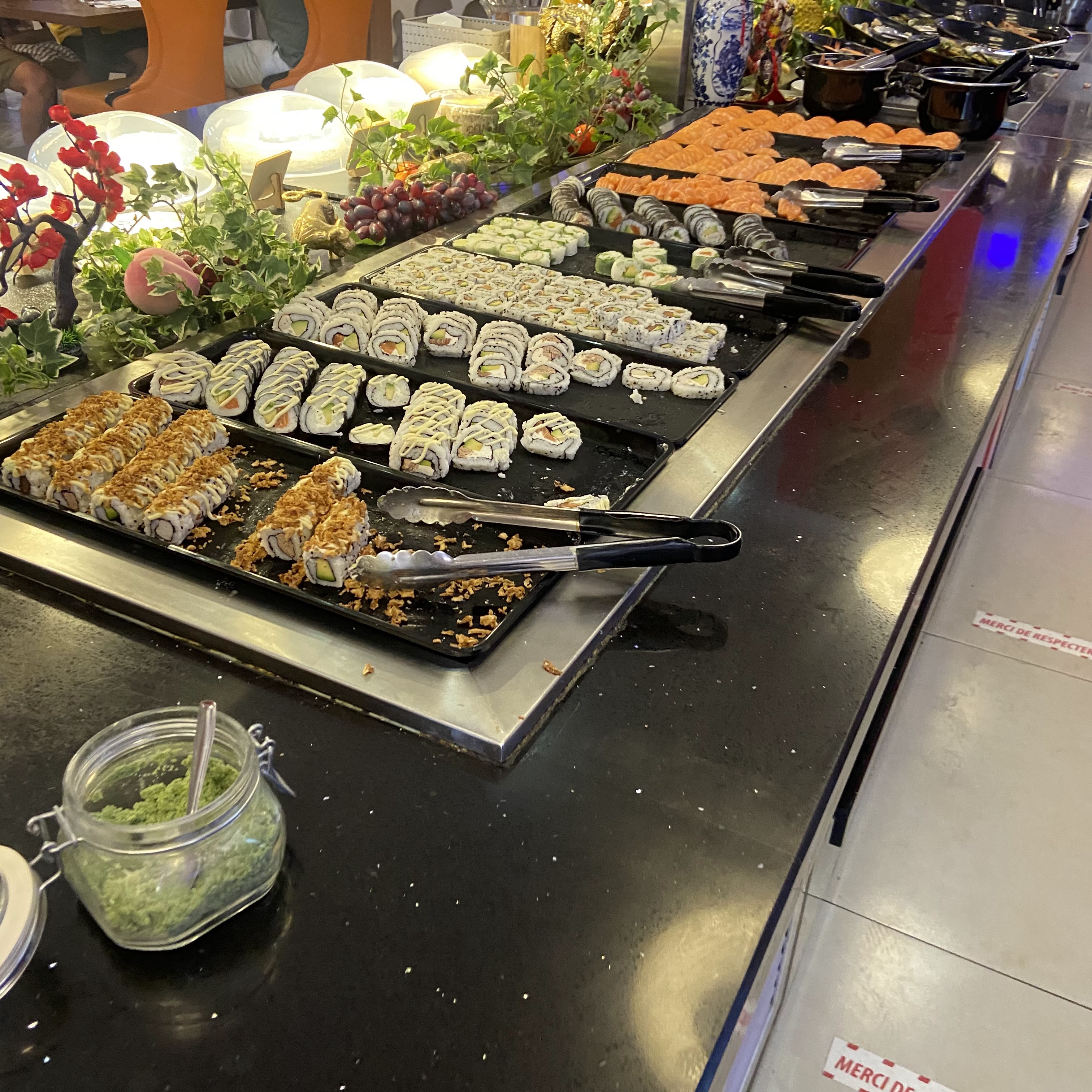 Si vous voulez bien manger ne venez pas ici. Ce restaurant est très chaleureux et le personnel très aimable et réactif. Malheureusement si vous avez un palais digne de ce nom n’y mettez pas les pieds. Normalement j’adore ce genre de buffets à volonté. Je n’ai jamais été autant déçus. Beaucoup de plats « cuisinés » et d’autres préparations n’ont pas de goût. quelques exceptions tels que le poulet au caramel ayant un goût de vinaigre, les morceaux de bœuf pour le Woh qui ressemblent à du gras caoutchouteux, la mayonnaise industrielle et aussi beaucoup de desserts mal conservés. J’ai regretté la tropesienne, la mousse au chocolat et le mille feuilles qui sont pourtant des produits congelés à la base. En revanche, les sushis sont préparés sur place et sont délicieux. Il y avait d’autres petites exceptions sur certains produits. C’est tout.