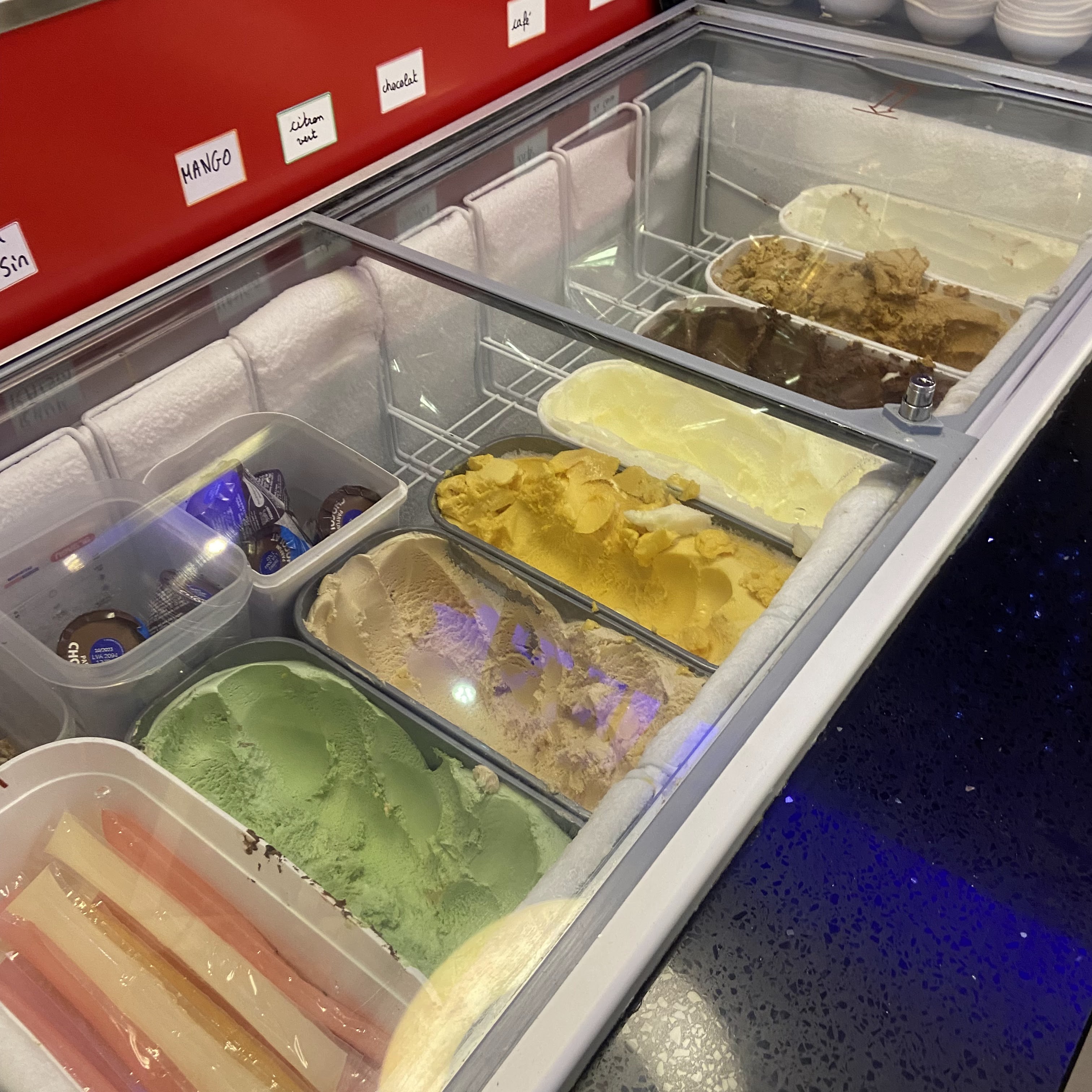 Qualite des produits très bien. Buffet réapprovisionné régulièrement Propreté des locaux et de la vaisselle Serveuse accueillante. Par contre les bonbons sont pas top. Pas le plus important ...