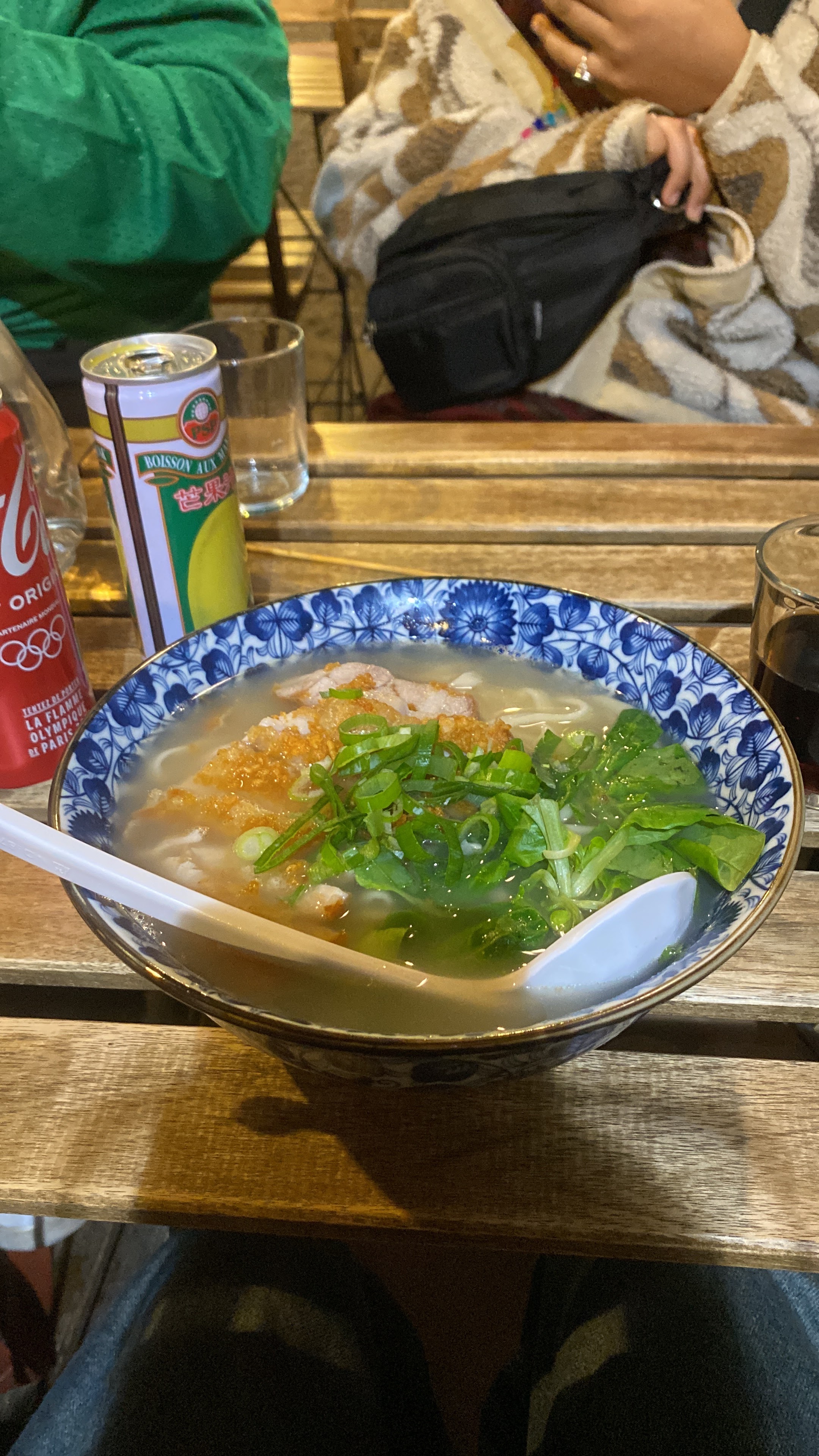 Endroit serré, cargaison de farine produit alimentaire qui prennent de la place alors qu’il y en a déjà peu. Les entrées furent bonne mais le riz blanc est chère 3€, oreille de porc et poulet très bon mais manque d’accompagnement, pâte riz pain… la soupe fut passable le bouillon fut trop salé à notre goût et le goût de clous de girofle était un peu trop présent mais je ne remettrais pas en question la cuisine 🧑🍳 dans l’ensemble c’est très bien 👍 Pensez à réserver ou venir tôt. Dommage que la terrasse sois un peu étroite aussi.