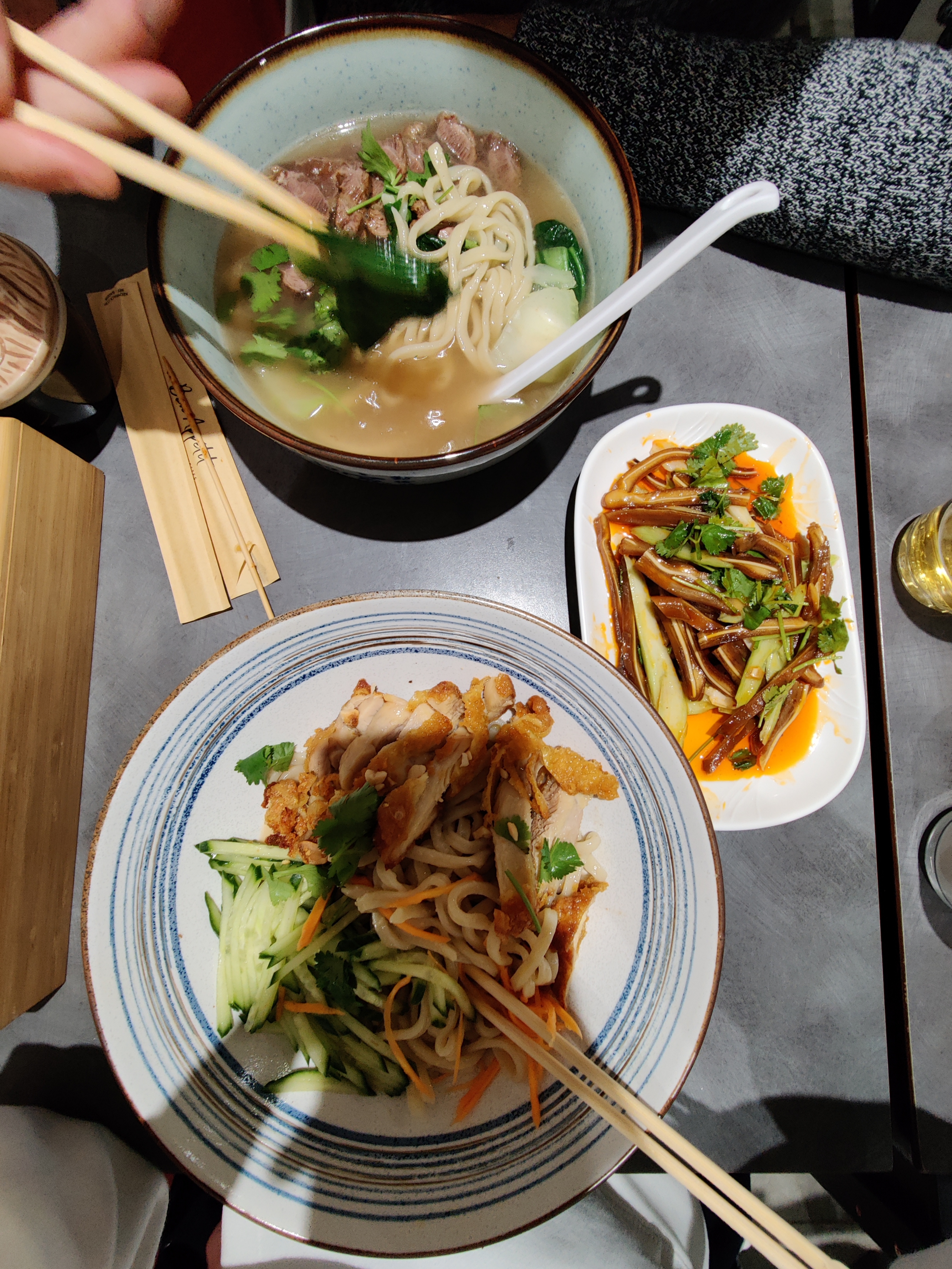 Cela faisait longtemps que je voulais un restaurant qui se spécialise dans les ramen chinois. C'est le genre de plat que l'on cuisine en grande quantité donc je ne pouvais pas le faire chez moi. Le local est petit mais spacieux, avec un mur magnifiquement décoré. On est assis confortablement et l'ambiance est calme. Déjà un premier plus pour moi : il y a un pot d'huile pimentée à disposition sur chaque table, ainsi que des boites de mouchoirs (ceux qui mangent très épicé connaissent l'enfer du nez qui coule) !! Je prends les ramen au boeuf épicé. On m'amène un gros bol très joliment présenté avec des tranches de boeuf, du bok choy et de la coriandre. Le bouillon est clair, ce qui pour certains pourrait signifier qu'il est insipide mais que nenni !!! Une explosion de saveurs, c'est très léger et assaisonné pile comme il faut. Je rajoute de l'huile piquante ppur vraiment y aller et oh la la, quel bonheur !!! Ça se voit que les nouilles sont faites à la main, elles sont bien élastiques (bouncy) et épaisses, super agréables en bouche. La viande... C'est vrai que souvent c'est un morceau qui a tendance à être très dur est dans trop de saveur donc j'y vais avec appréhension mais je suis agréablement surprise : la viande fond en bouche et se marie délicatement avec le bouillon. En bref : j'ai trop bien mangé et je suis trop heureuse d'avoir enfin trouvé une bonne adresse pour les bols de nouilles chinoises. Certains pourraient argumenter que c'est cher, 10€ le bol. Mais je trouve que c'était très copieux et nourrissant. Il faut aussi prendre en compte que tous les épices contenus dans la soupe ne sont pas toujours simples à trouver ! Je trouve les prix corrects pour la quantité et la qualité. Je recommande !! Superbe découverte