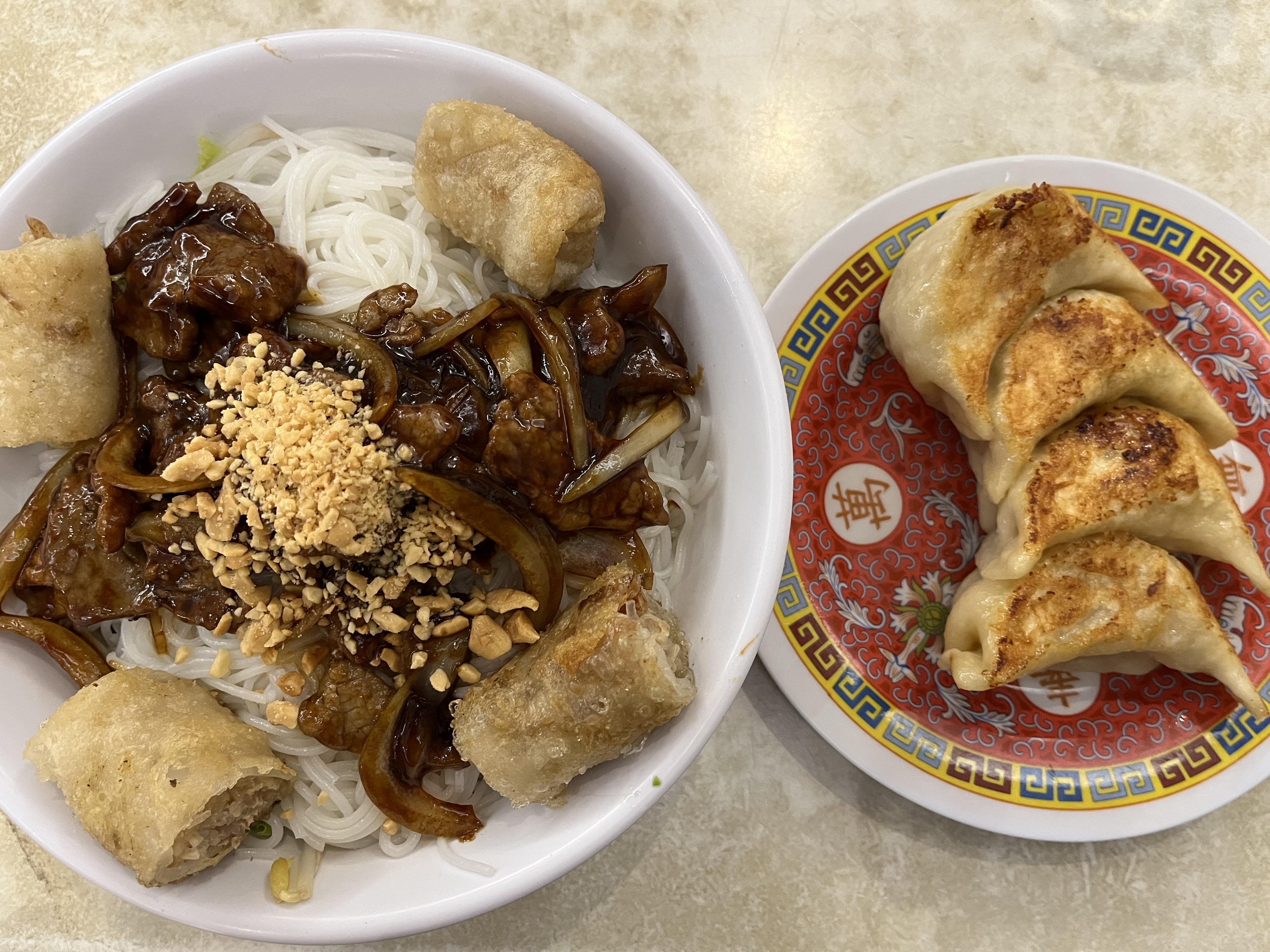 Rapport qualité/quantité/prix interresant. Vermicelles de riz sautées porc fumé et raviolis en entrée. Service rapide.