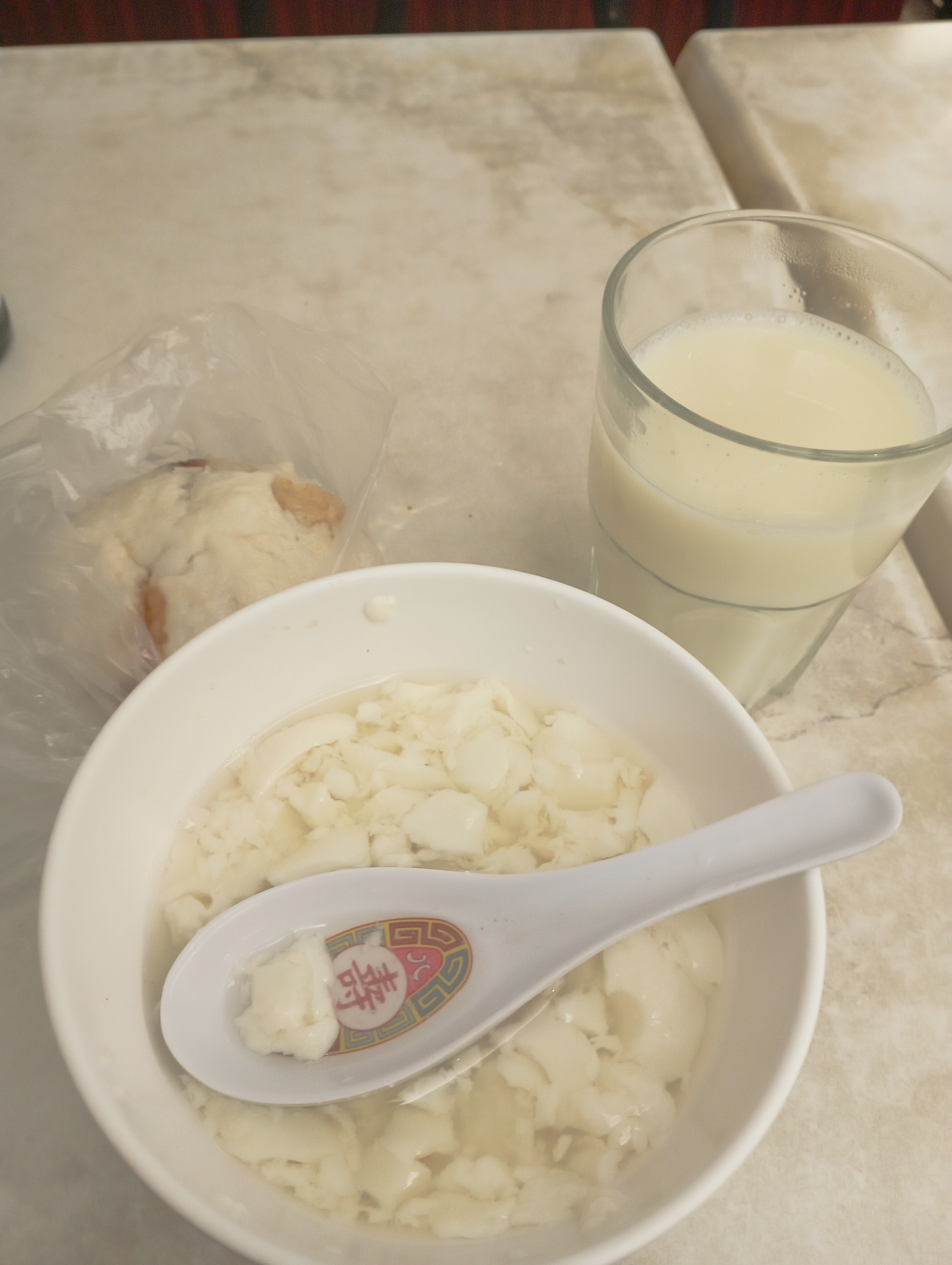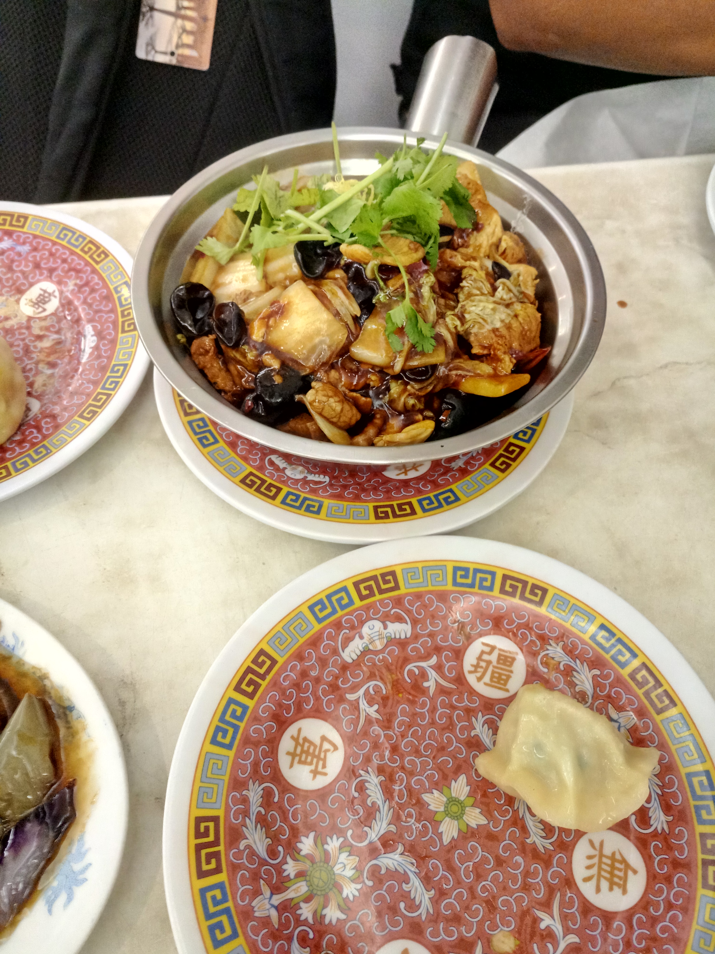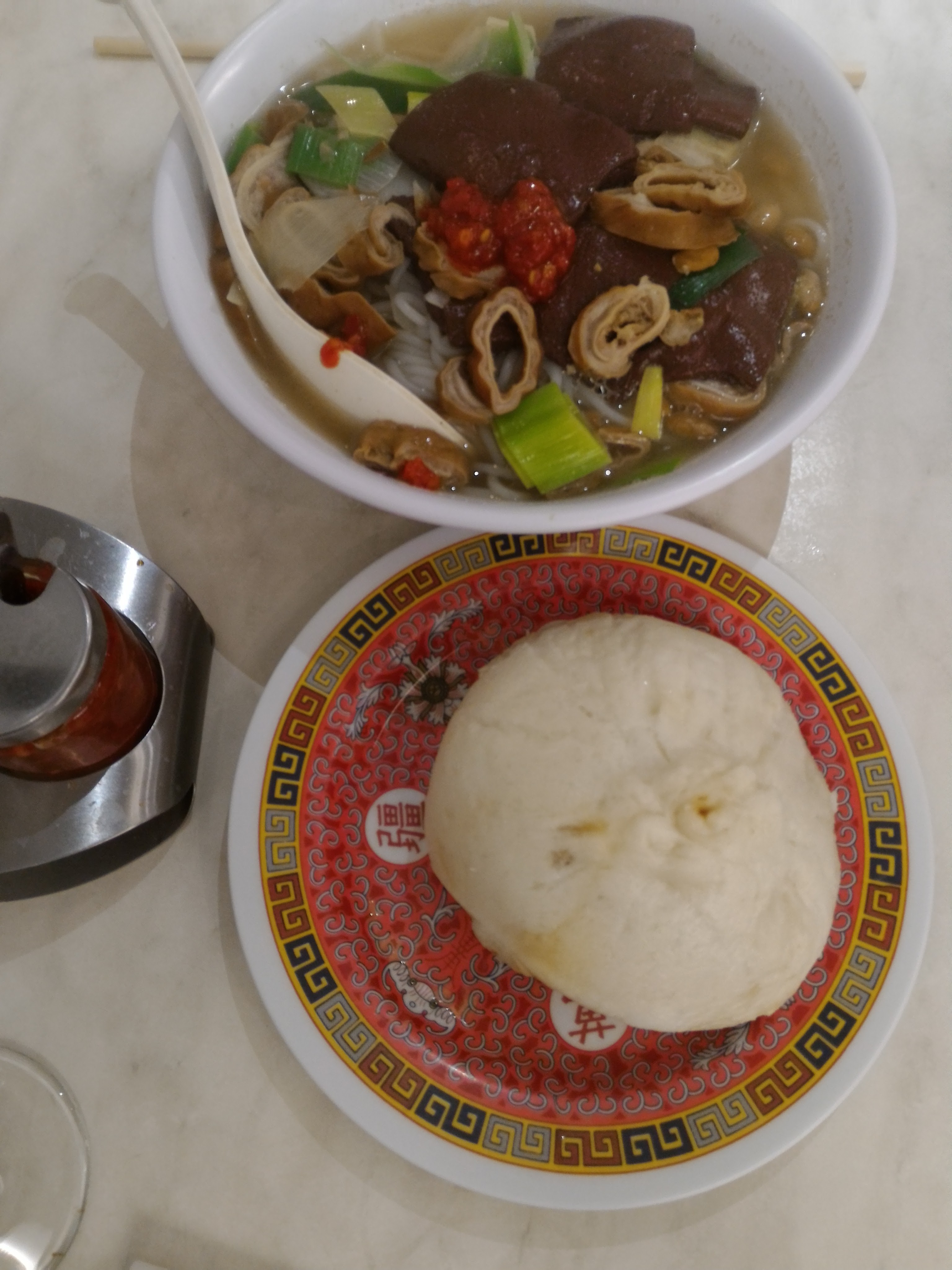 Brioche grillée très agréable. Dans celle à la vapeur, la farce est moins unie à la brioche. Très bien quand même. Les soupes sont bonnes, un peu salée. Le bouillon est rehaussé au vinaigre noir dans celle aux ravioli. Une variété traditionnelle de legumes, dont des liserons d'eau. Des tripes à la chinoise pour les amateurs.