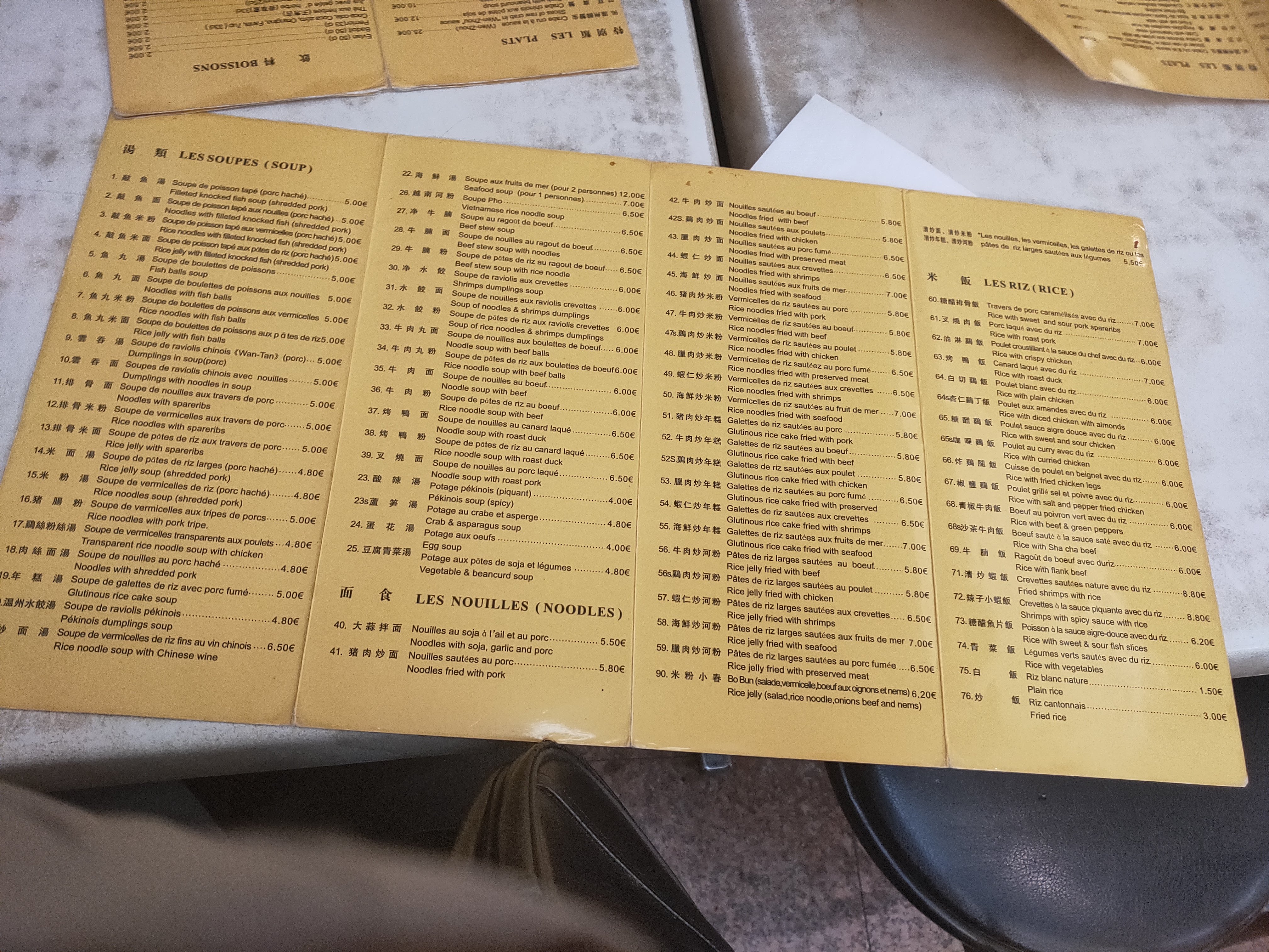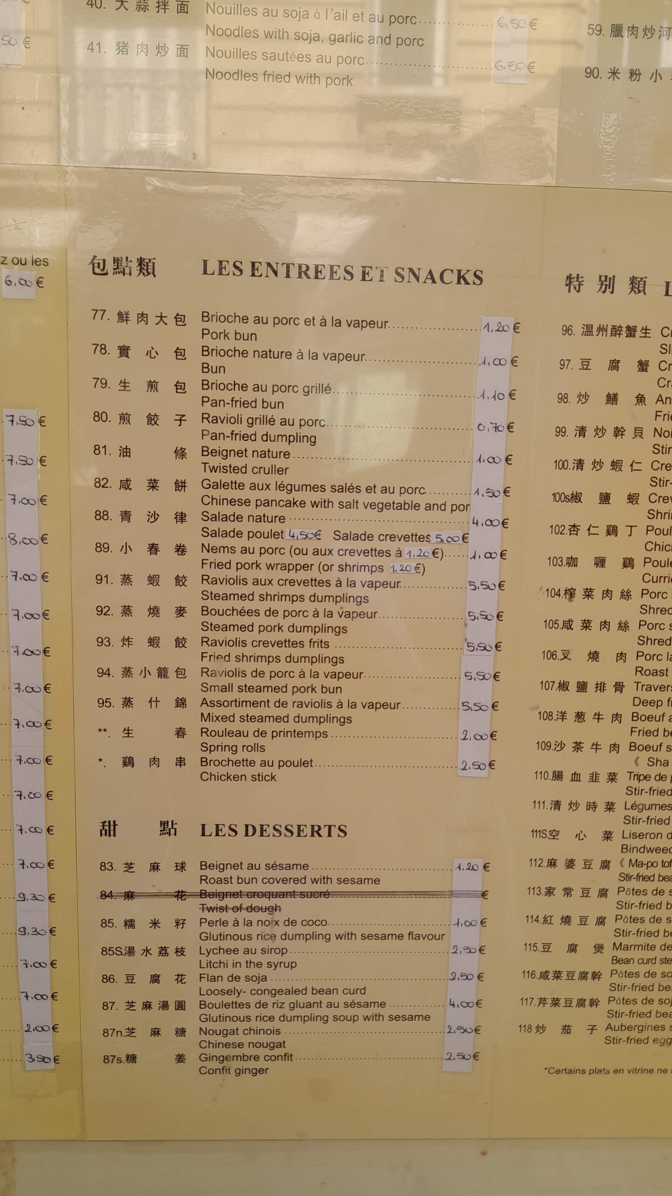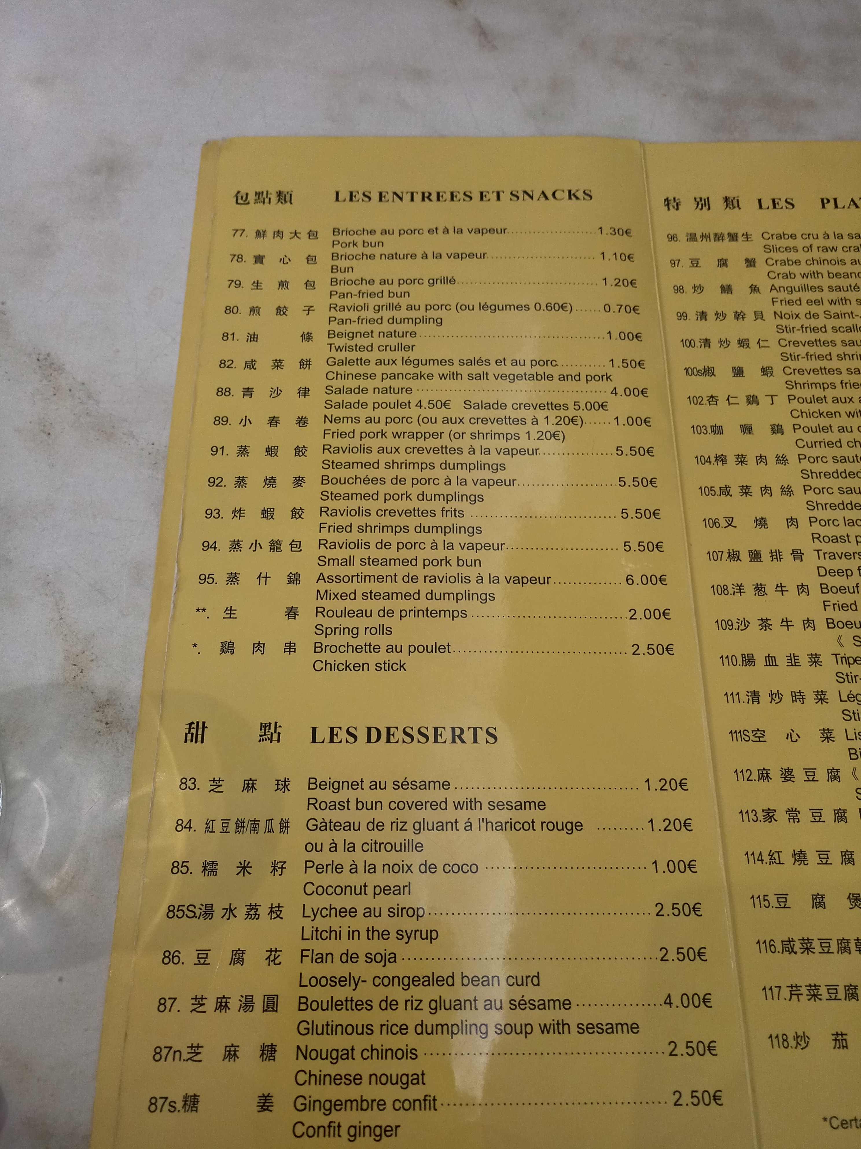 Une carte digne de la bible de la gastronomie chinoise ! Un service sympathique ! Des soupes bien préparés, des petites brioches très bonnes, des plats plus que corrects. Le rapport qualité prix est imbattable ! Cantine chinoise 100% validée et fréquentée par la diaspora.
