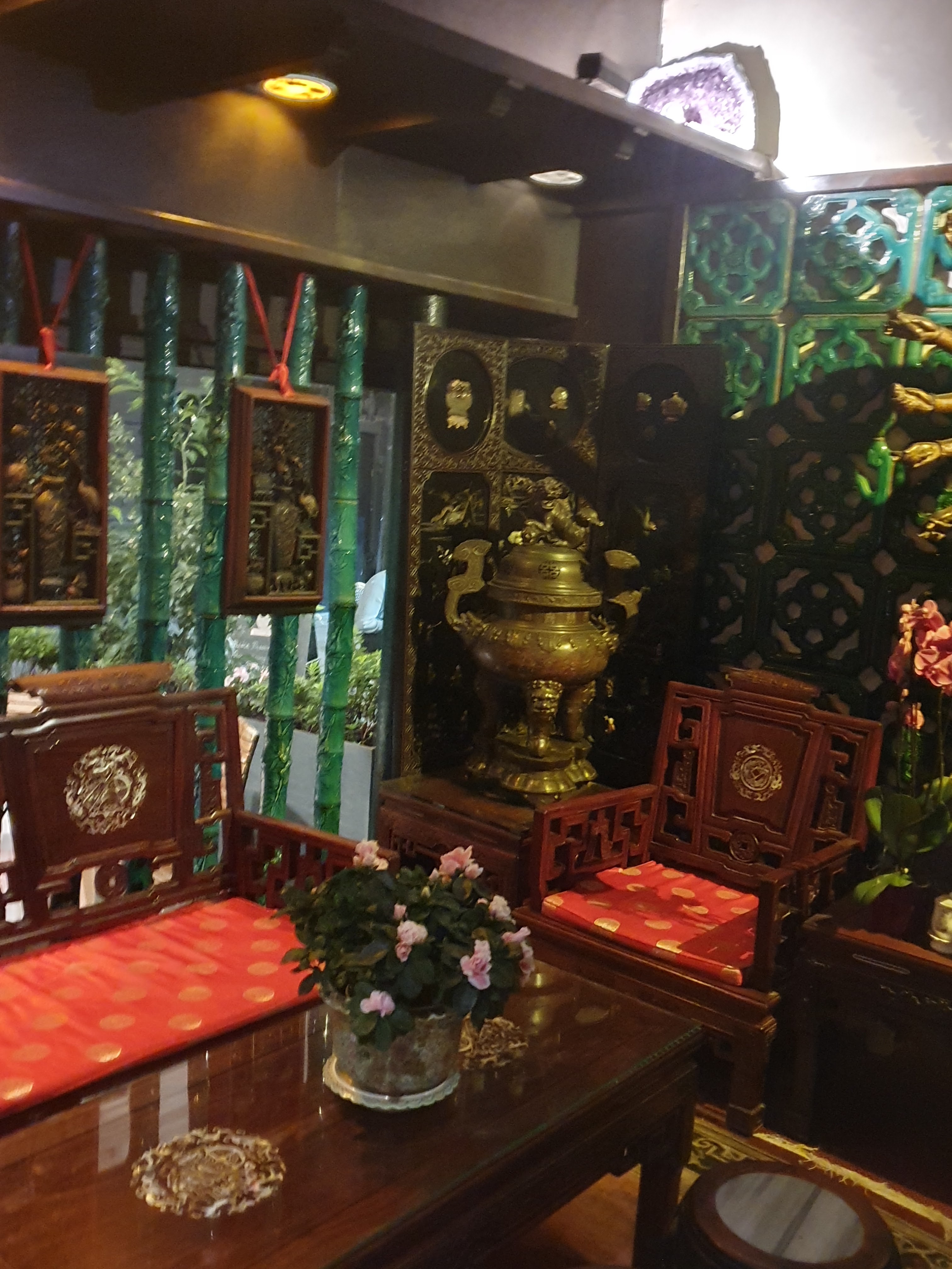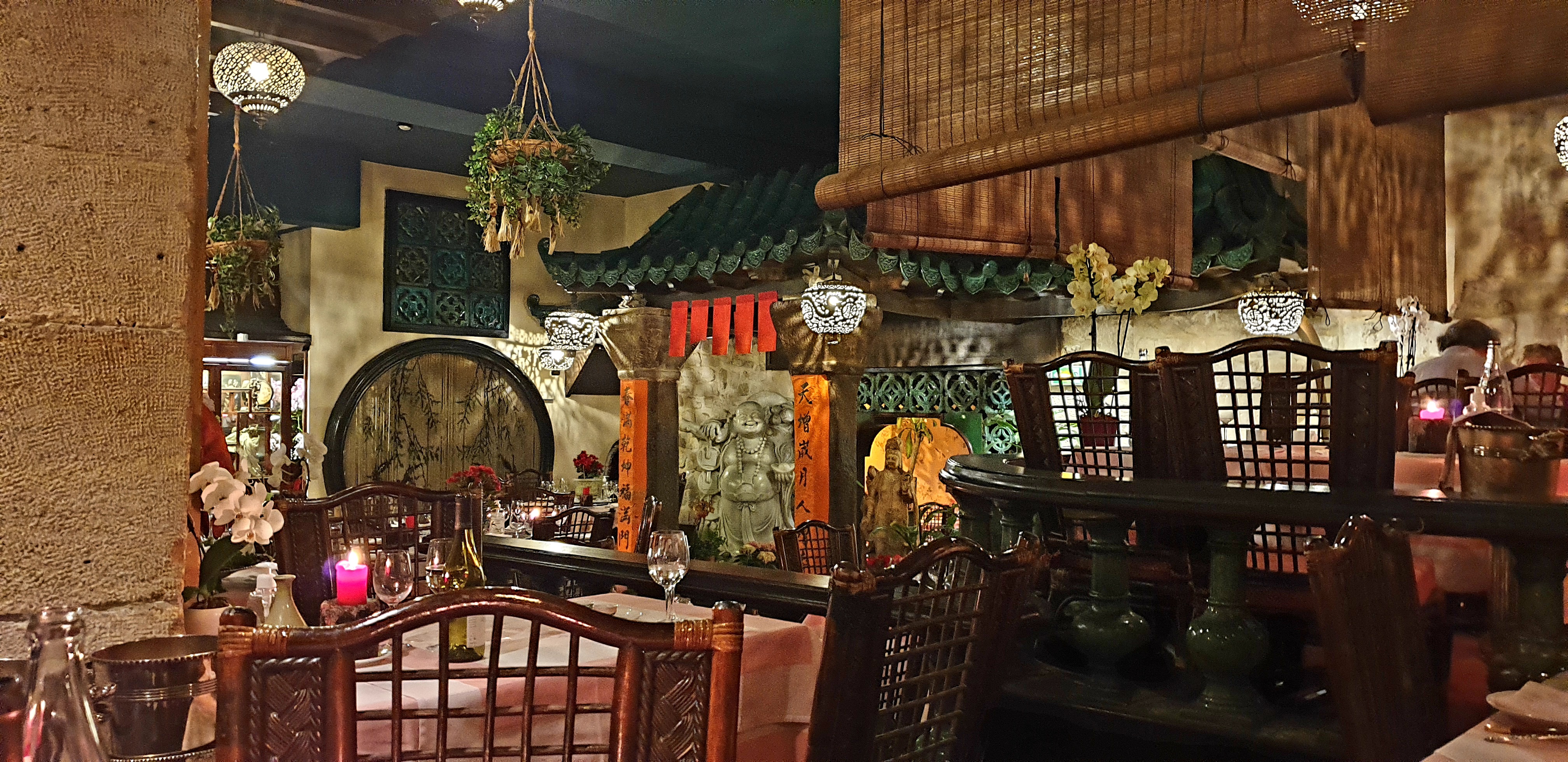 Quel étrange lieu ! Le décor totalement suranné est certainement le même, qu’à l’ouverture en 1980. Il y a plus de serveurs que de clients, l’encens est omniprésent, et continuellement, est diffusé une petite musique lancinante. Bref, une restitution désuète d’une atmosphère de Cochinchine, une expérience à faire, une fois seulement ! Concernant la nourriture c’est type DIEP donc pas mauvais mais ultra cher pour ce que c’est, on paye le service, le cadre et la localisation.