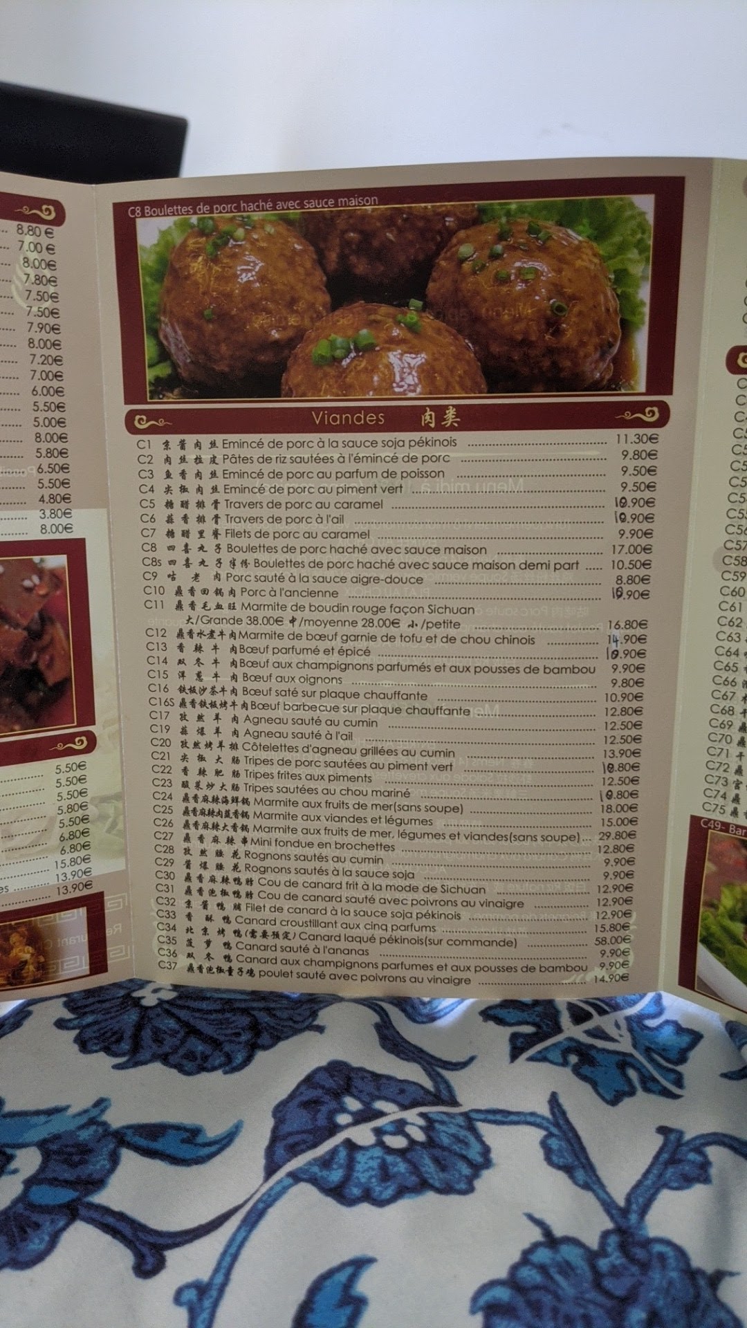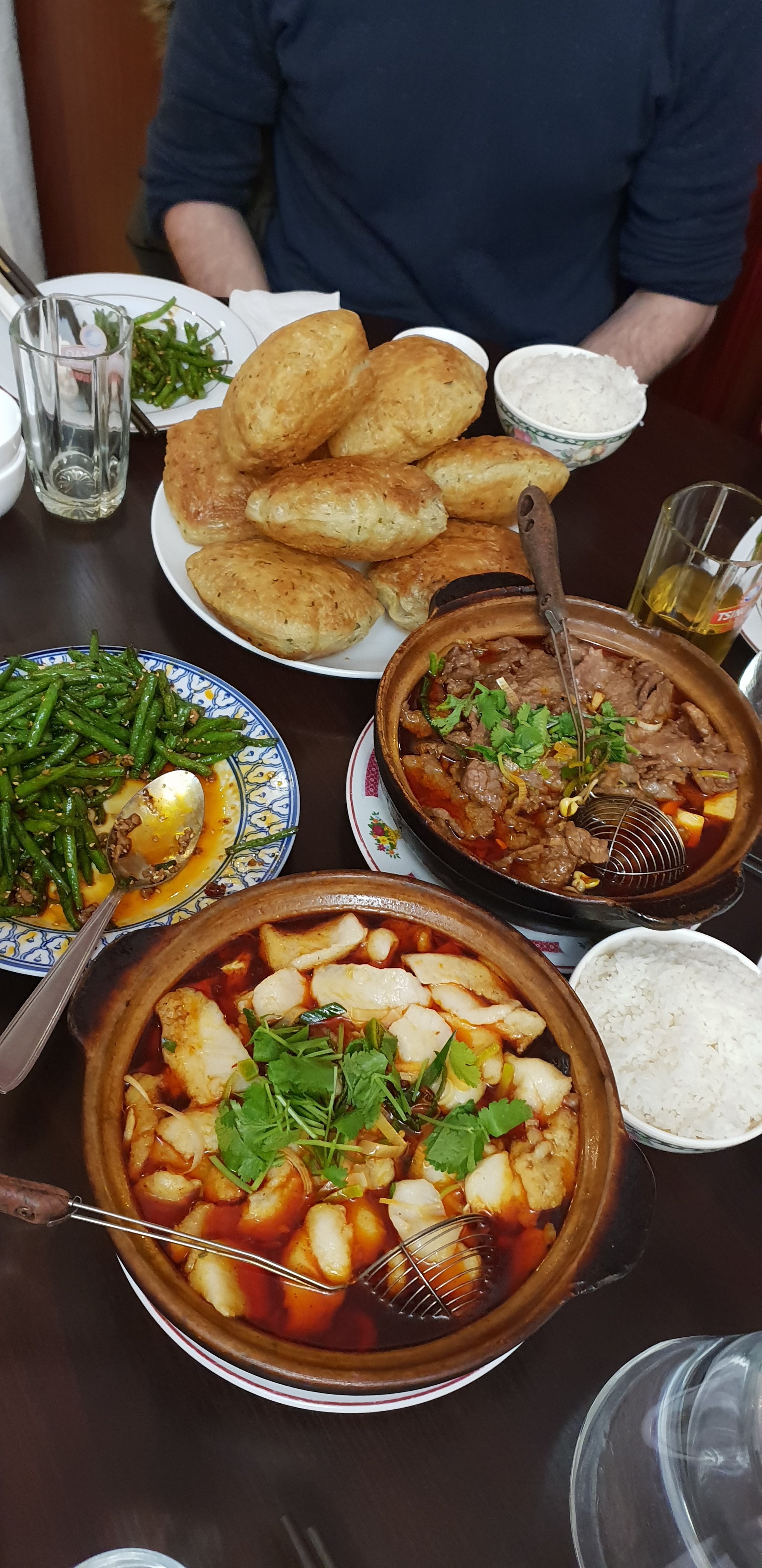Toujours aussi bon, table Ronde, raviolis bœuf, galettes de ciboulette, marmite de soupe pékinoise, aubergines frits, samoussas pour commencer en entrées... puis plats de poisson, poulet du chef, marmite de boeuf piquant, 2 nouilles sautées bœuf et poulet, côtelettes d'agneau, aubergines, haricots verts.