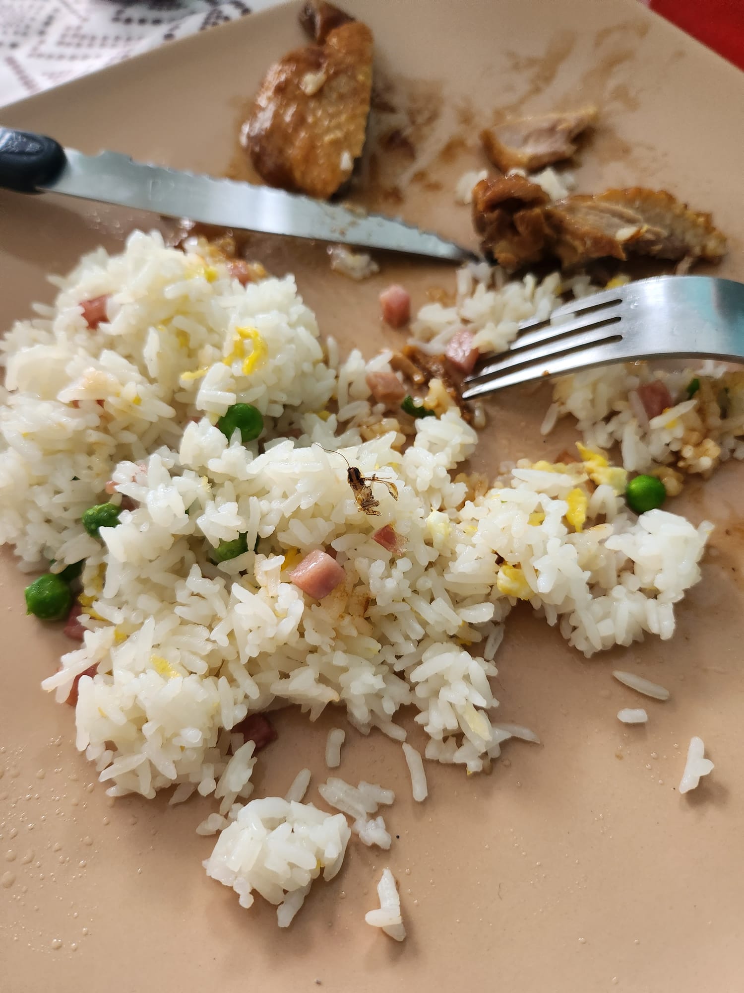 Les insectes sont ils dans la recette du riz cantonnais ? Nous avons eu la malheureuse expérience de trouver un insecte dans le riz cantonnais pris ce jour (cf photos). Alors que nous venions prendre de temps en temps à manger ici, c'est donc la dernière fois que nous venions. Il serait peut-être bon de revoir l'hygiène de l'établissement.