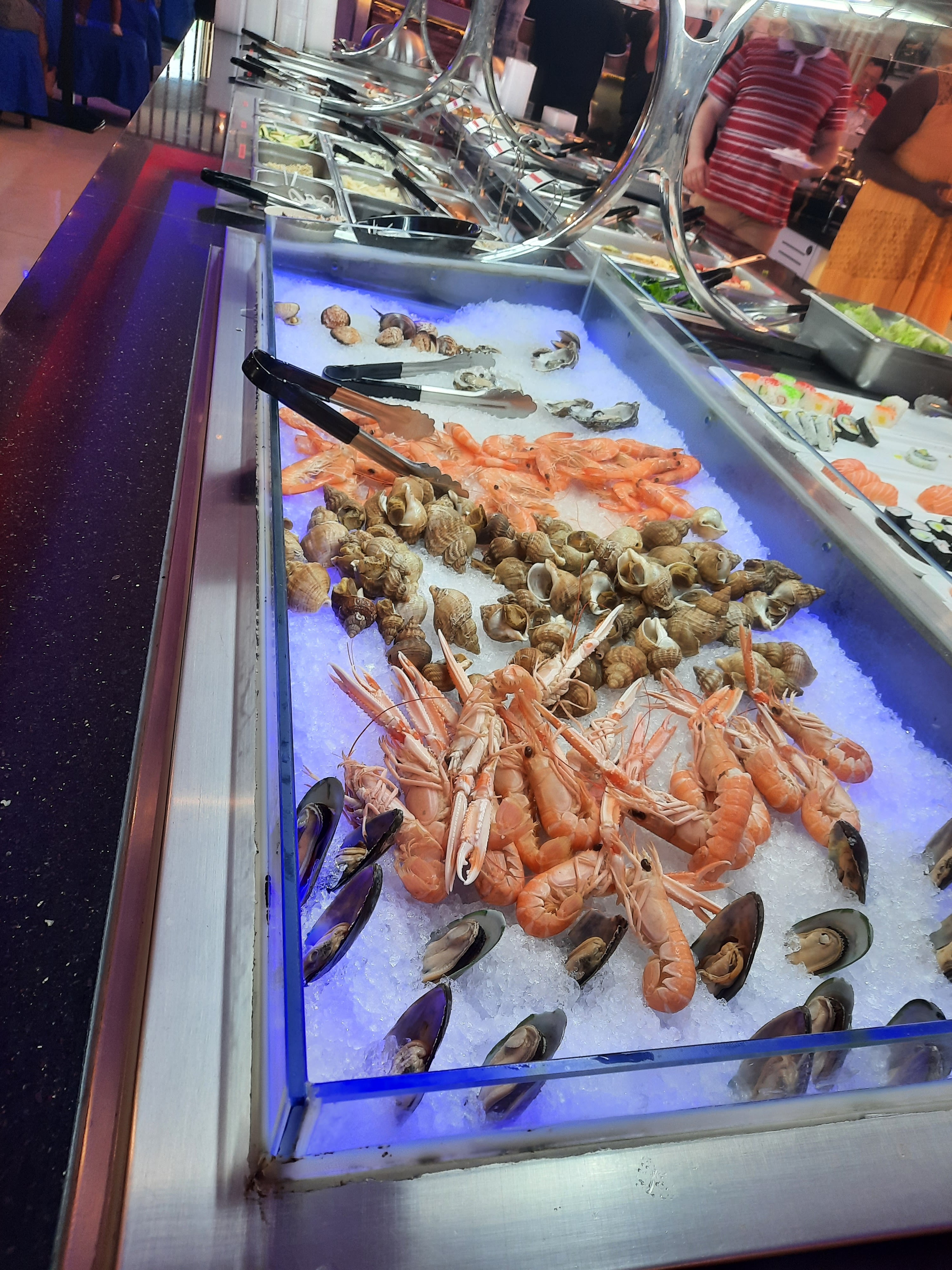 Buffet varié, bien présenté, propre..et c'est bon ! On peut y déguster des crevettes,vers huîtres, du saumon,vers langoustines,vers sushis, etc... Certe les fritures sont grasses, les sauces sucrées et salées, y a même des churos au chocolat au dessert. Palais trop délicats, passez votre chemin !