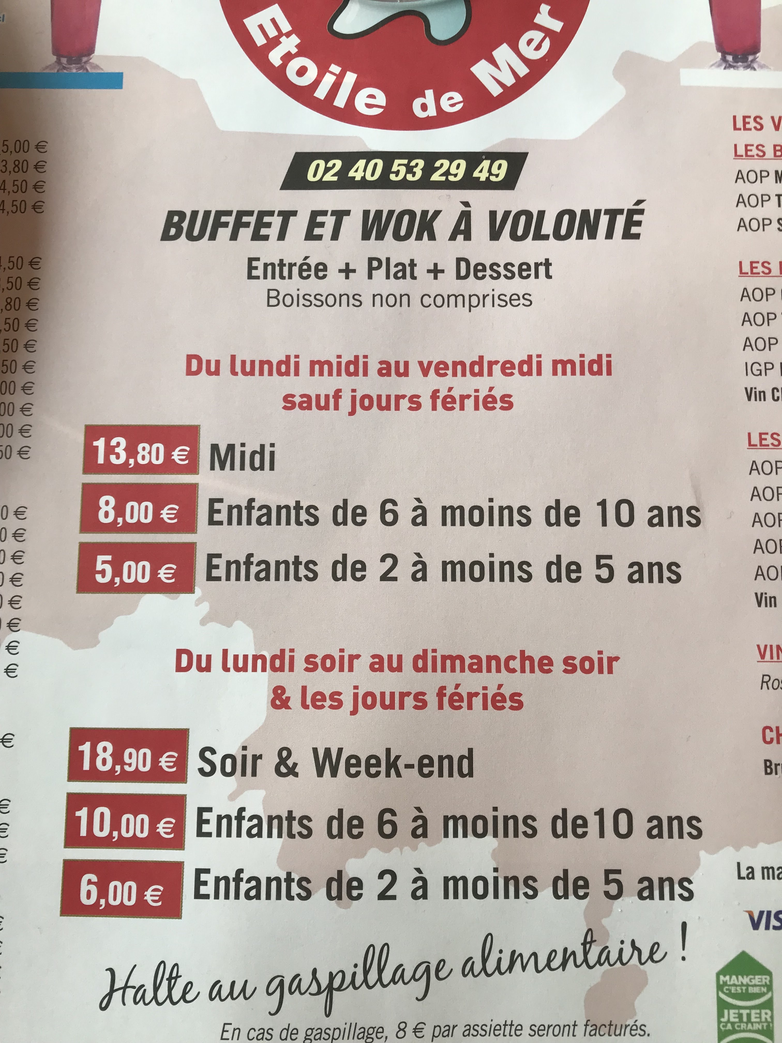 Le stationnement y est compliqué. C'est un restaurant bruyant et qui malheureusement manque de choix. L'accueil y est sommaire et votre assiette disparaît dès la dernière bouchée avalée... On s'y sent surveillé par le personnel et le buffet est mal ravitaillé. Non je préfère mille fois Le Royal de Pornic qui lui aussi est un restaurant chinois et en buffet à volonté mais où on vous fiche la paix et qui propose pour moins cher un large choix de plats allant de l'entrée au dessert. L'étoile de mer ne nous reverra plus.
