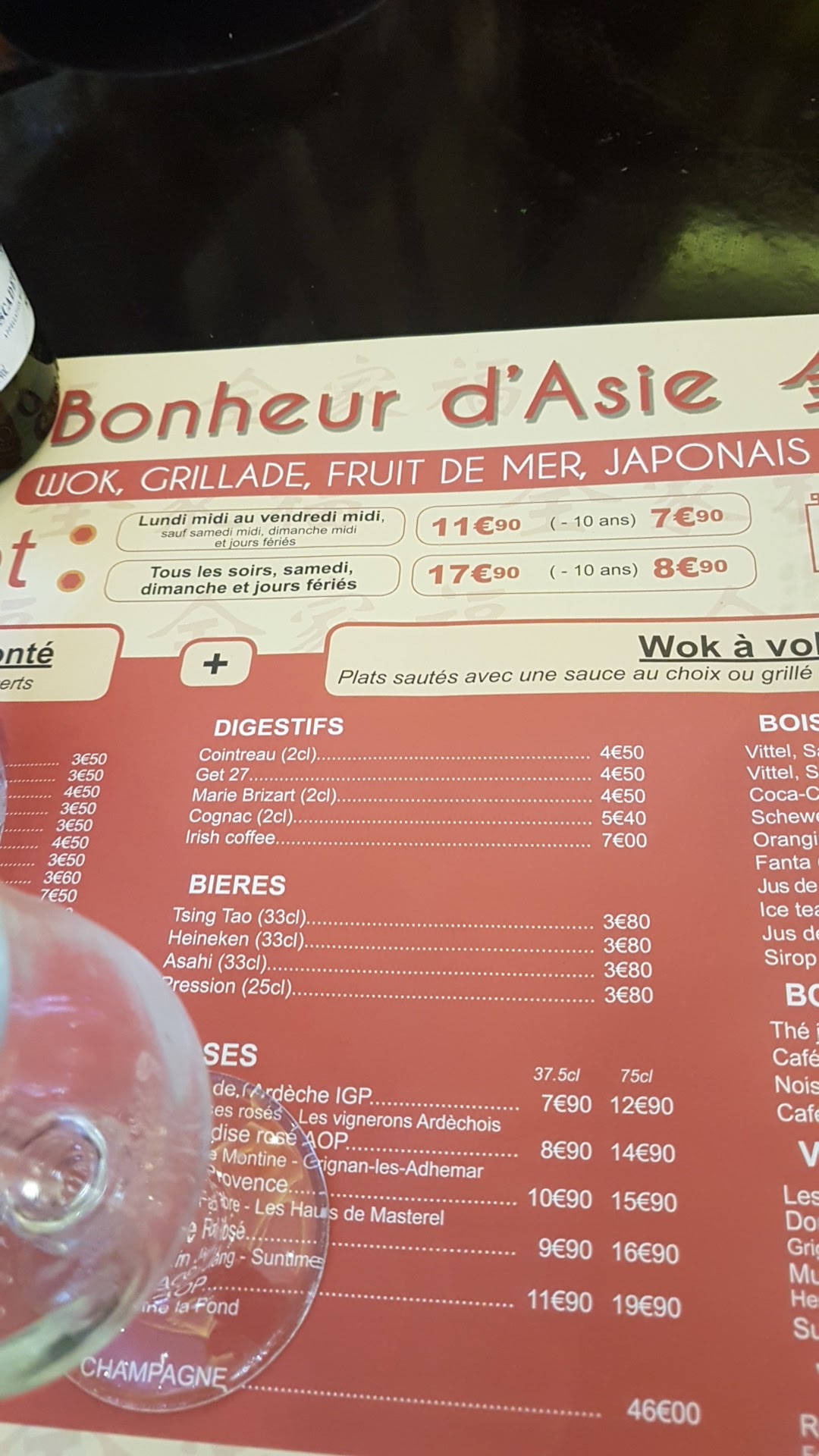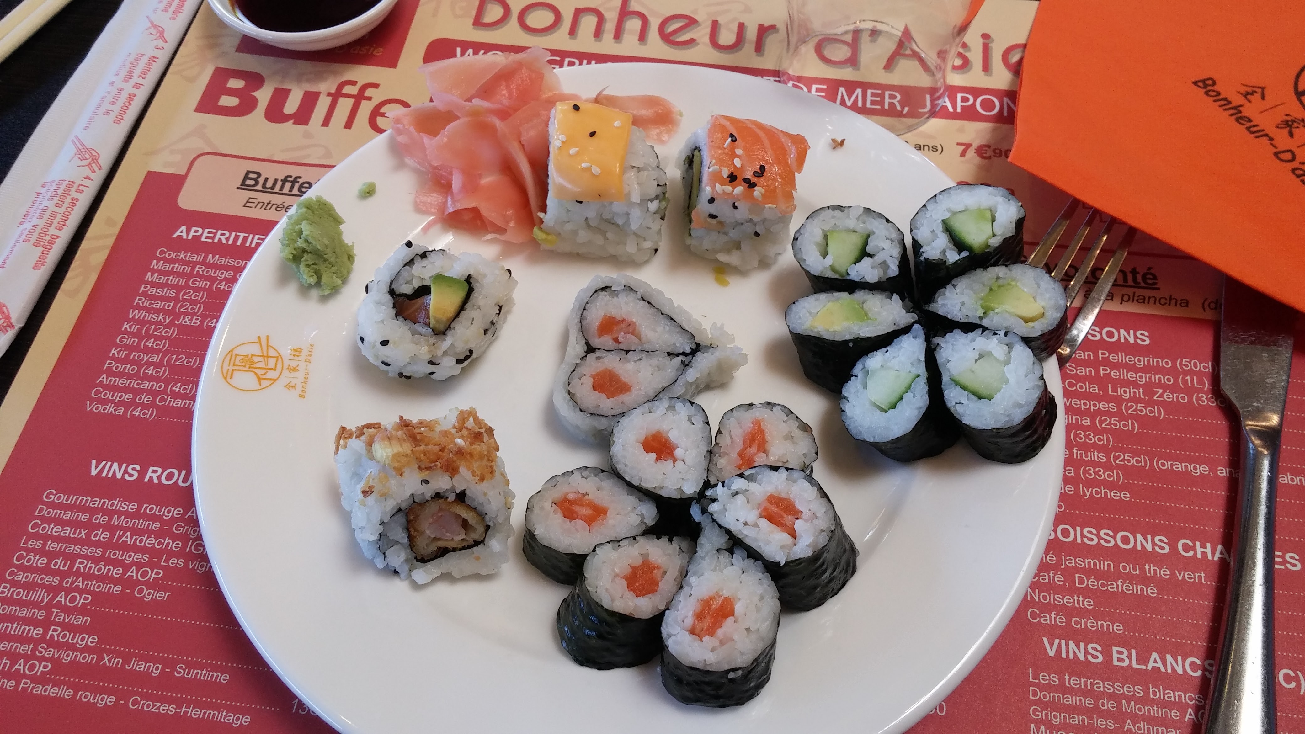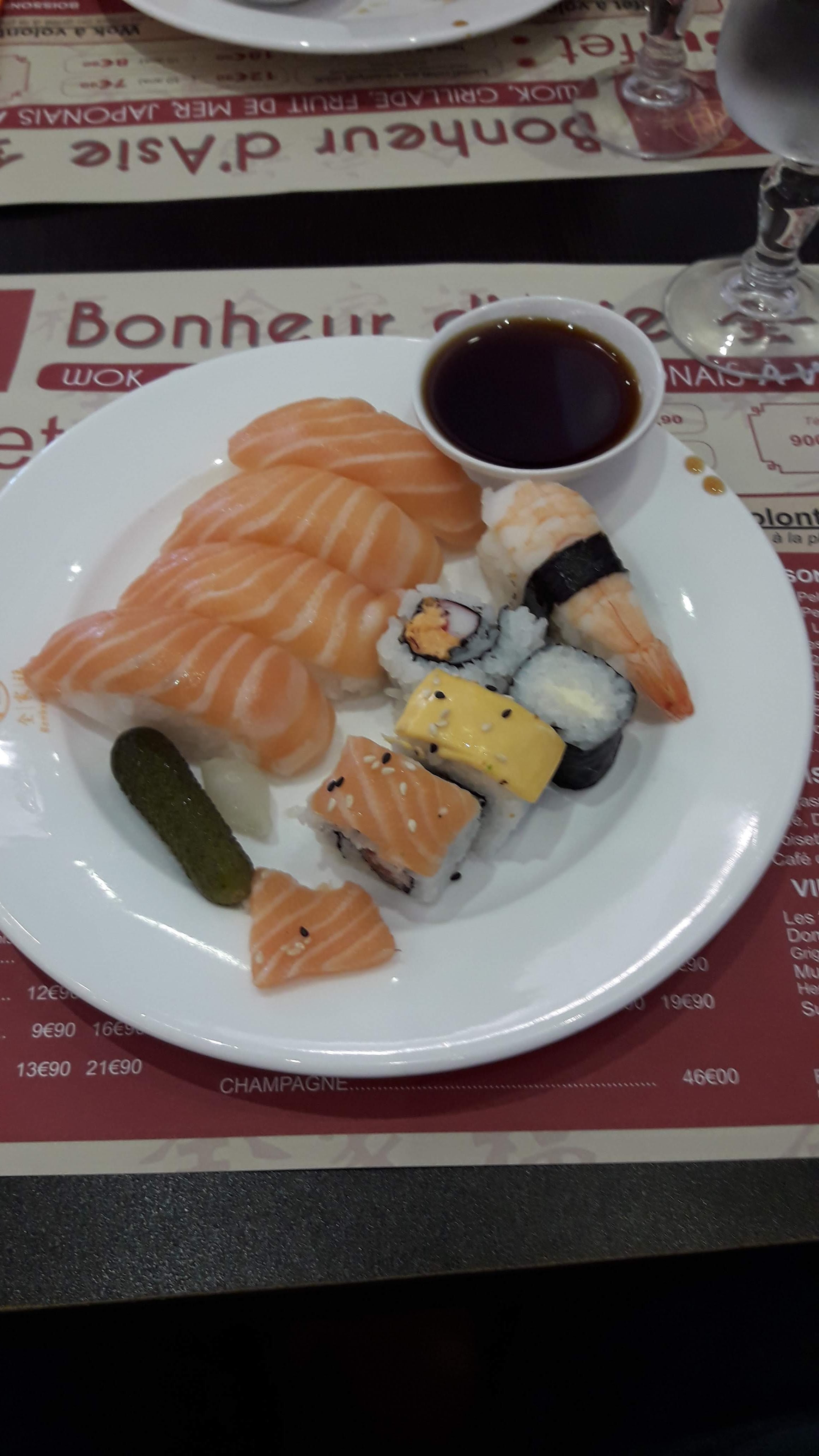 Large choix dans le buffet. C'est pas transcendant mais c'est correct. On ne pose pas de boîte de conserve sur une planche à découper qui plus est va servir pour les sushis. Mais quelle horreur!! Bravo bravo protocole haccp non respecté. Personnel pas aimable, on nous accueille même pas de bonjour on nous dit 'la bas' Et la dame qui encaisse aucune interaction avec vous. Rendement rendement. Ensuite les toilettes infectent. Et ça nous laisse imaginer l'état du reste de la cuisine. Ca se dégrade le bonheur d'Asie pas sûre de revenir de plus belle. Et 15€90 le midi.....