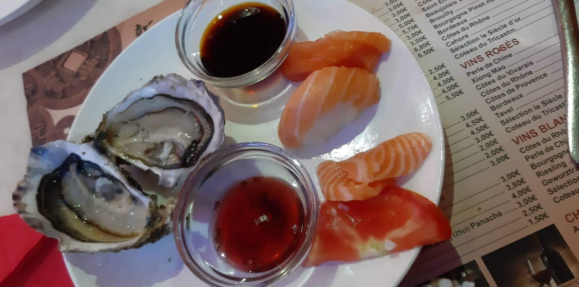 Restaurant pas terrible. Moi qui adore les huîtres, j en ai pris 3 et j en ai goûté une que j ai immédiatement recraché dans mon assiette, pas fraîches du tout c est bon pour attraper une intoxication alimentaire sans compter la gueule des bigorneaux. Ils se disent resto de fruits de mer. Si on enlève les fruits de mers il n y a plus vraiment le choix. J ai trouvé mieux comme restaurant chinois donc ici c était la première fois que j y allais et ce sera la dernière fois. Assez cher et pas bon.