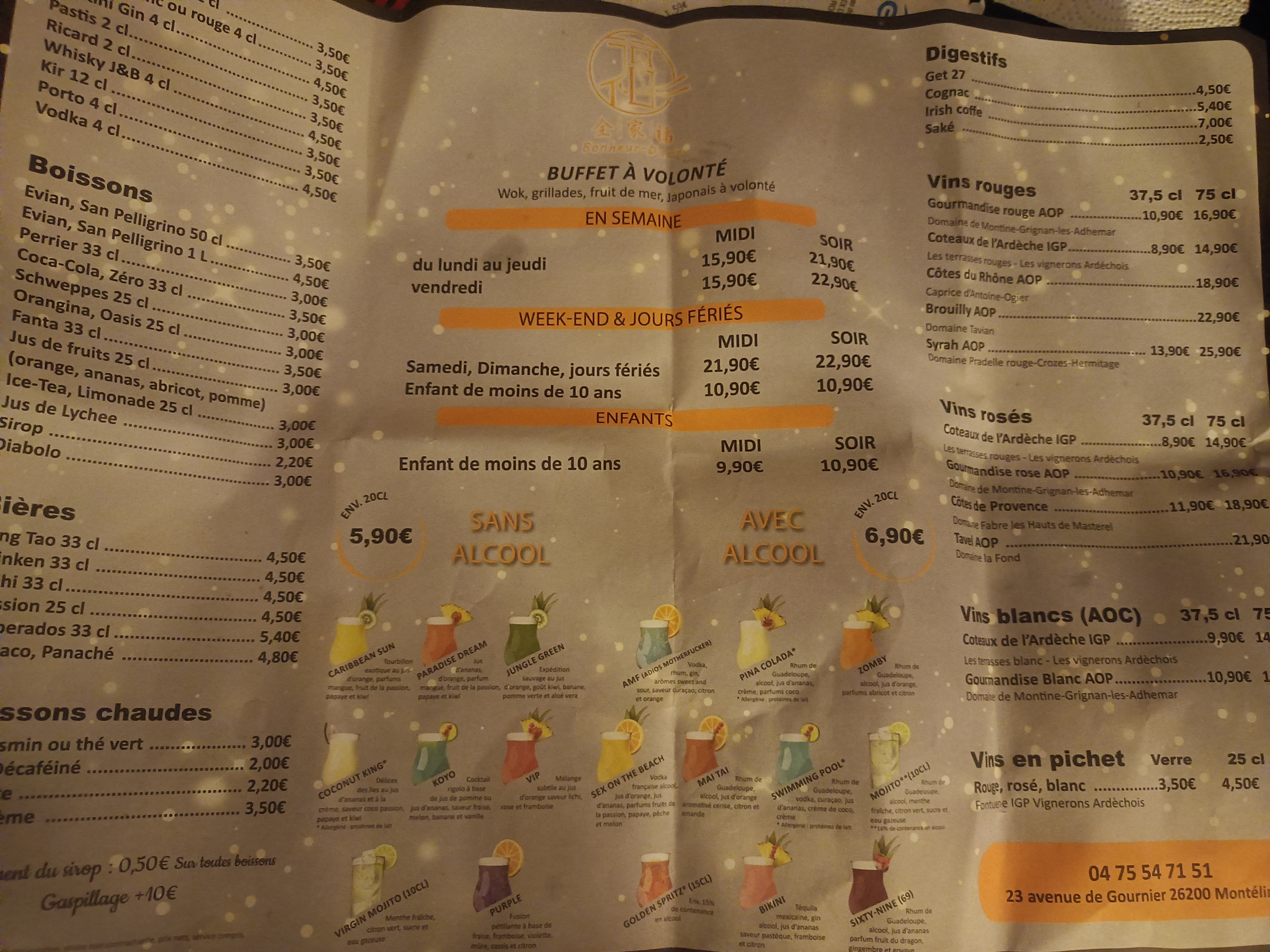 Je suis une habituée de ce lieu je n'y étais pas retourné depuis quelques mois malheureusement je trouve que la qualité a changé et que cela se dégrader alors que les prix ont augmenté ça reste malgré tout un buffet très varié où l'on trouve de tout.... attention vraiment à ne pas trop baisser en qualité comme certains autres buffets sur Montélimar