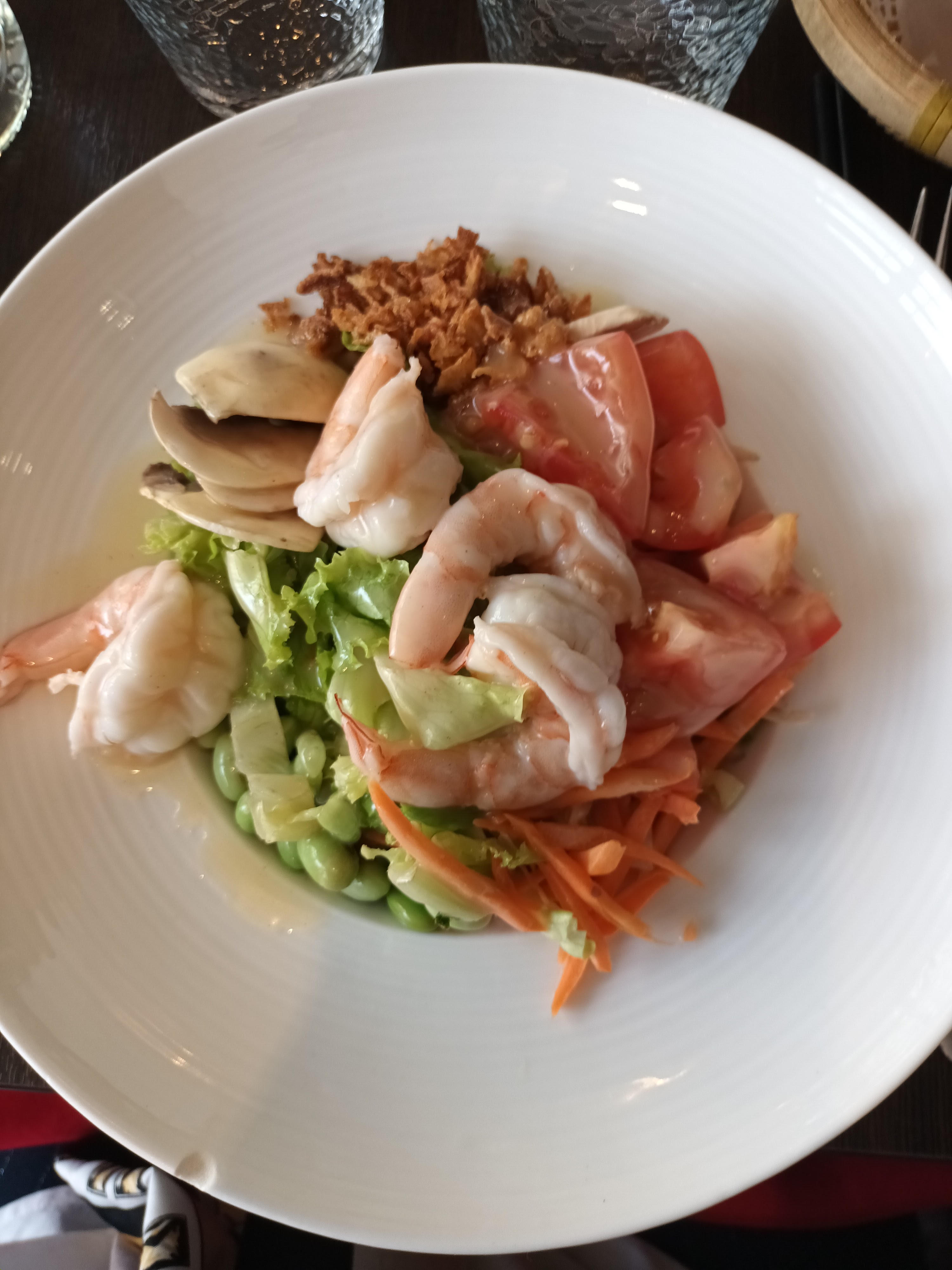 Bon accueil. Plats copieux mais malheureusement il baigne dans la sauce. Raviolli vapeur du type industriel. Salade aux crevettes composée de morceau de tomate, poivron, un tout petit peu de carrote, un peu de soja, beacoup de salade verte 4 petite crevette et énormement de sauce. Pas super 😩