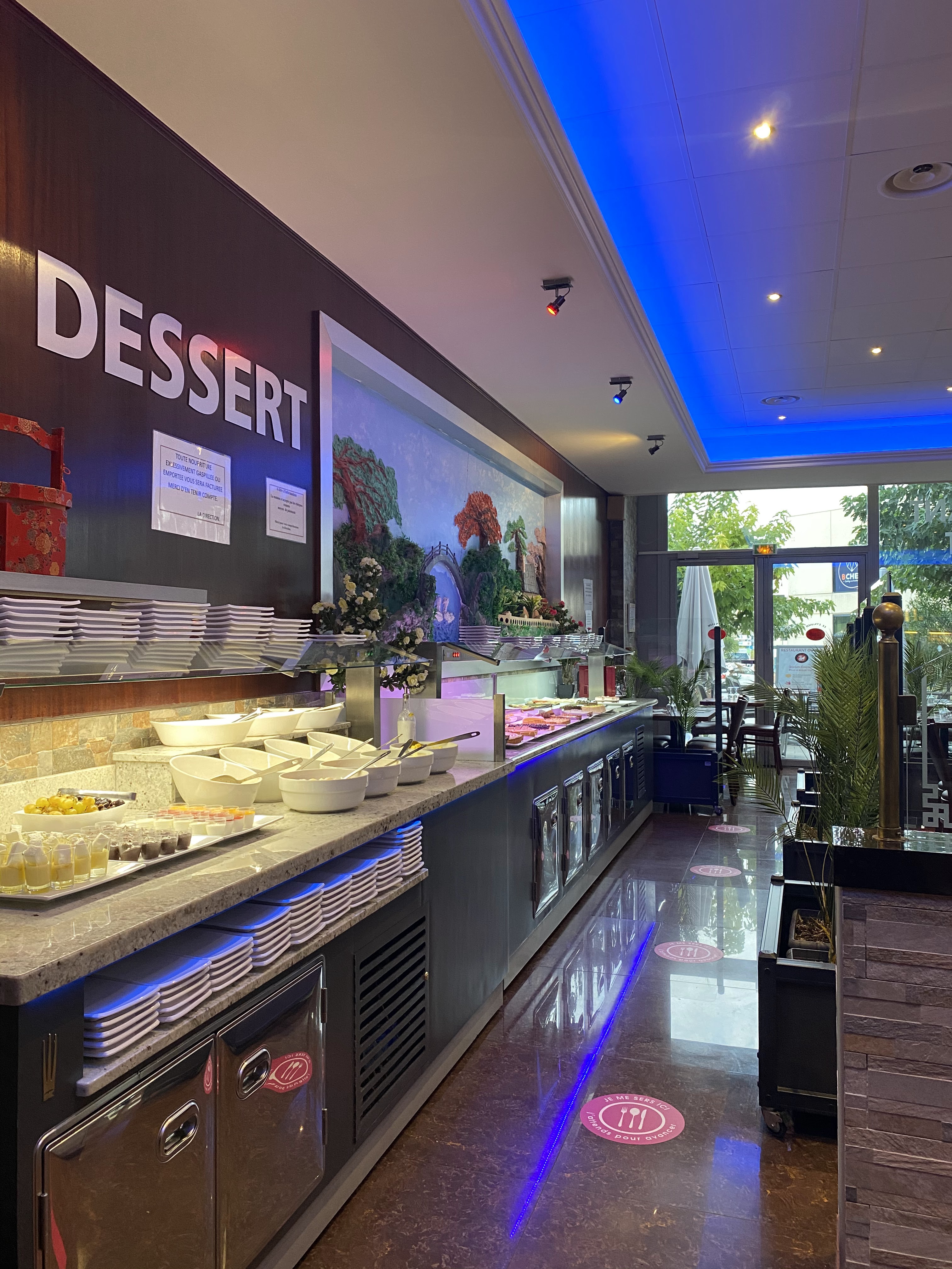 Nous sommes arrivées un samedi soir à 20h55, nous avons dû payer en arrivant puis on nous a attribué une table, restaurant bondé mais pile lorsque nous sommes arrivés plusieurs tables ce sont libérées : de plus grand ouvert sur l'extérieur car il faisait bon ce qui aère la salle c'est très appréciable : -en entrée :sushis, salades, fritures, raviolis vapeurs ainsi que plein d'autres choix mais je vous donne ce que j'ai goûté, -en plat idem des nouilles, du riz cantonnais ou blanc, avec poulet champignons noirs, porc caramel, canard laqué, bœuf loc lac ou saté, brochettes de poulet, crevettes, il y a une partie grillades où une personne fait cuire devant vous mais je n' ai pas goûté cette cuisson, -les desserts, une ribambelle de choix au chocolat, aux fruits, macarons, cheesecake fraise, verrines, des bonbons, des glaces et du café 👌 ! Nous avons réglé 22€ le menu à volonté entrée +plat+ dessert +café, nous nous sommes régalées ! Nous reviendrons entre amies ainsi qu'en famille, cela faisait plus d'une dizaine d'années que je n'étais pas revenue et vous avez été à la hauteur de mes attentes, félicitations, à bientôt, bonne continuation à toute l'équipe !
