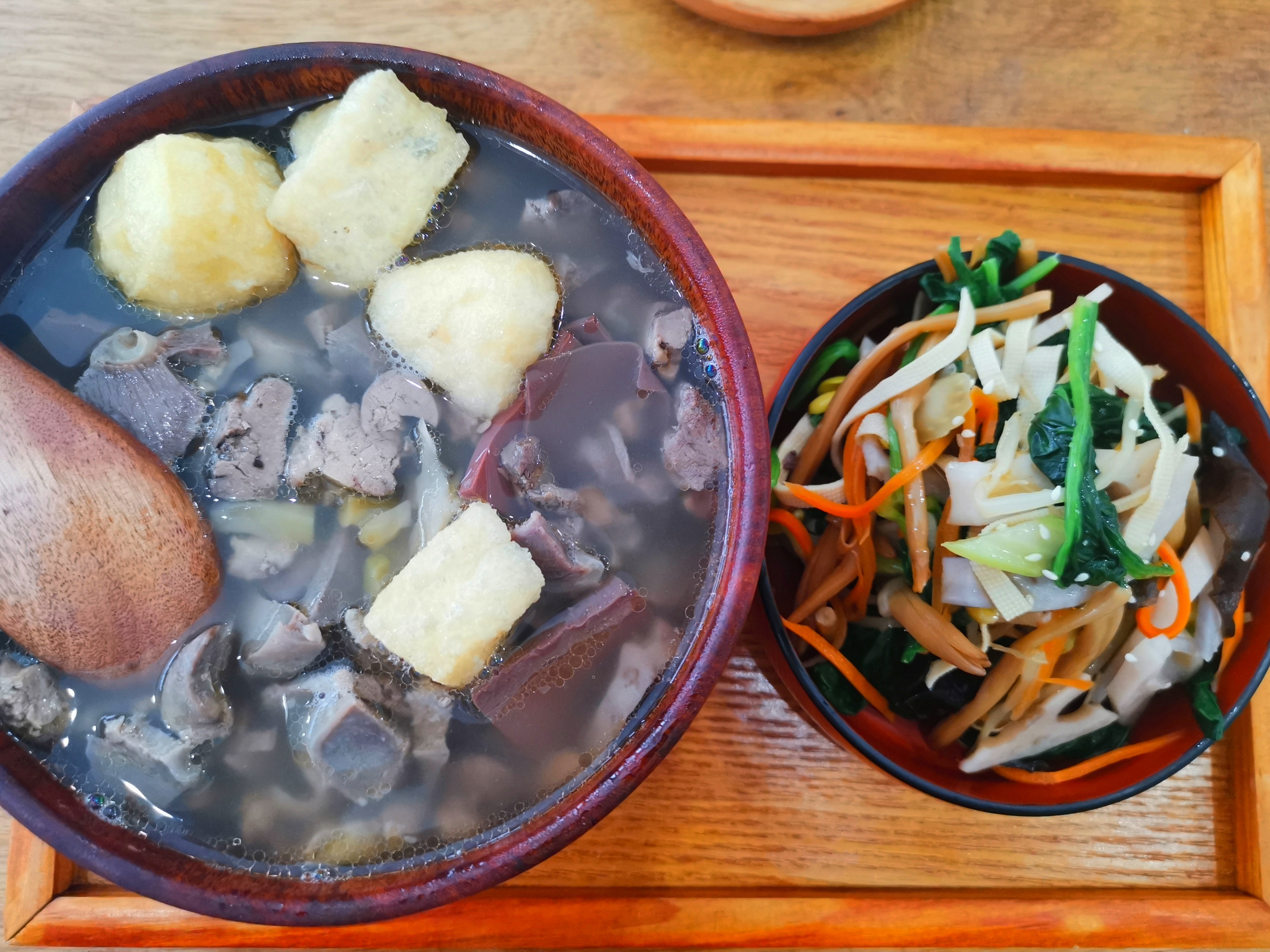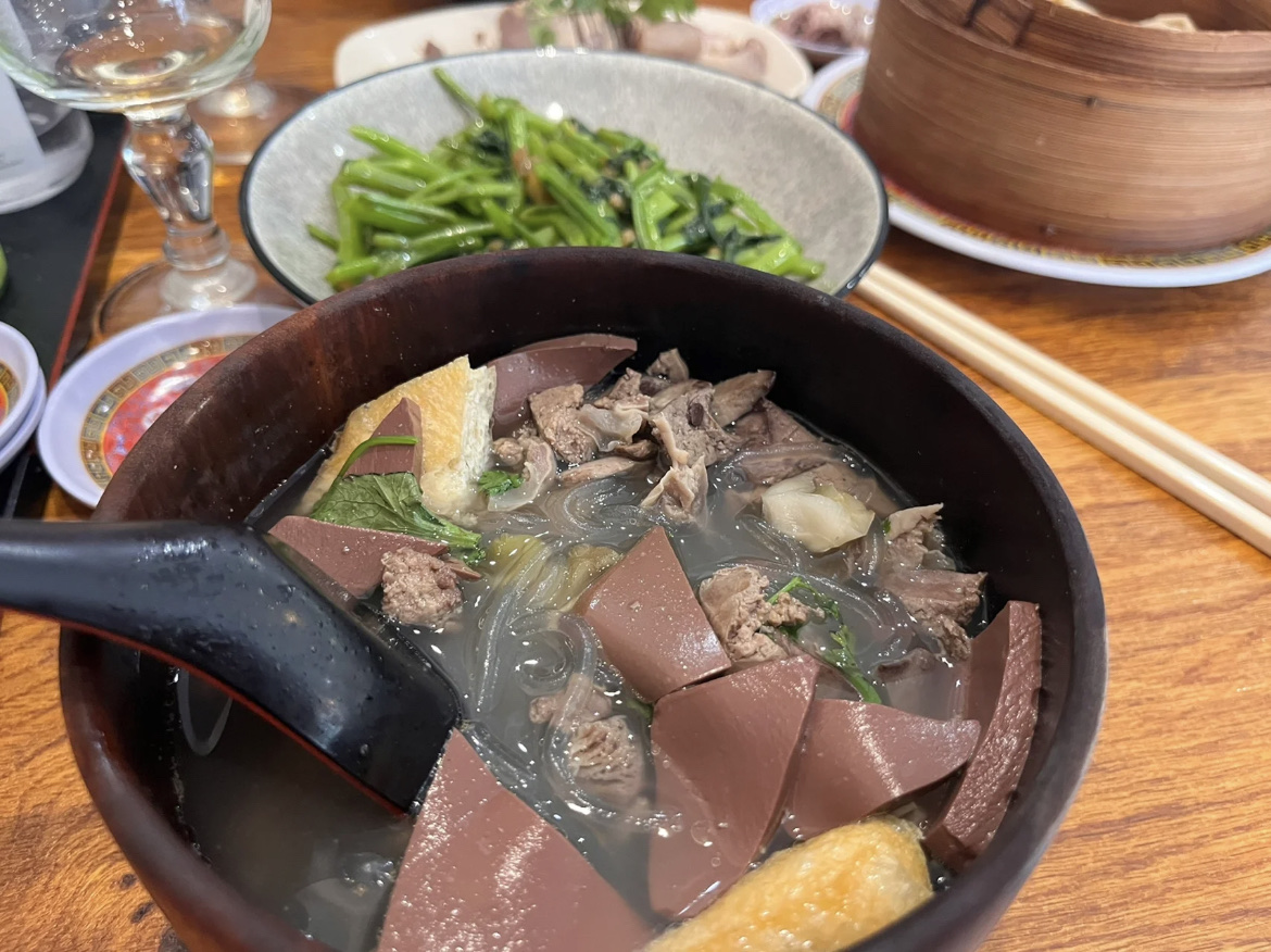 La soupe de vermicelles au sang de canard et les boulettes de soupe aux œufs de crabe sont toutes deux délicieuses et une bouchée est très satisfaisante.