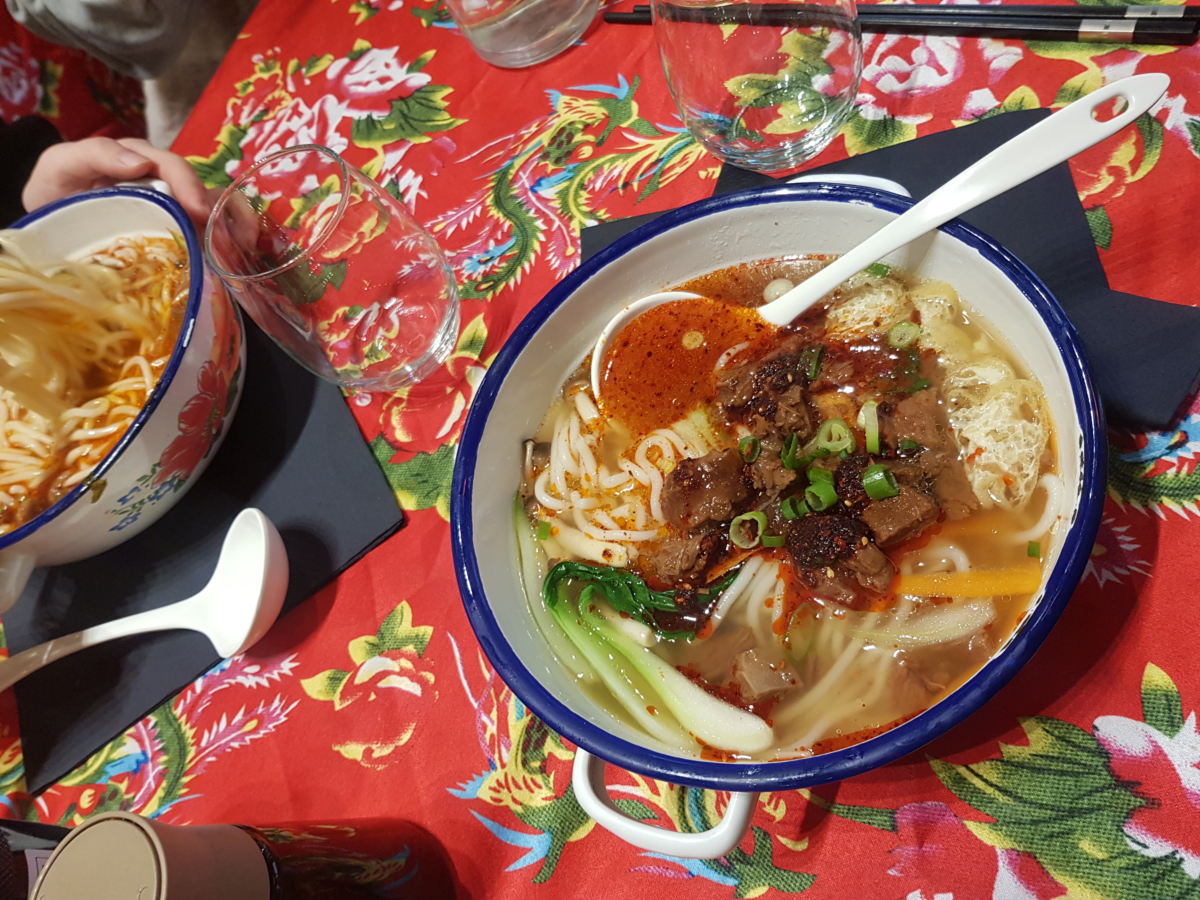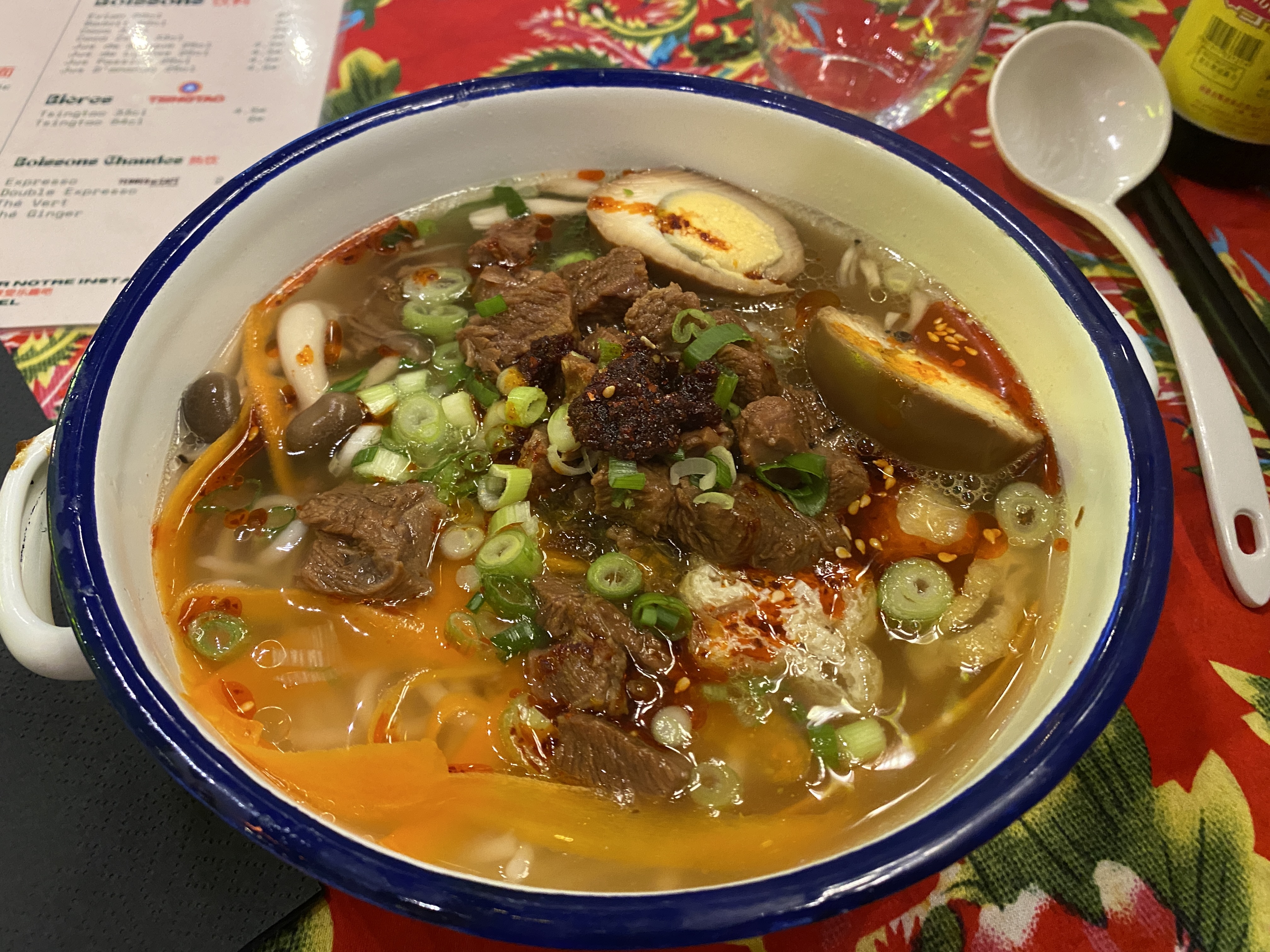 Petit restaurant avec des nappes rouges. Une salle, une soupe, deux personnes qui travaillent. Nous y sommes retrouvées par hasard. On voulait manger une soupe vu qu’il faisait froid. On choisit le niveau de piquant de la soupe, de 0 à 6. Nous avions choisi 1 et 2 et c’était suffisamment piquant. La soupe était bonne et copieuse avec des morceaux de viande de boeuf, des nouilles. La décoration est minimaliste, quelques tables avec des nappes rouges style chinois. Sur un des murs des bouteilles de bières. Nous voyons la cuisine ouverte. Si vous ne voulez pas vous prendre la tête pour choisir et vous aimez les soupes du type ramen, le restaurant vous plaira. Nous avions demandé un supplément bouillon et on nous a rajouté gratuitement. Bonne adresse, je recommande.
