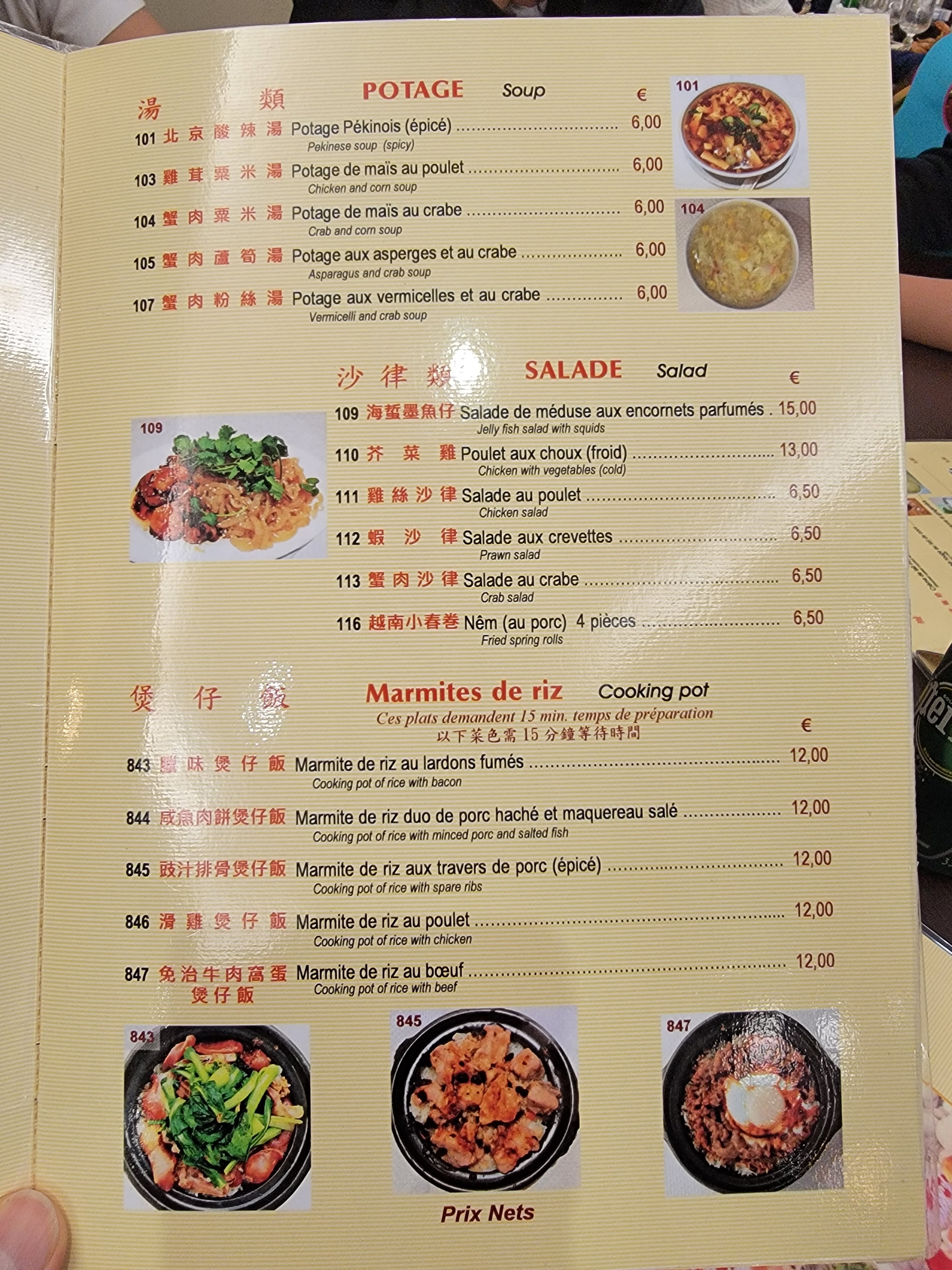 Une cantine cantonaise authentique (un peu bruyante du coup !) qui permet de bien manger à petit prix. Vous y trouverez une carte avec un choix très important : soupe de nouilles aux raviolis de crevette, poulet à la vapeur, canard laqué, pâtes de riz sautés, etc... Certains plats pas présents sur la carte sont également inscrits sur des affichettes rouge sur les murs mais en chinois !