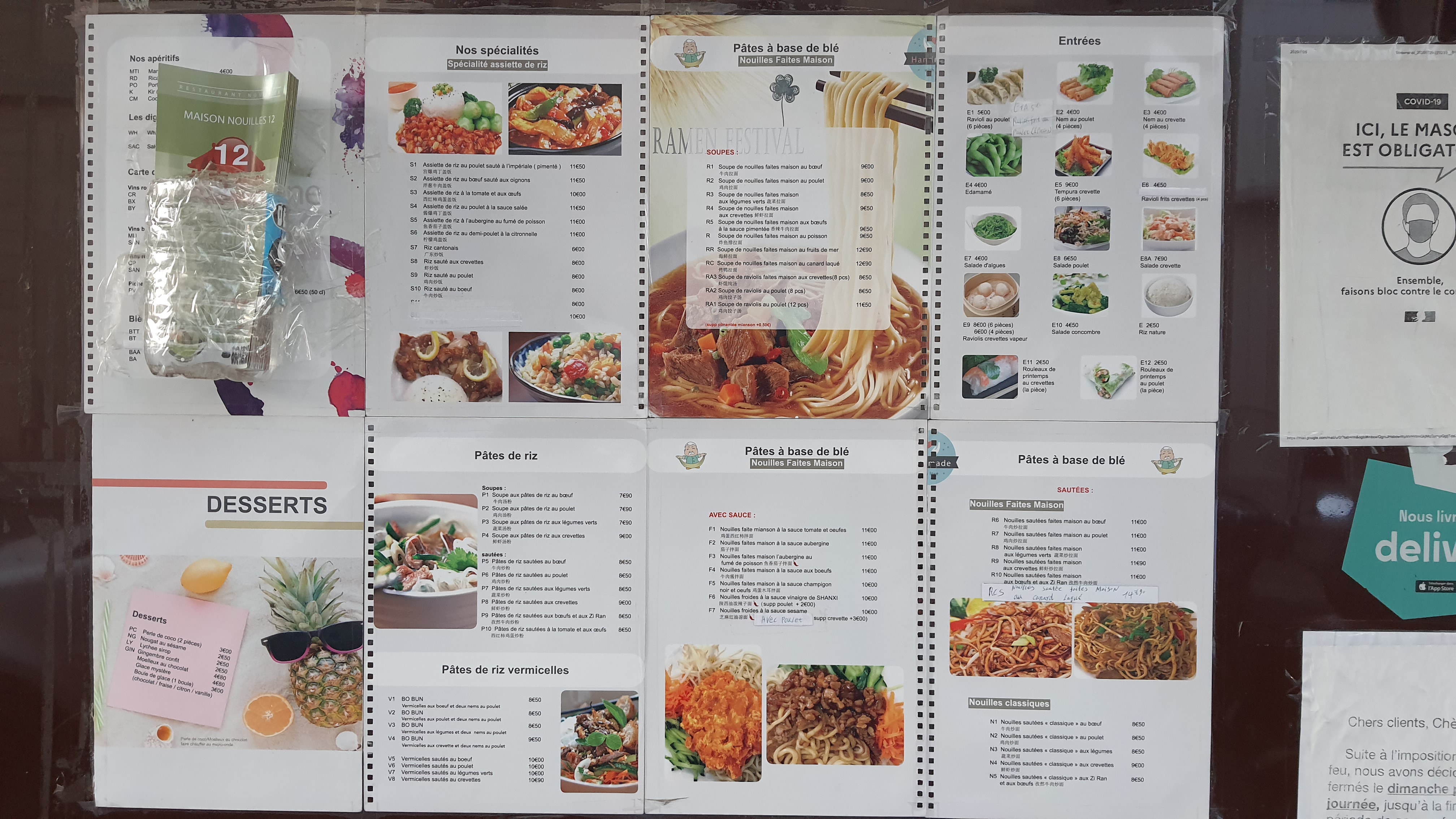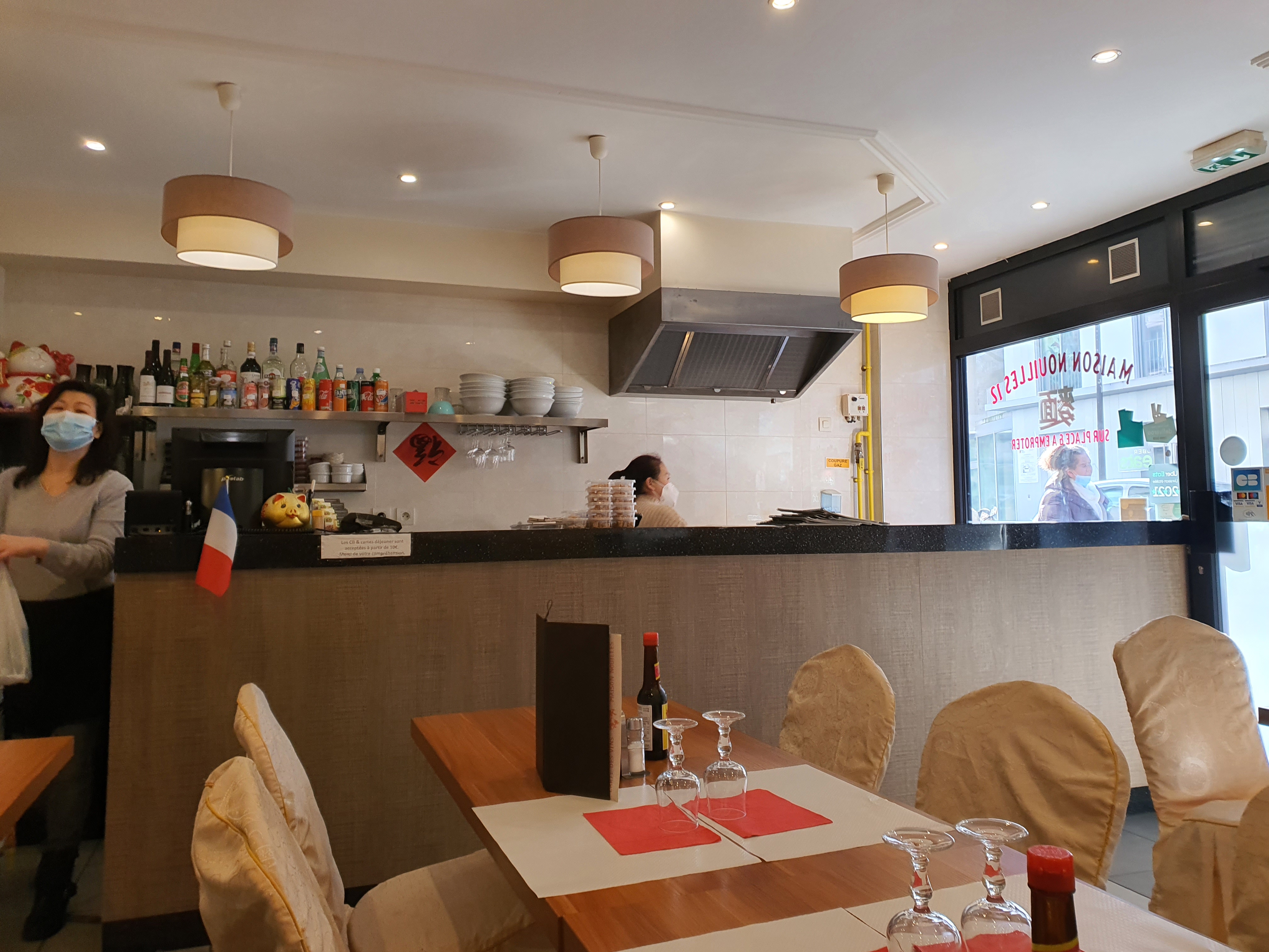 Servis ce soir sur la mini-terrasse (déconfinement). Plats arrivés très rapidement, soupe de nouilles au canard laqué goûteuse, nems croustillants, pâtes maison. Je recommande aussi les nouilles froides au vinaigre (supplément poulet ou crevettes possible) - j'avais testé il y a plus d'un an, c'est un bon souvenir. Tarifs très raisonnables (8 à 12€ le plat principal), portions généreuses, et le cuisinier et la dame sont souriants et aimables, ce qui ne gâche rien. J'y retournerai avec plaisir !