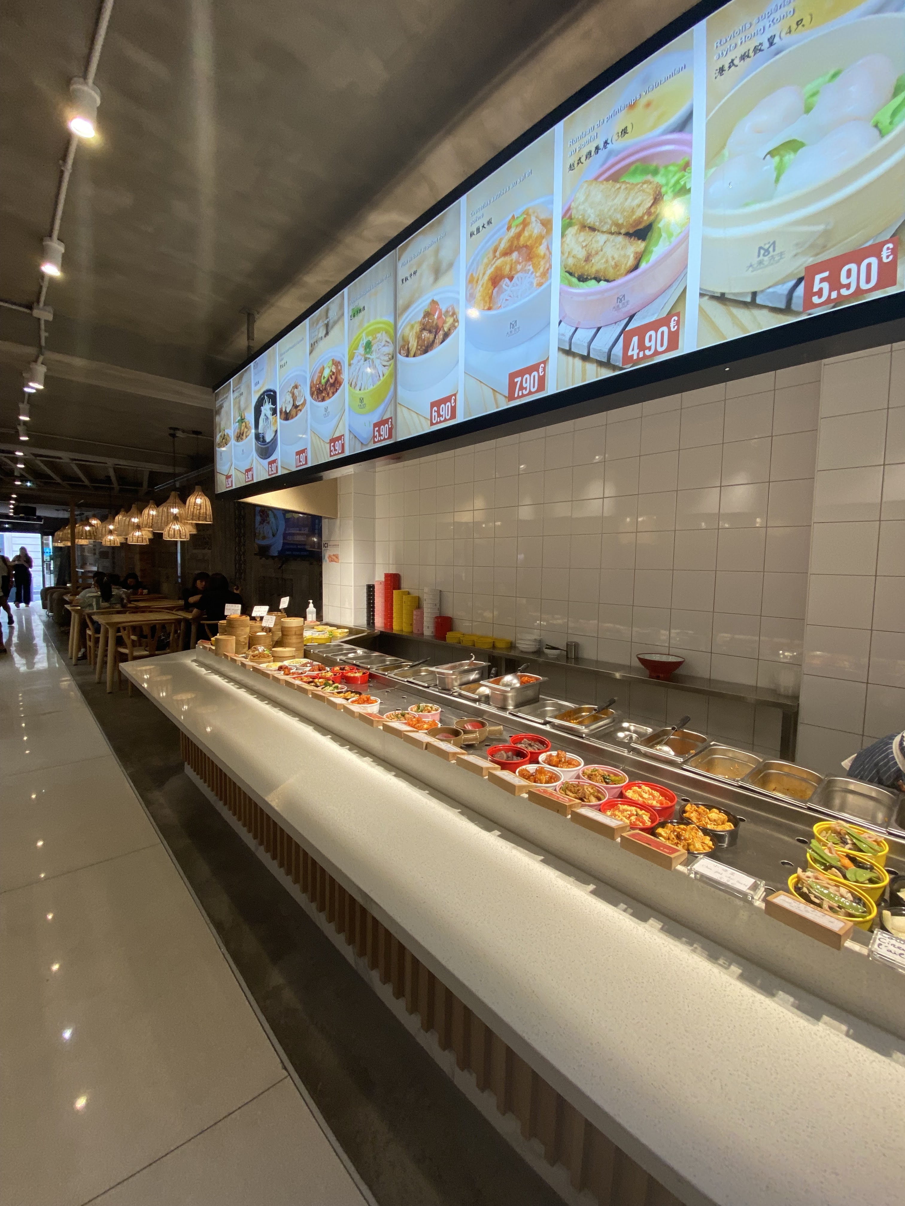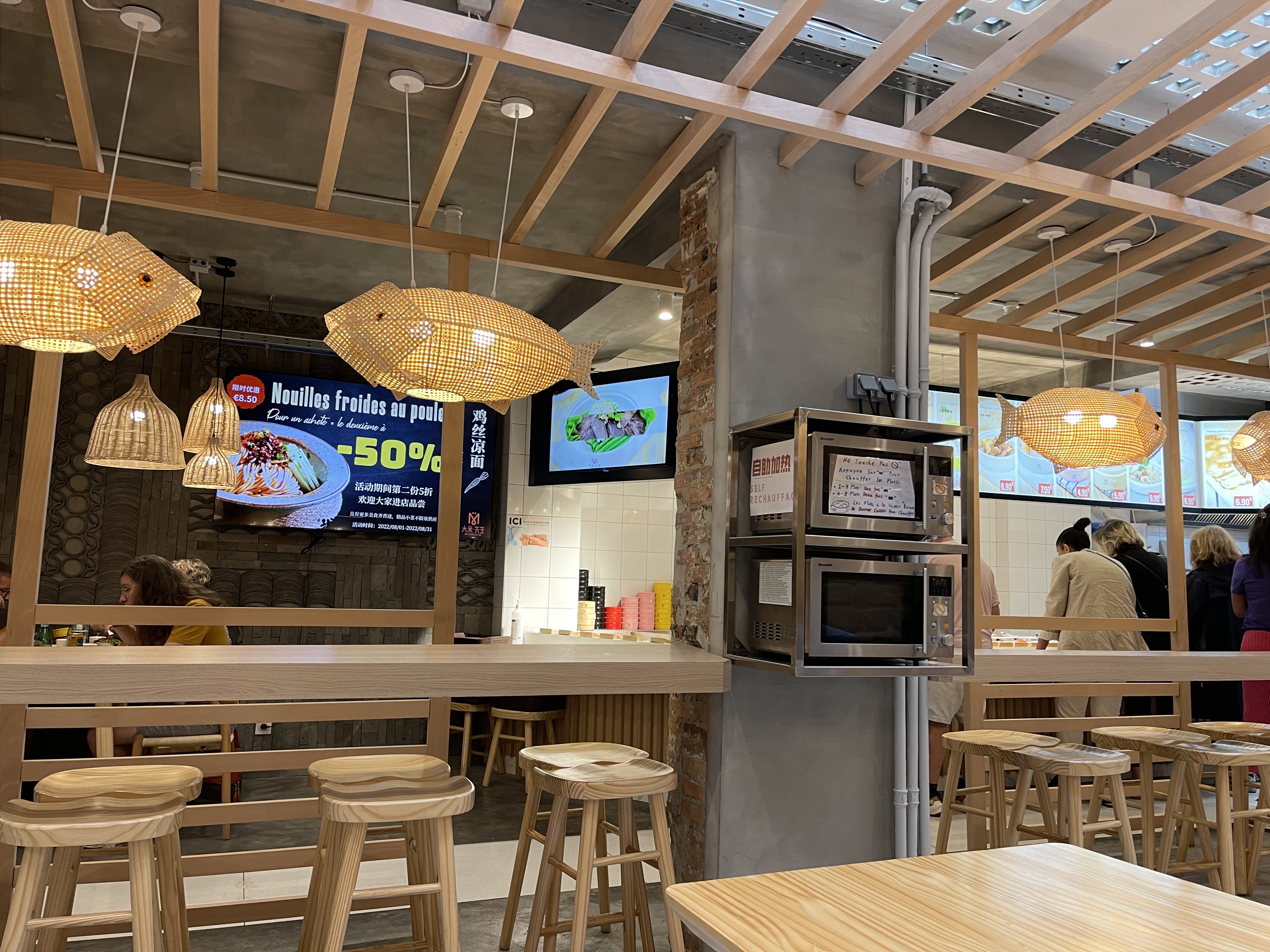 Nous sommes arrivées pour un diner de bonne heure (environ 19h) et par une assez grosse chaleur. Pour le coup on étouffait dans ce petit restaurant façon cantine asiatique façon Flunch: déco boisée, lampions, longue tables avec bancs, micro-ondes pour réchauffer ses plats, couverts, baguettes et serviettes près de la caisse... Bref, une atmosphere relativement dépaysante et assez agréable malgré le manque d'air. On prend nos petits plateau et on passe devant quelques entrées et plats, mais peu de choix -sans doute l'heure. Les prix prix semblent attractifs et varient de 4 à 10/12 euros. Au final, tout était bon mais sans grand plus ou wow effect (borderline bien gras pour tout ce qui était porc), surtout, les quantités étaient franchement petites. Pour le coup, les prix n’étaient pas donnés : trois entrees (2 raviolis crevettes + un poulet en sauce), un plat partagé + une tsin tao et une bouteille d'eau 25cl pour 44 euros... C’était sympa mais on n'y reviendra pas forcement. Bravo pour l'effort!
