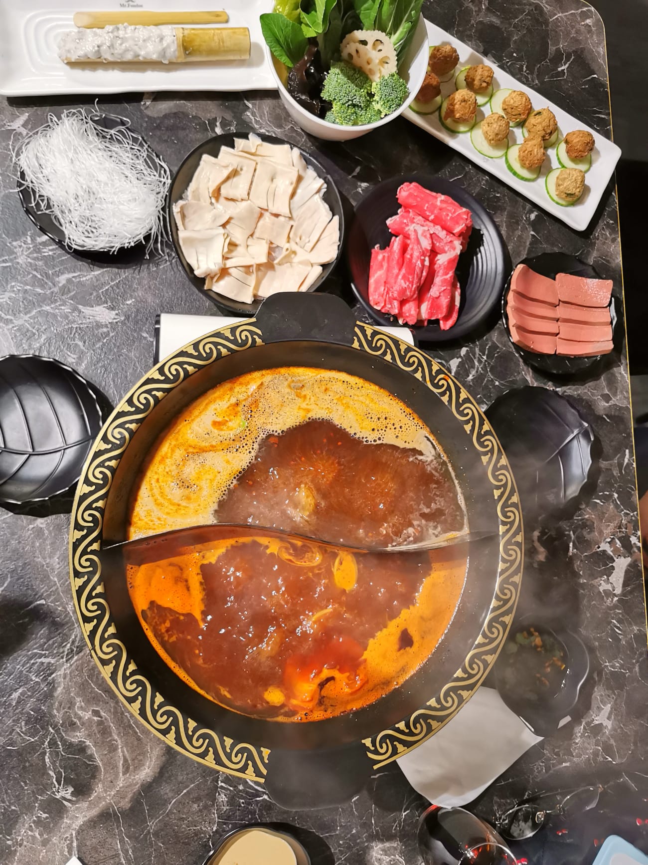Nous avons commandé une fondue double (un coté piquant et l'autre non), la base de soupe est faite avec du thé noir de Chine, donc très saine et ne donne pas soif après. Les matières alimentaires sont frais et de bonne qualité, le patron est un passionné de la gastronomie! Si vous souhaitez découvrir la fondue chinoise et les autres bons plates, c'est une très bonne adresse!
