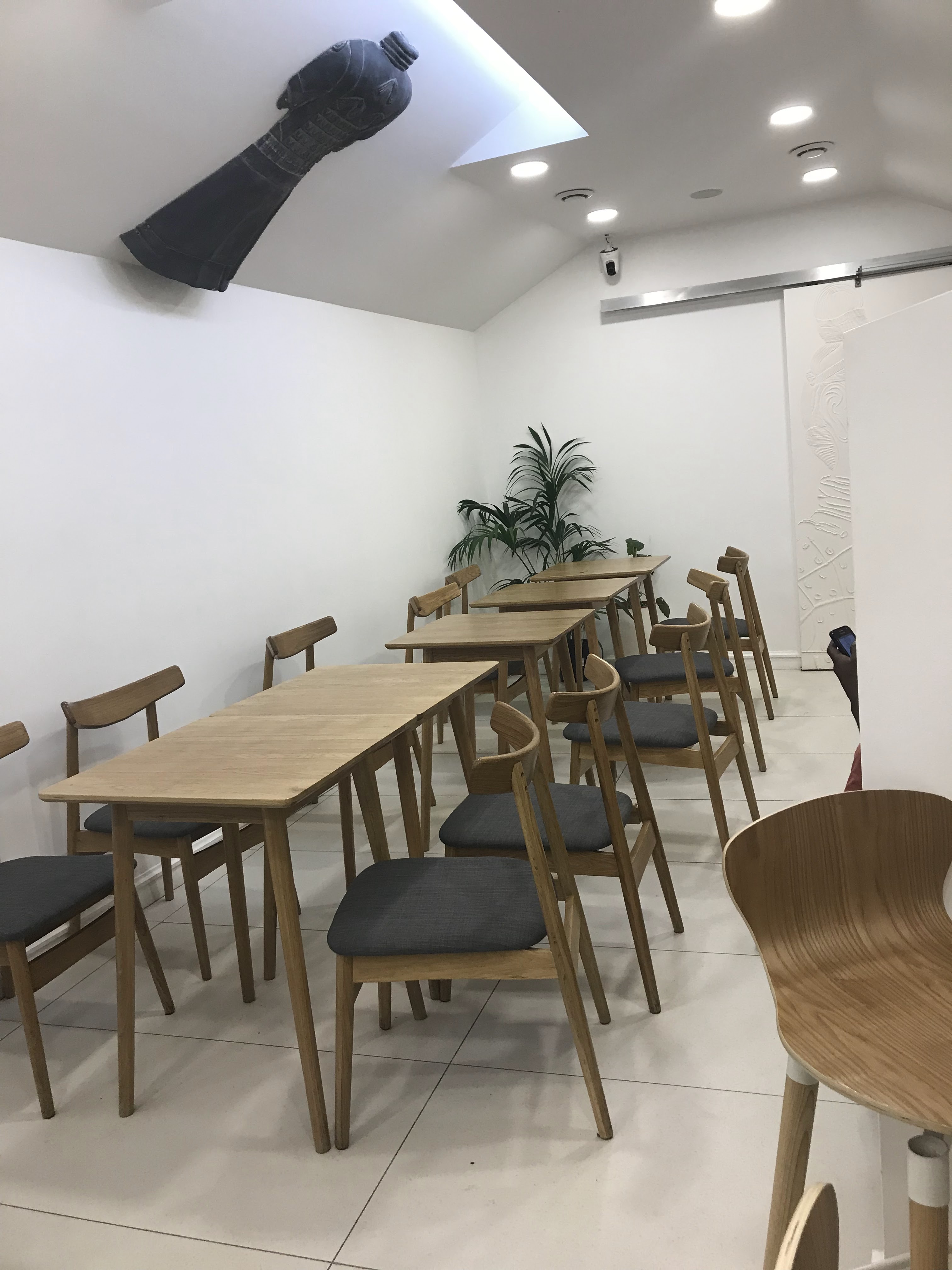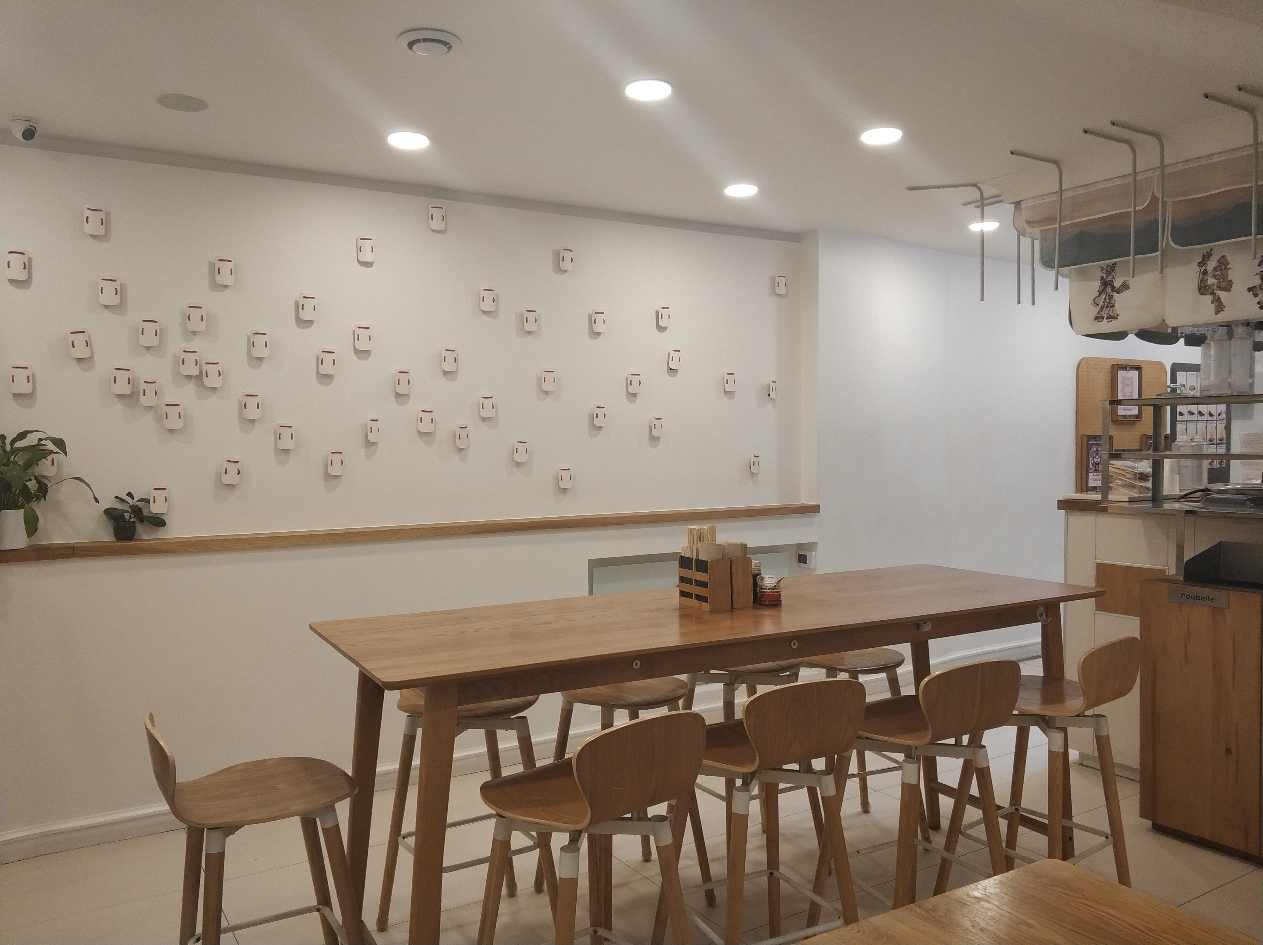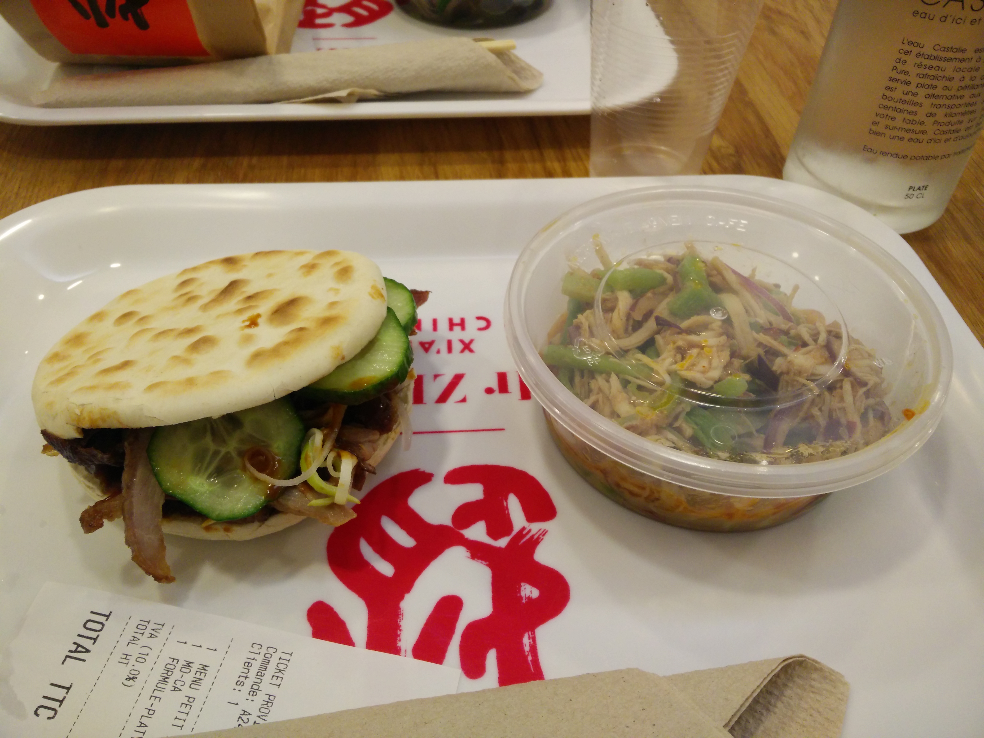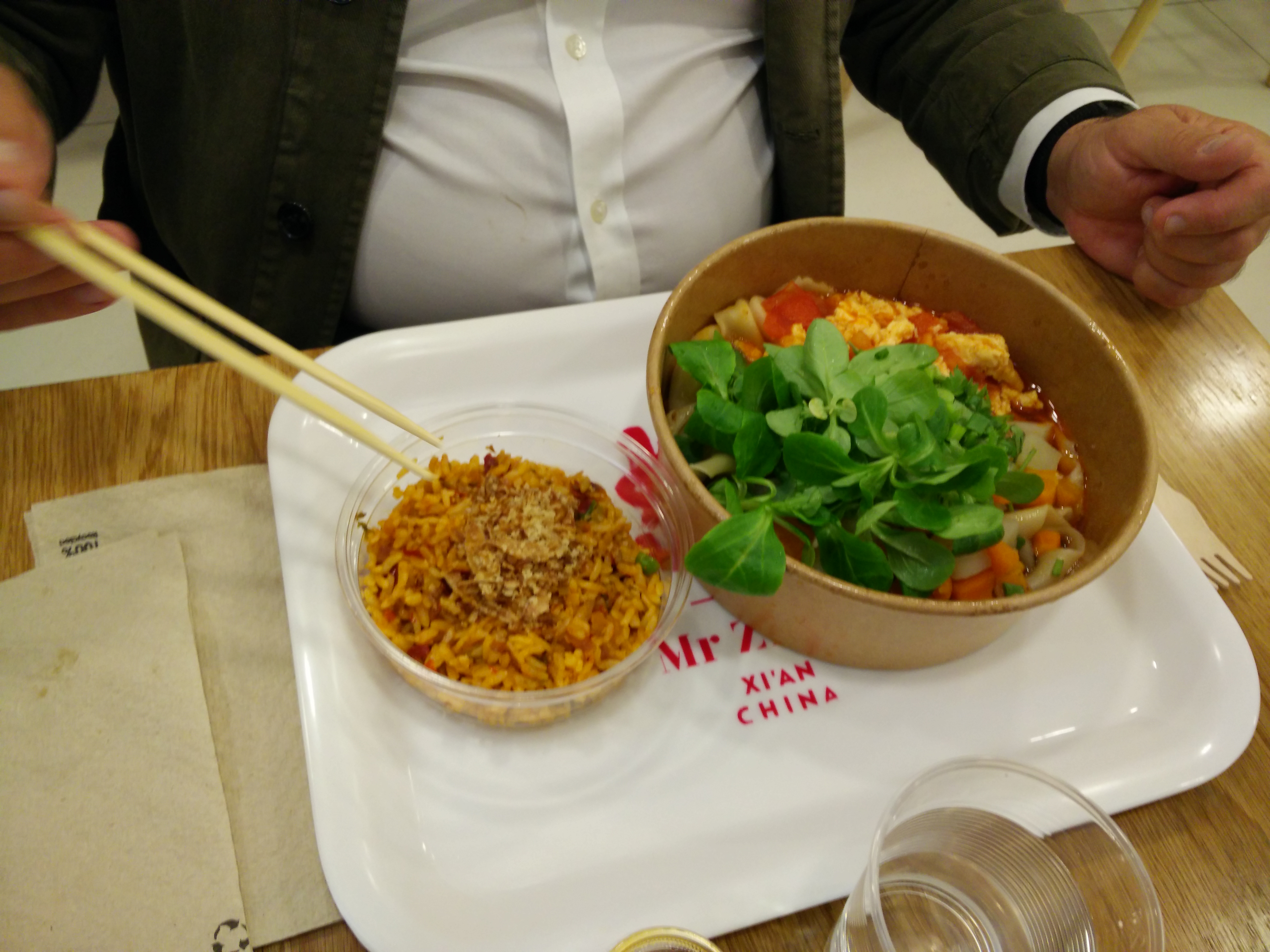 Ah mais en fait c’est un fast-food, et vraiment à 100 % ! On fait donc la queue, on commande, on cherche une table, ça bip, on va chercher, on mange et on dépose son plateau en partant. On ne parlera pas de service ici, puisqu’il n’y en a pas. Le cadre est épuré et propre, mais dépourvu de fenêtre, ça ne se prête vraiment à s’attarder. On mange dans des bols en carton, les coupelles sont en plastique, donc ni agréable, ni écologique. Pour info, il n’y a pas de grandes cuillères mais seulement des petites ce qui n’est pas top pour finir correctement le plat. Les raviolis sont type Gyozas et sont très bons. Les nouilles Biáng Biáng sont correctes, mais la recette est largement en dessous de celle de Nouilles Ceintures. Le fait de les mettre dans des bols en carton n’aident en rien à s’en démêler, elles restent assez compactes, en tas, difficiles de les séparer. Au final, c’est donc un lieu qui convient aux étudiants, aux gens pressés devant manger sur le pouce.