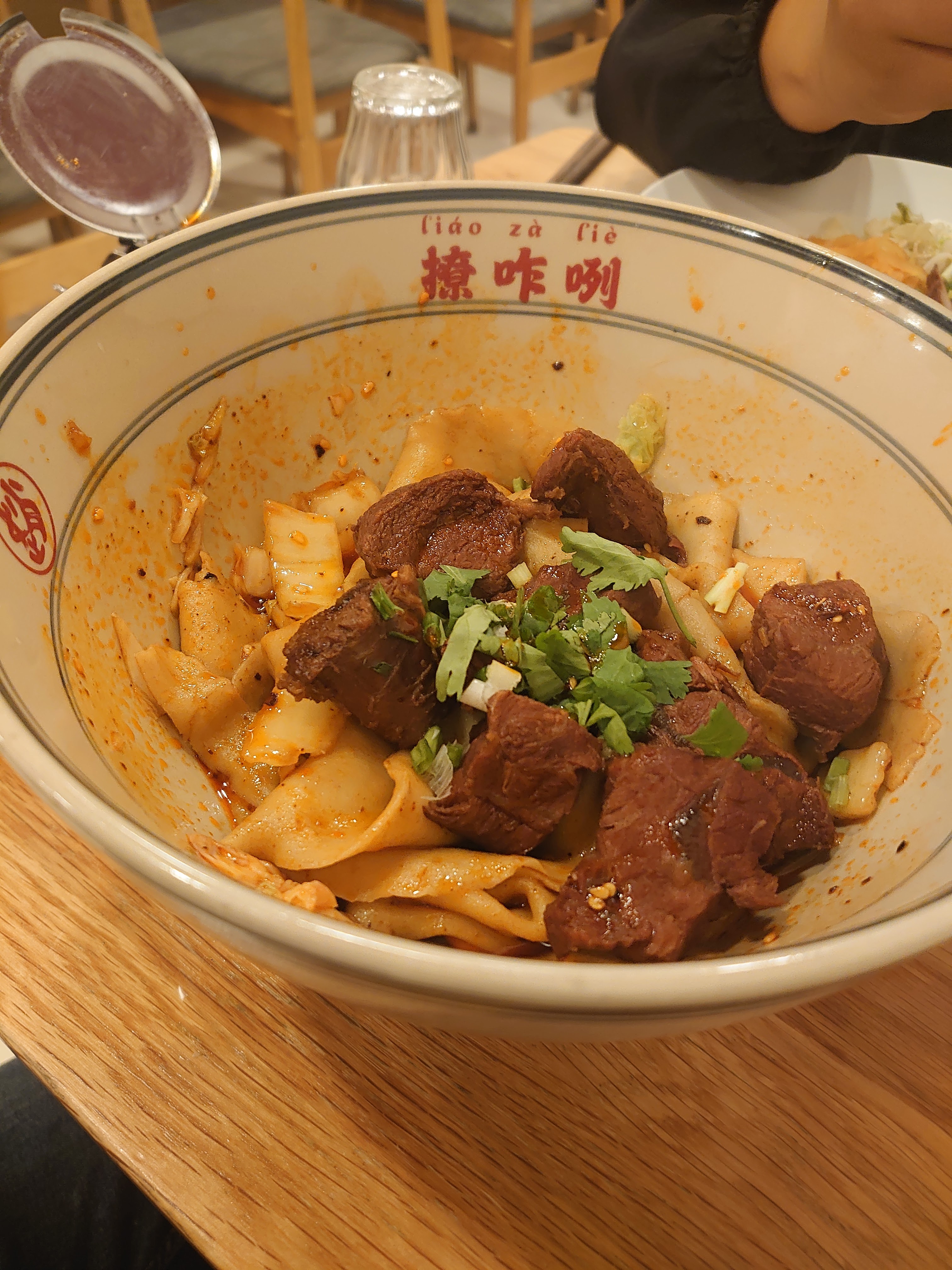 Pâtes biang biang bœuf et tomate incroyables : la sauce légèrement pimentée est super savoureuse, les pâtes fraîches sont légères et le bœuf est archi tendre et bien assaisonné. Je recommande à 10000% (on m’a aussi dit que les gyozas sont très très bons)