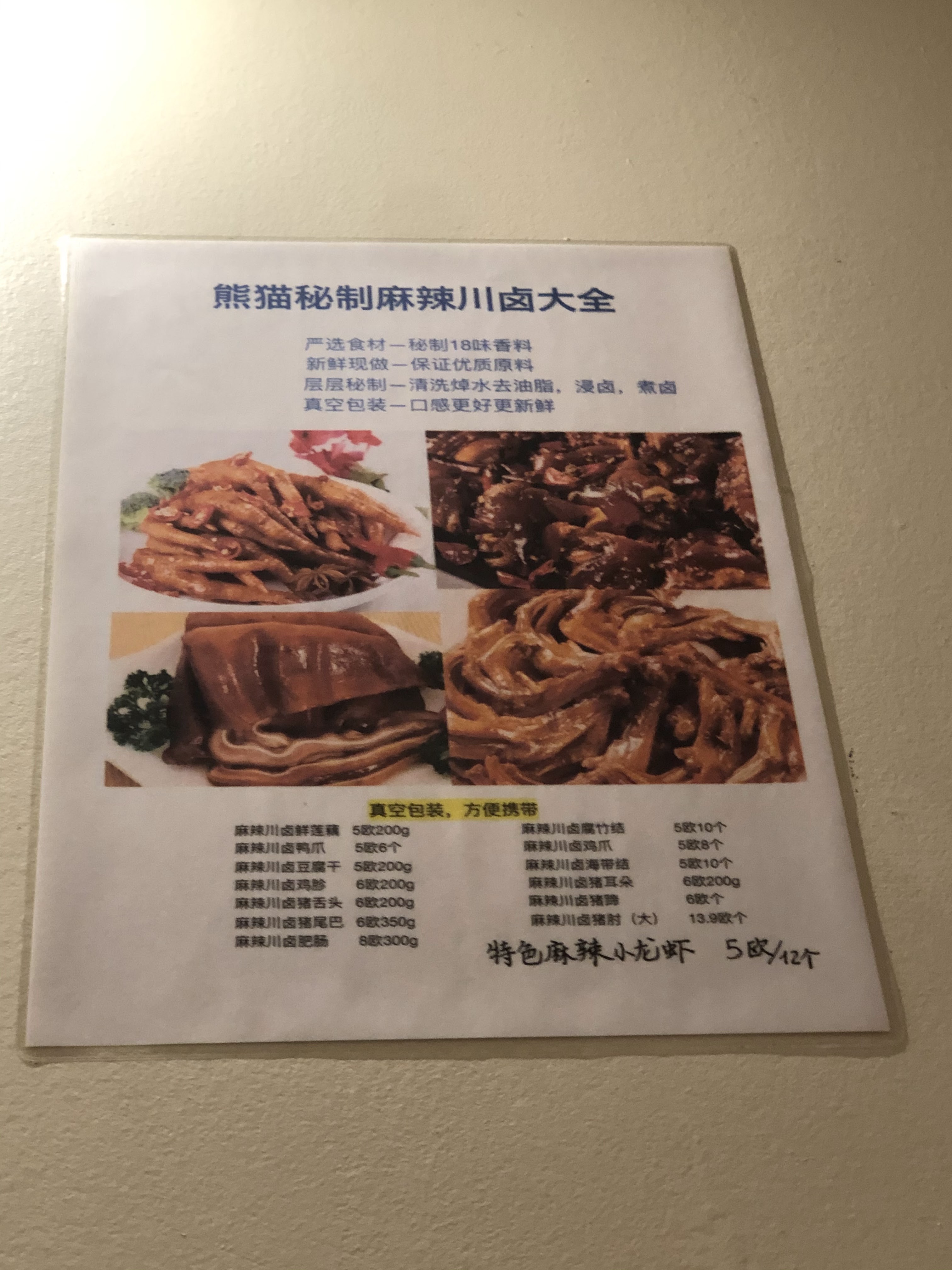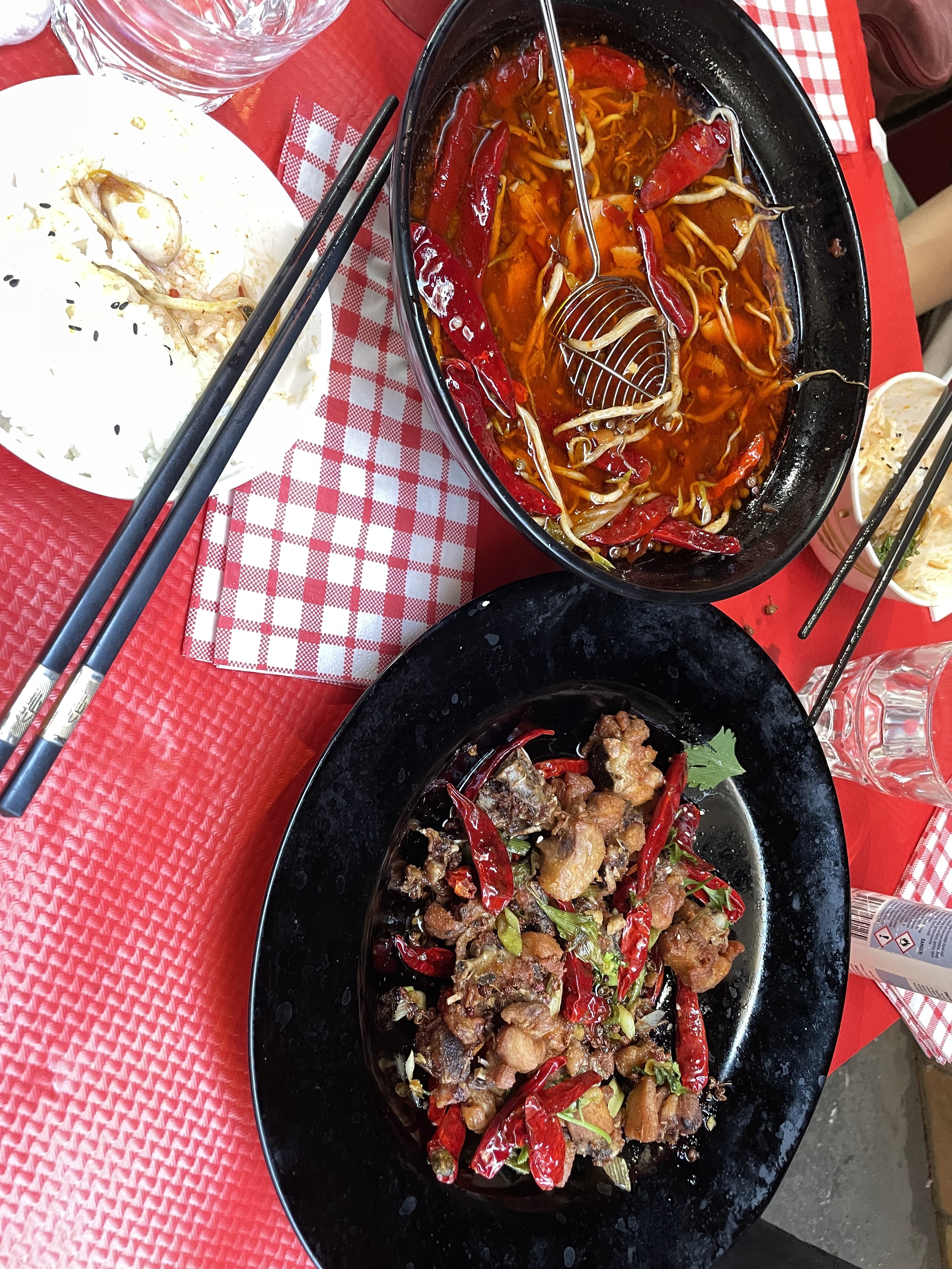 Je ne connaissais pas ce type de cuisine chinoise, et par curiosité nous nous sommes arrêtés. Les entrées étaient bonnes, mais les plats étaient vraiment très très TRÈS TRÈS HUILEUX : le mapo tofu, plat à base de tofu et de viande de porc, baignait/pataugeait dans l'huile... impossible à manger ! J'ai regardé des vidéos sur la préparation de ce plat une fois à la maison, et je pense que la soupe d'huile que l'on m'a servie n'était pas normale...