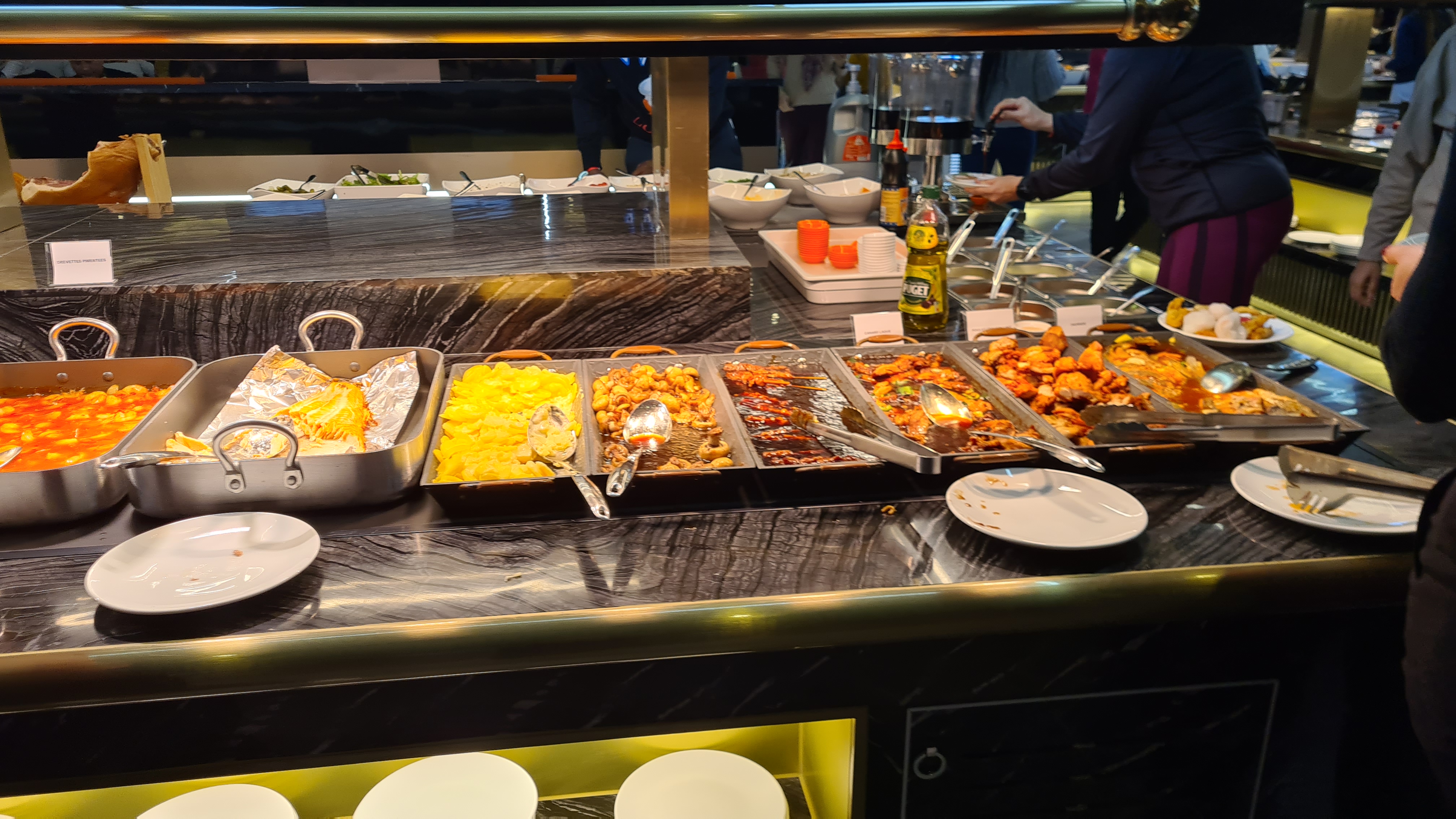 Superbe buffet!!!! Il y en a pour tous les goûts ...viandes, poissons, nems, calamars, fruits de mer, légumes, sushis , desserts, bonbons.... Impossible de tout énumérer tellement c'est bien garni Je recommande fortement, très bon rapport qualité/ prix