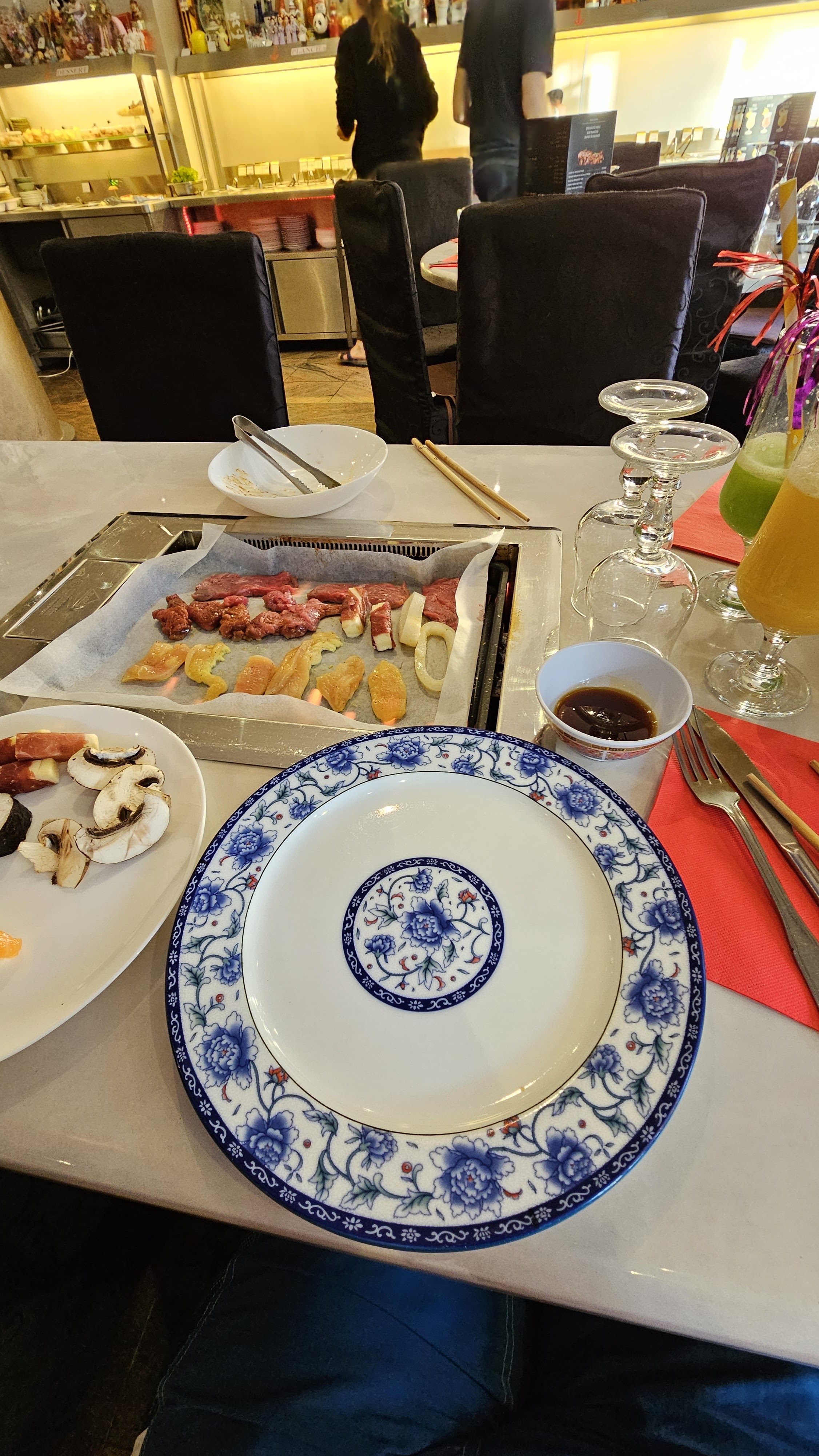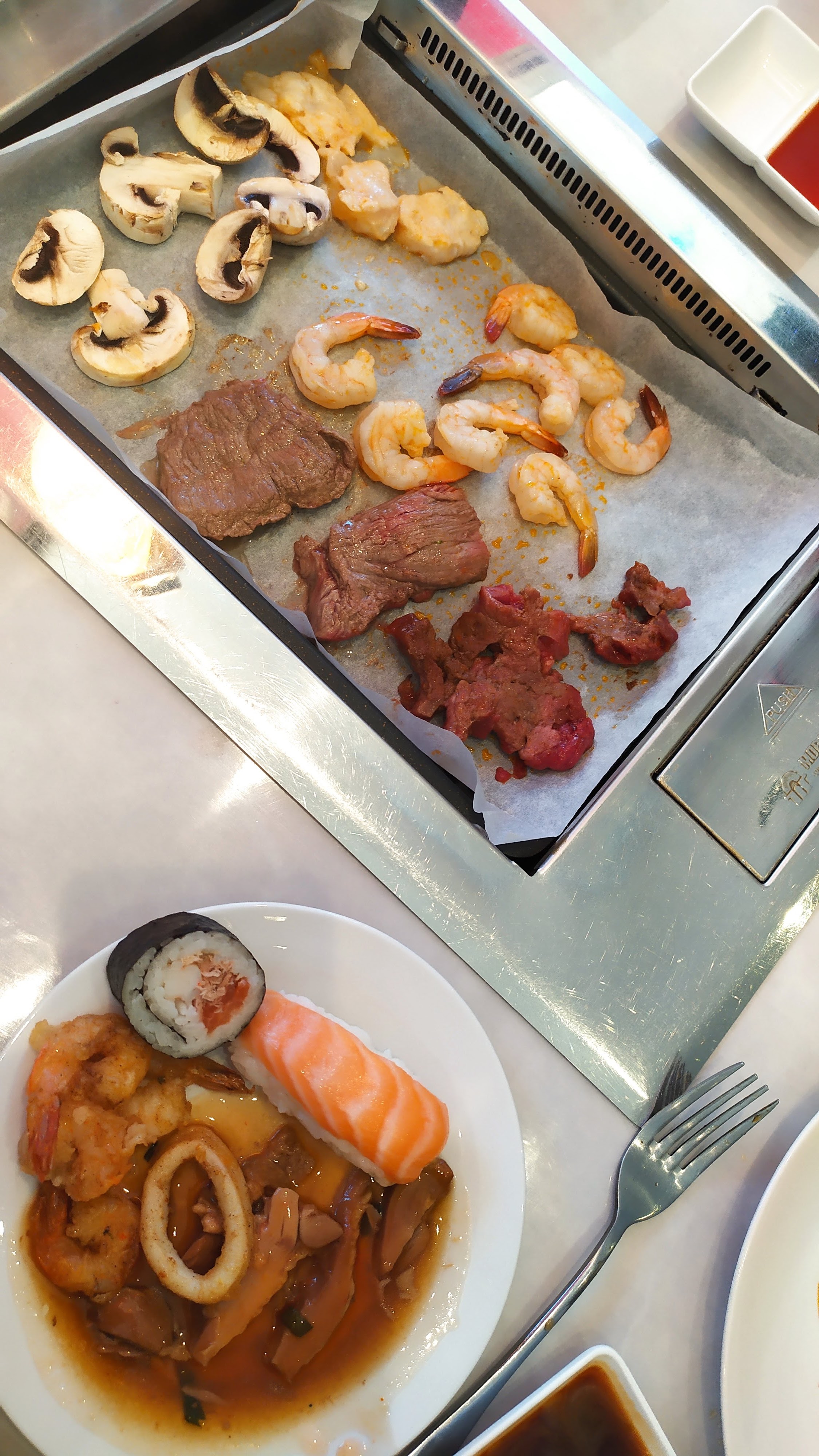 Buffet à volonté avec pas mal de choix On fait griller sa viande et des , poissons crevettes soi même . Le reste est sans intérêt. En gros. On y va pour se nourrir ou qe goinfrer.. Reste que le service est plutôt aimable..