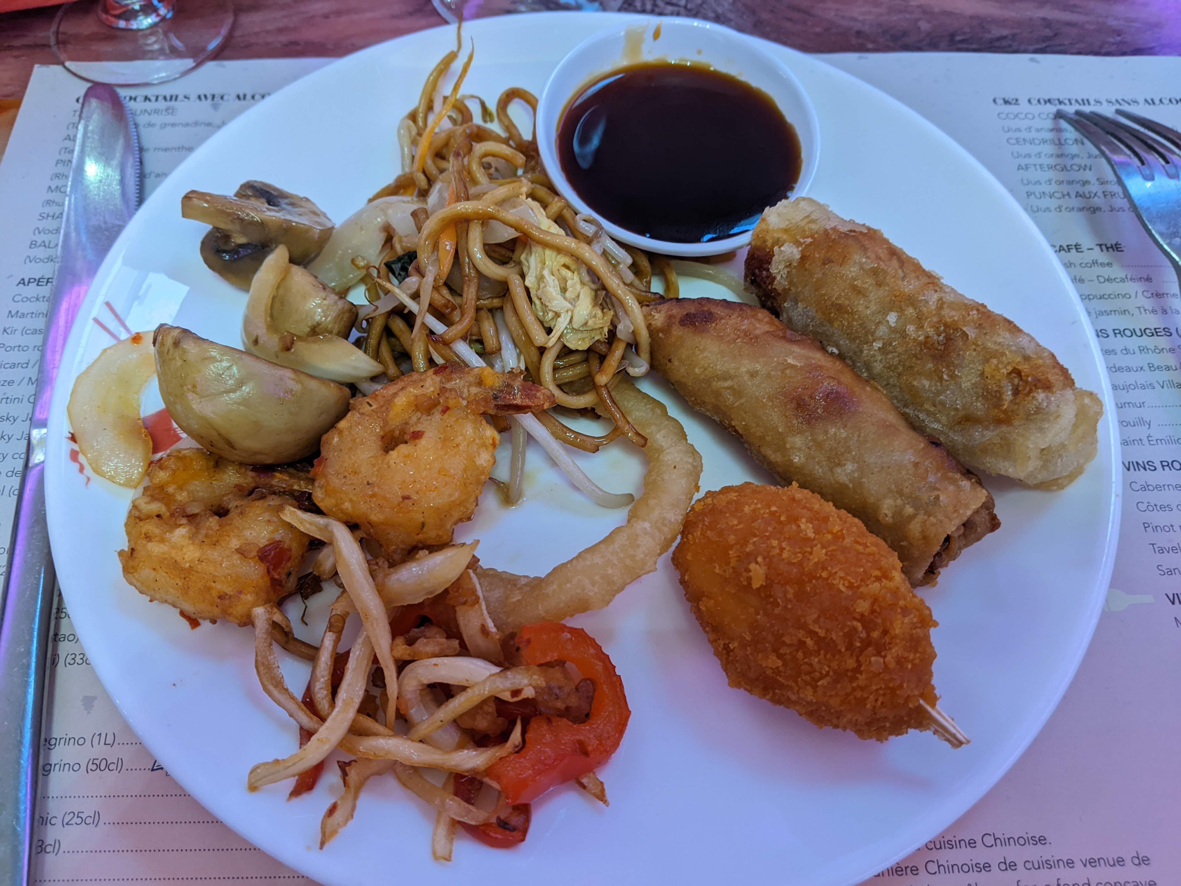 Peu de choix. Très basic. Le canard laqué est sec. Les frites patates douces froides.Les langoustines décongelées n’étaient pas fermes. Je vais régulièrement manger dans ce genre de restaurant et c’est la première fois que j’ai été autant décue.. En plus journée froide de pluie et pas de chauffage. Radiateurs froids.