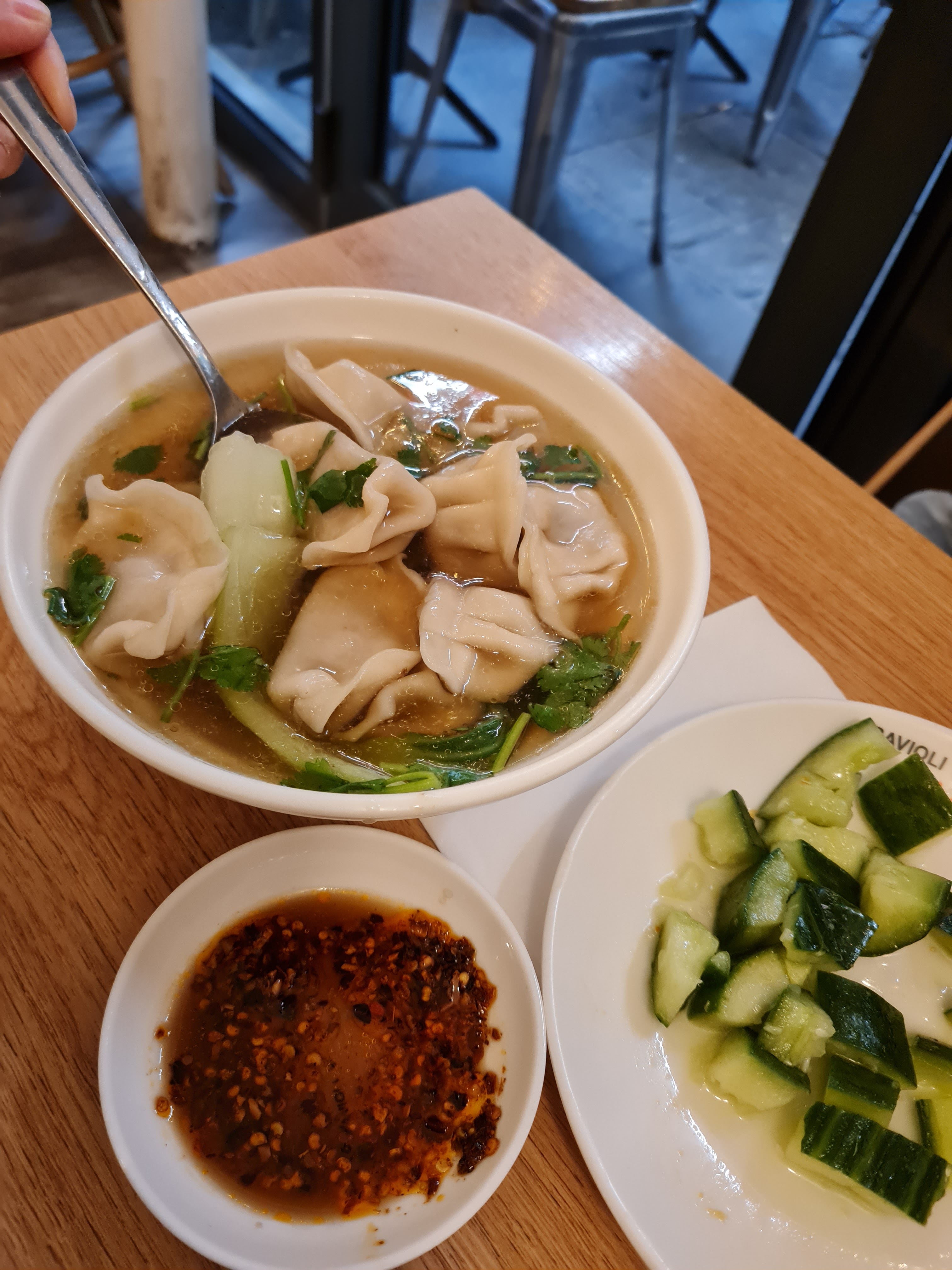 On pourrait passer a coter sans s arrêter mais je vous invite a entrer. Vous y mangerez une soupe de ravioli (soupe poulet + ravioli agneau) puis quelques ravioli grillé qu il faut tremper dans la sauce soja + vinaigre + le mélange piment maison. Miam