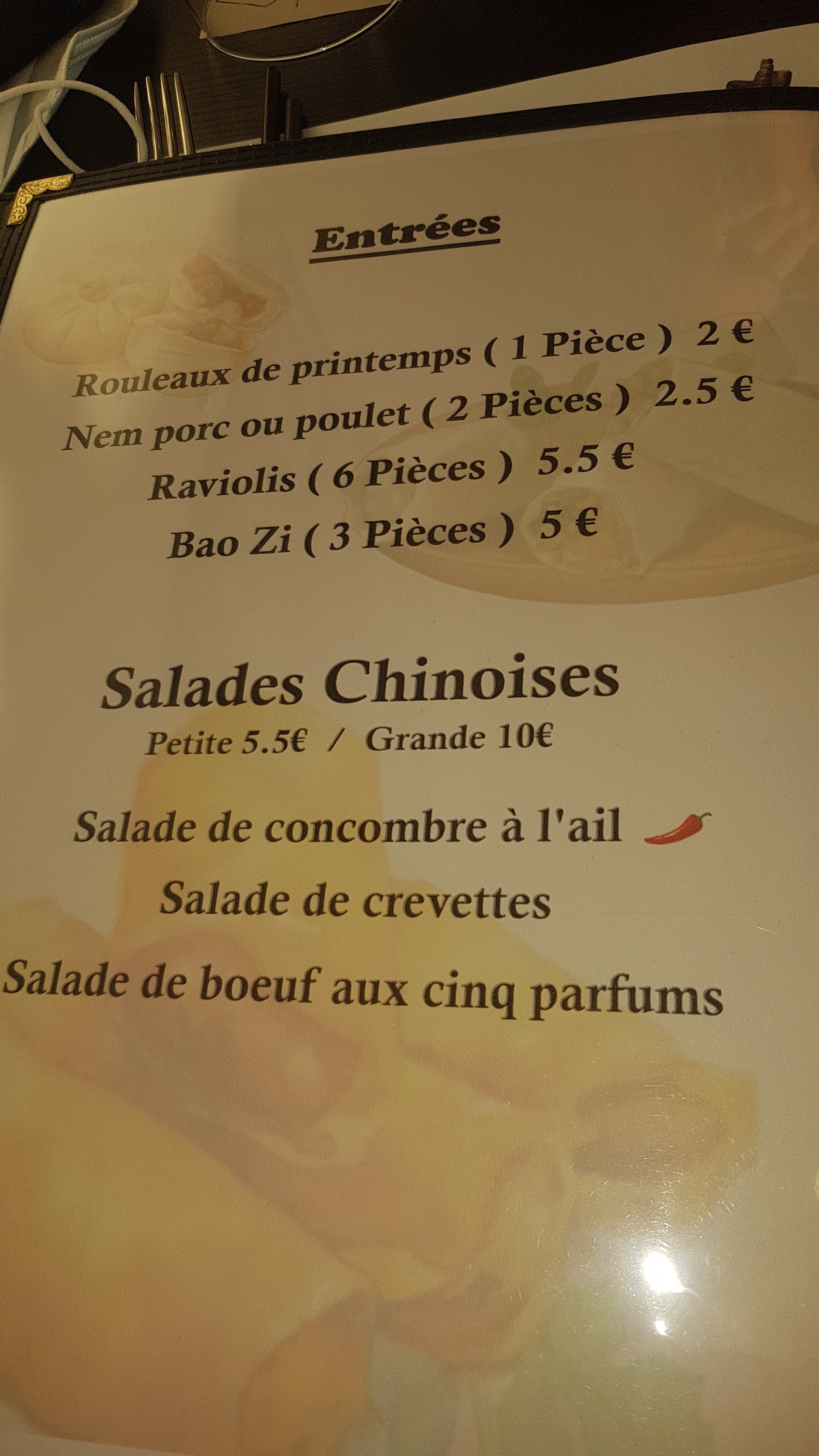 Petite carte mais produits de qualité. . Ca change des resto chinois classique. Vin au verre médiocre mais je n y suis pas allée pour déguster un bon vin. .