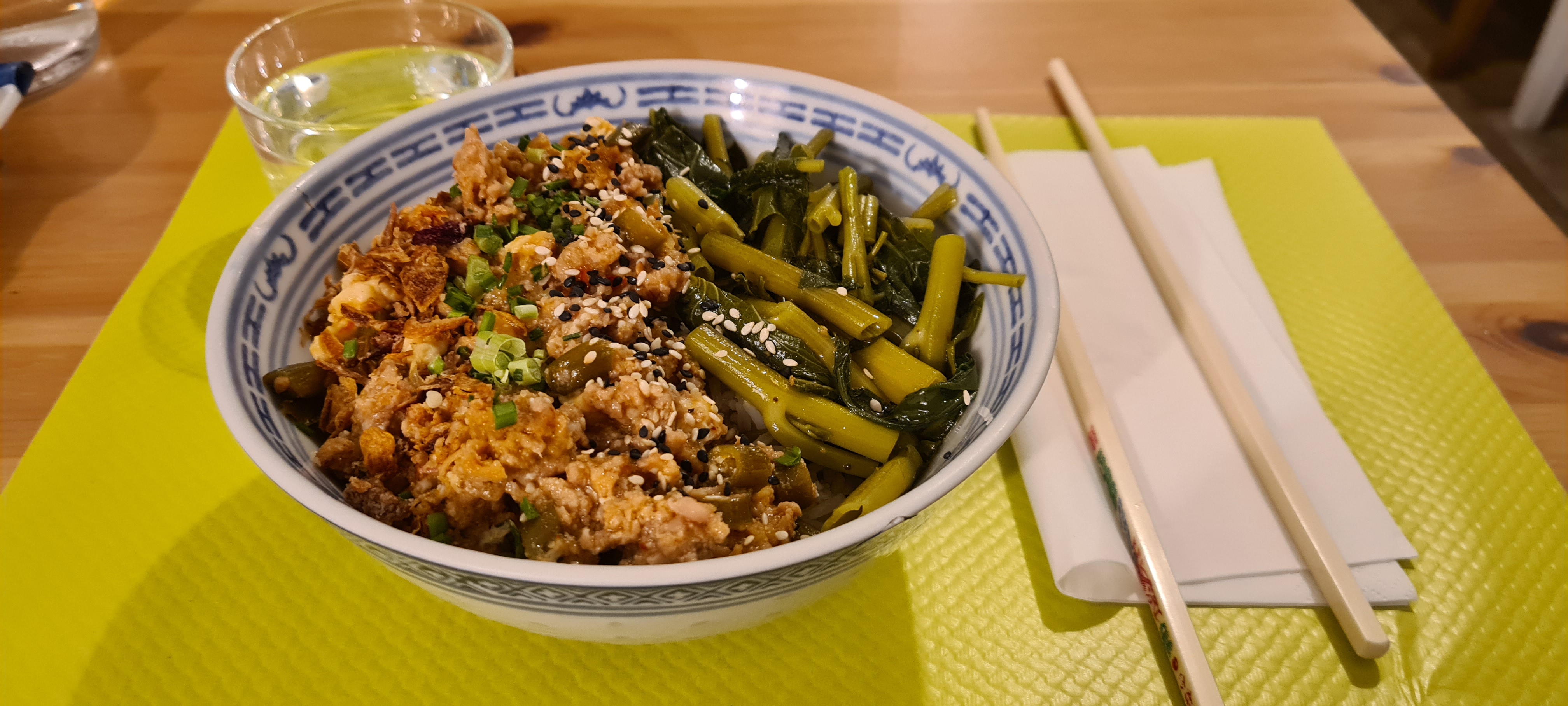La carte m'intrigue : courte, précise. Le porc haché - recette secrète de la Mama me decide à entrer. Le lieu est petit, propre, avec de jolies tables en bois blond qui éclairent l'atmosphère. Je suis accueilli très gentiment, presque humblement. Mon plat (à emporter) est prêt en moins de 10 minutes, et pourtant, on a trouvé le temps de me servir un petit thé, pour me faire patienter. Je rentre à la maison, je soulève le couvercle : c'est beau, ça sent bon, ça respire l'équilibre. Le porc haché est juteux, savoureux, parfaitement épicé. Il se mêle à merveille à du tofu tendre et soyeux, riche des saveurs de la sauce. Un peu de ciboulette, de sésame, et ces légumes verts dont je ne sais pas ce qu'ils sont mais qui ont un petit arôme... de thé ! Un réel délice. J'y retourne demain :) !