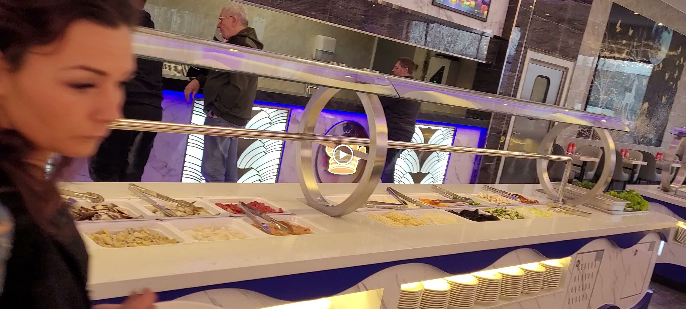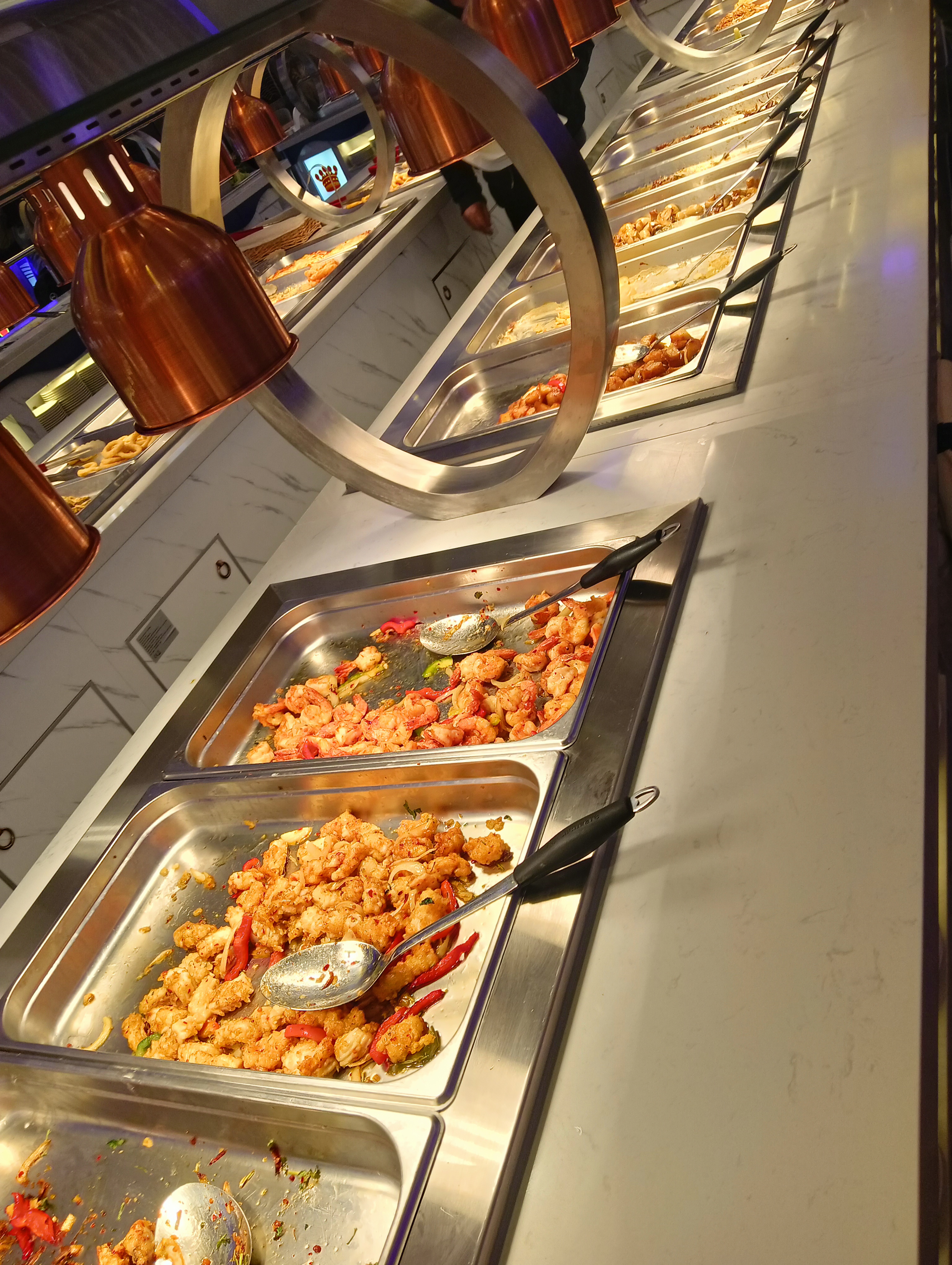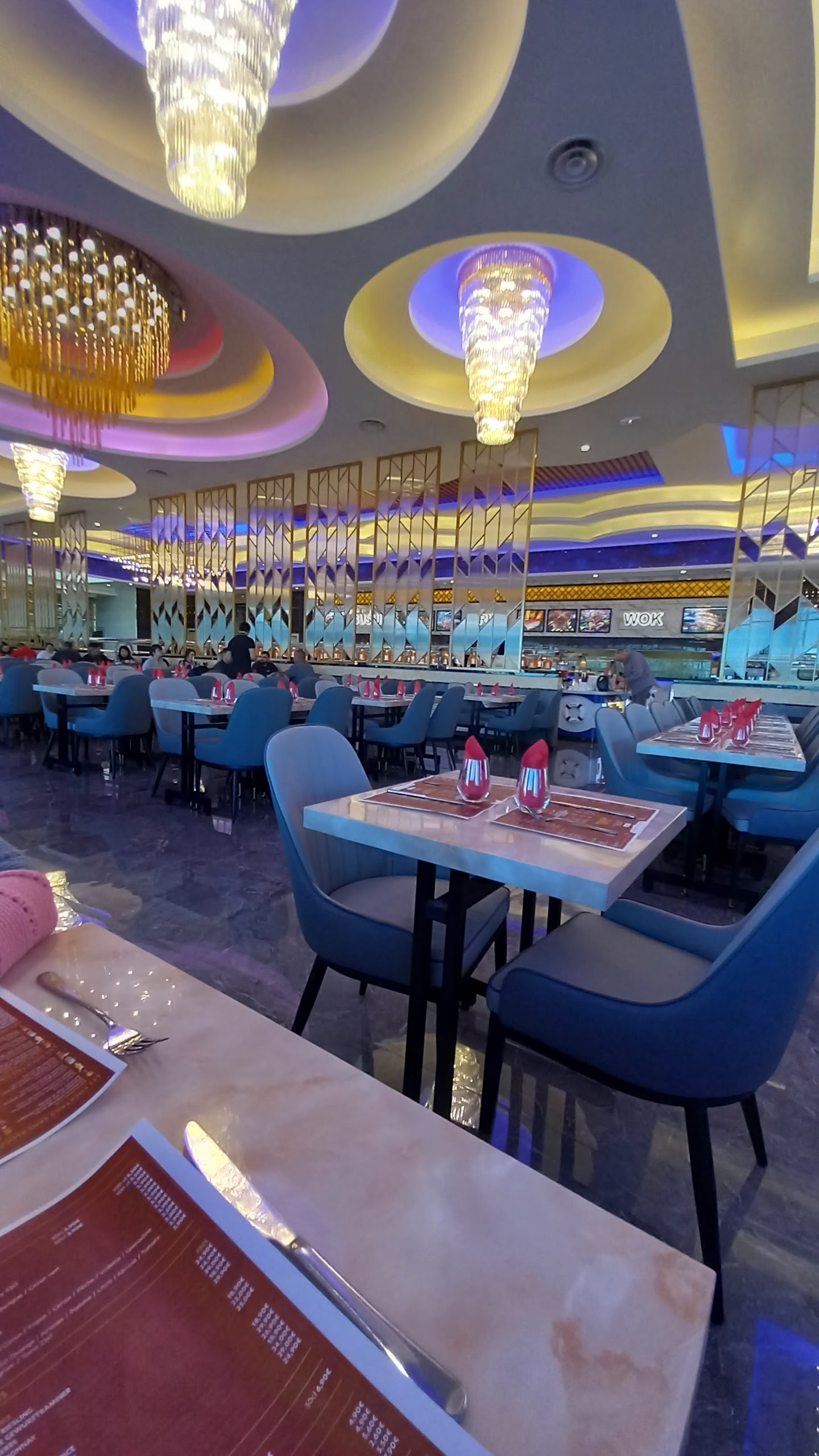 Au premier abord, on en prend plein les yeux par la déco, les lustres, la taille des buffets etc, nous sommes allés un dimanche soir, pas trop de monde donc pas trop bruyant car je n'ose imaginer quand celui-ci est complet...choix de nourriture correcte mais plats pas très chauds, (personnellement, j'évite les micro-ondes),pas y aller trop tard car après 21h15, plus de ravitaillement des plats chauds et desserts, glaces à l'italienne etc( fermeture à 22h30),de plus malheureusement, j'ai eu droit à un éclat de verre en pointe dans une verrine de mousse avec fruits, heureusement que ce n'était pas un enfant qu'il l'ai eu...