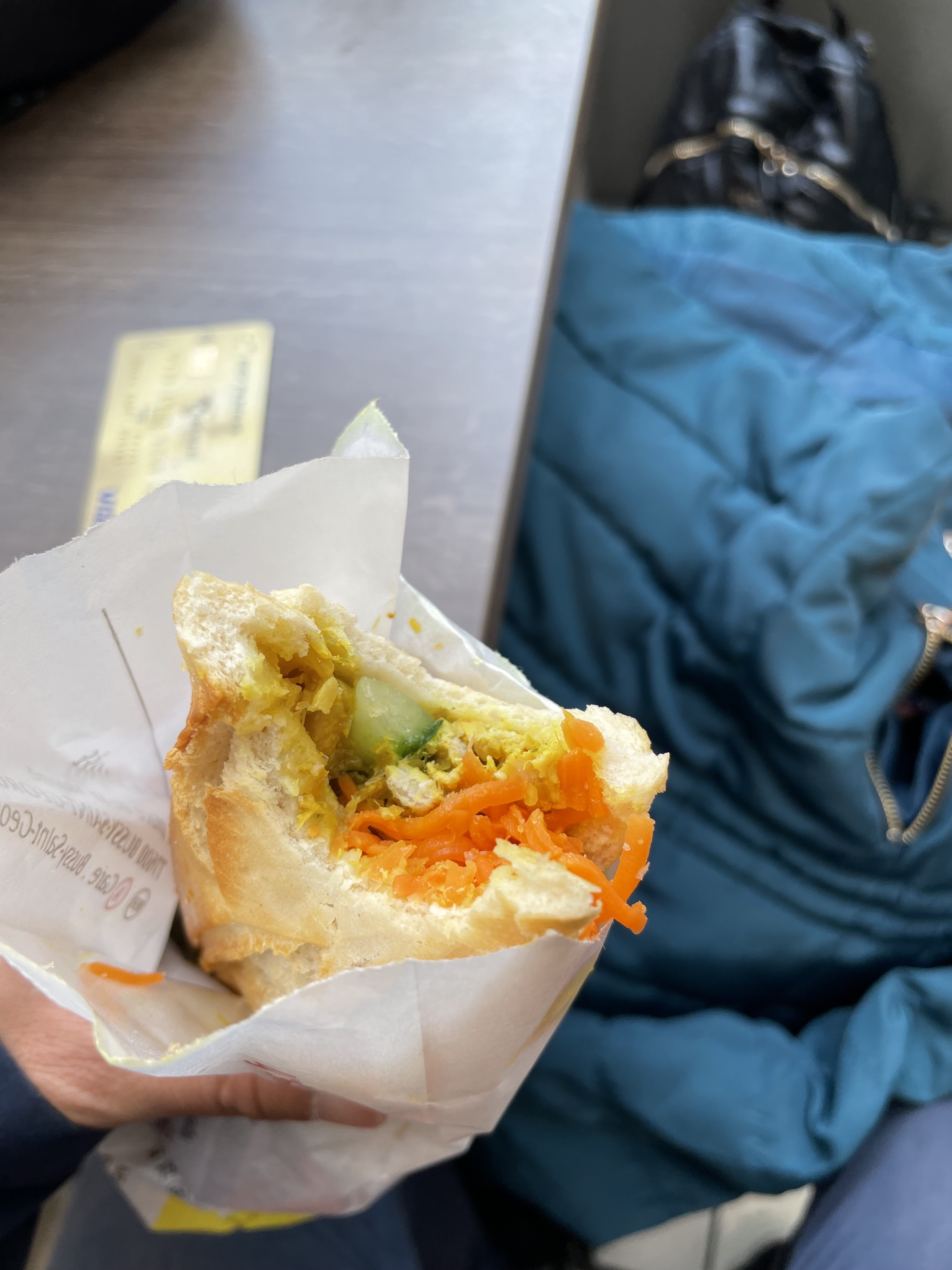 Banh mi infâme, grosse déception. Du pain de station service et une sorte de tranche de jambon avec énormément de gras, couverts par une tonne de carottes râpées.