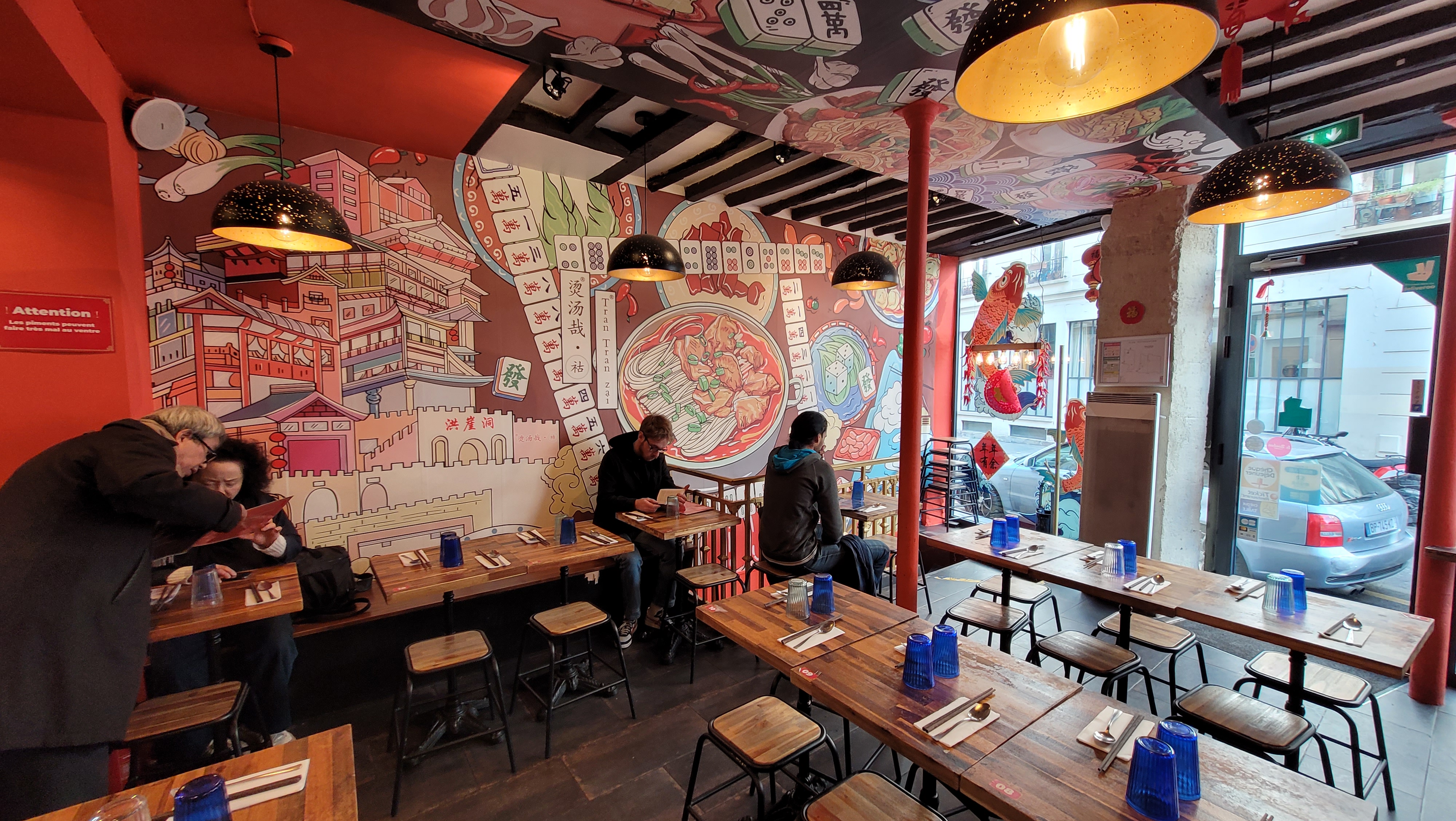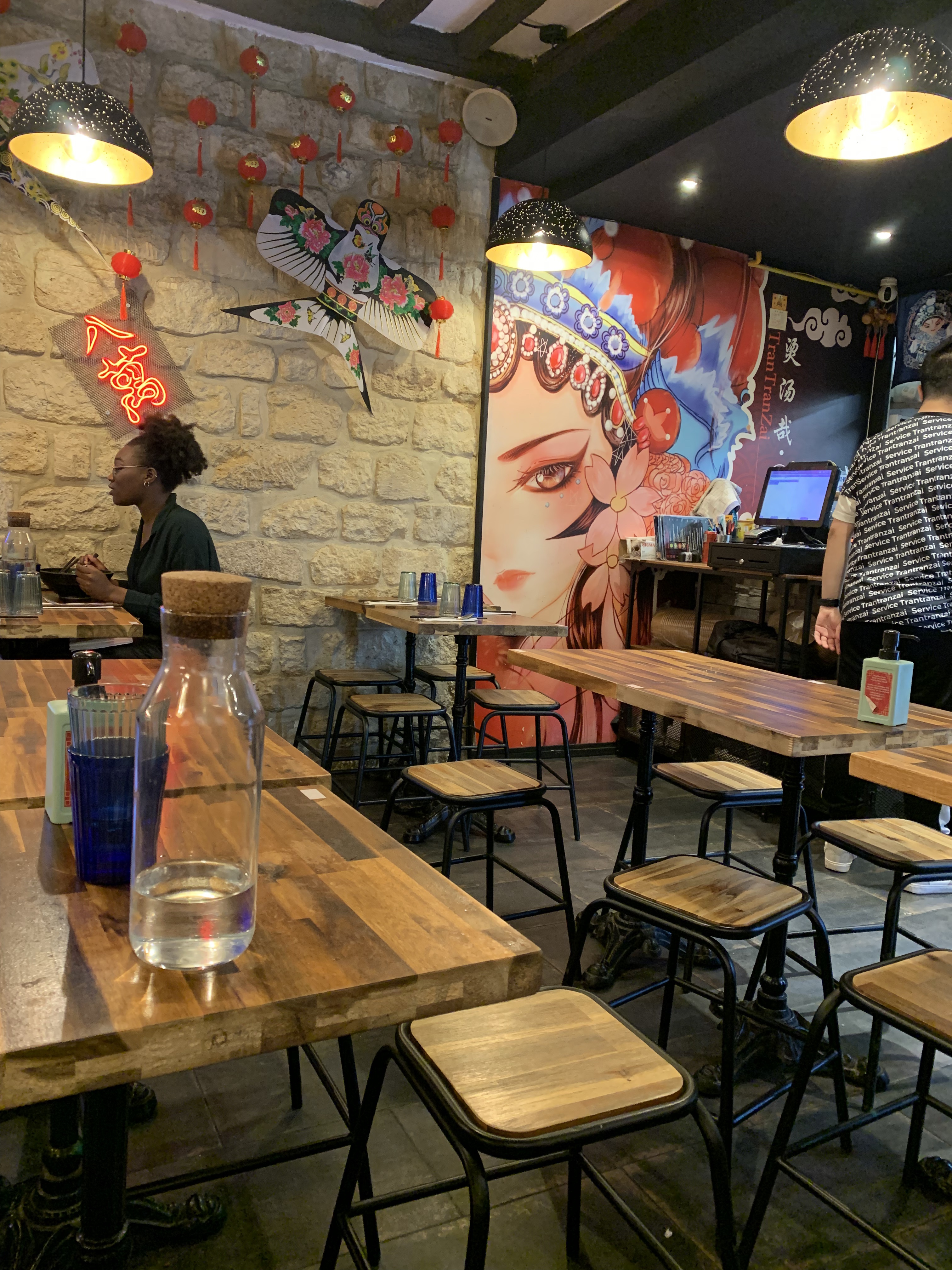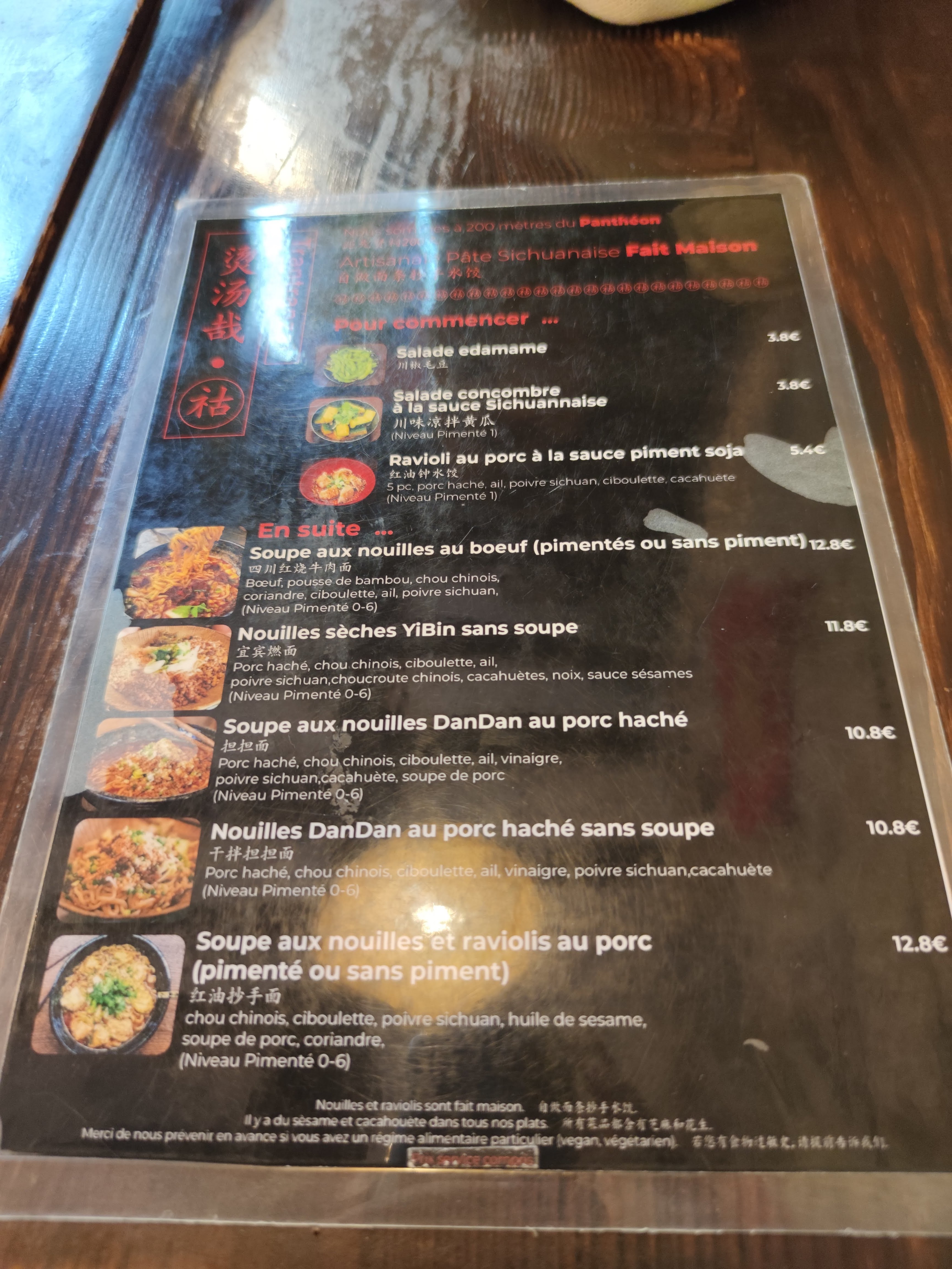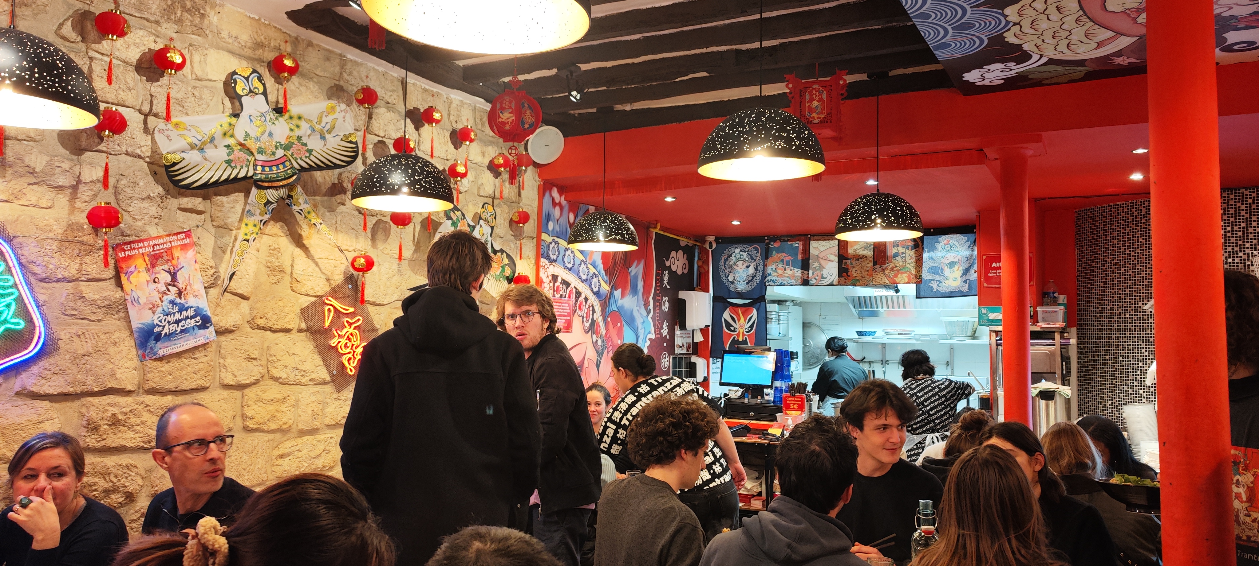 Les plats sont très bons que ce soit la soupe de nouilles au bœuf, les raviolis au porc, les nouilles DanDan ou les nouilles végétariennes ! Si vous aimez le piment, je vous conseille de prendre au moins le niveau 3, en dessous on ne sent pas trop. Concernant les bémols : la salle est vraiment petite, on se sent à l'étroit, c'est assez bruyant. Étant allée à leur restaurant à Montparnasse quelques mois auparavant je vous conseillerai plutôt de vous rendre là-bas. Le service était aussi désorganisé, sûrement dû à la forte affluence.