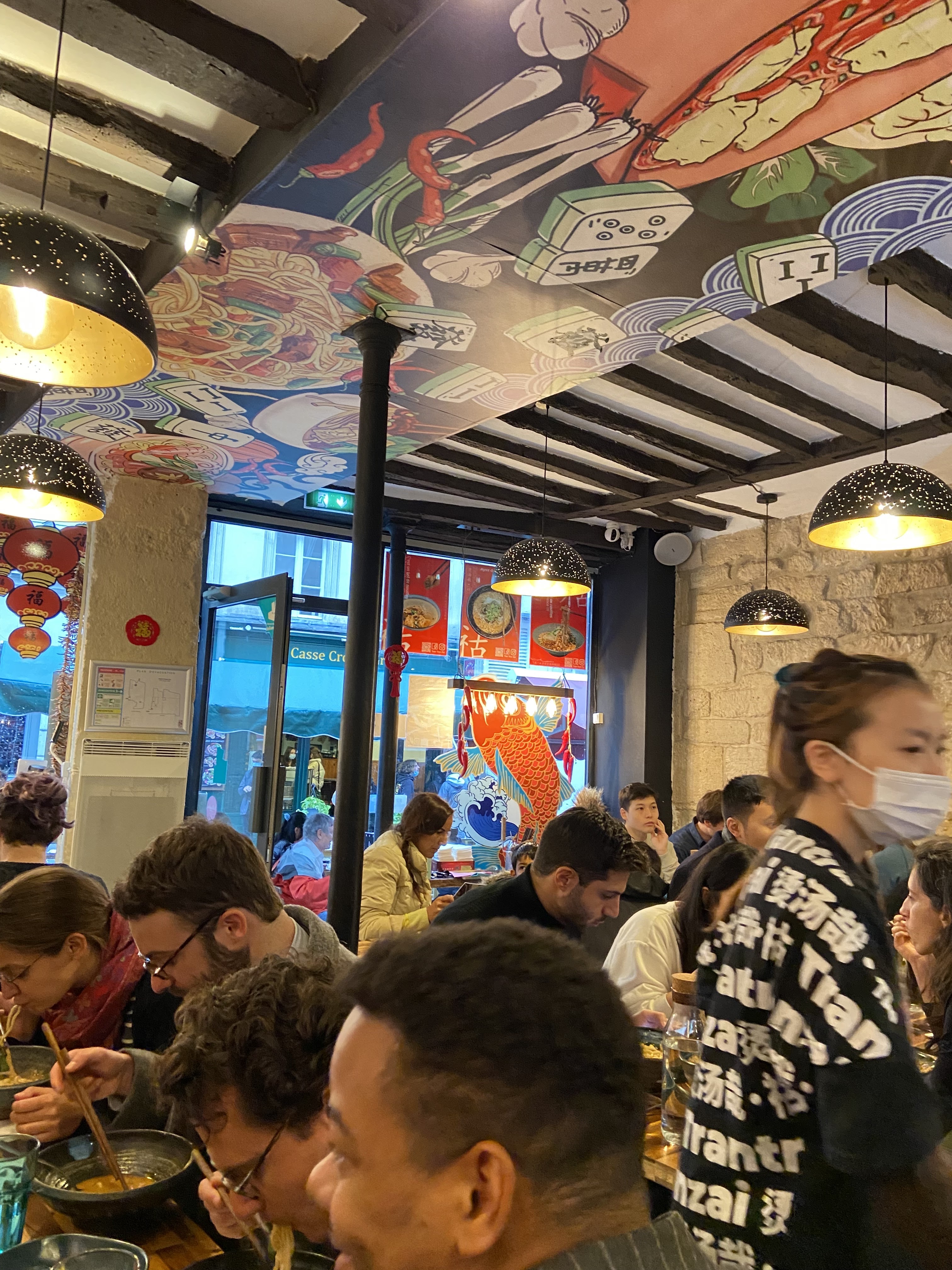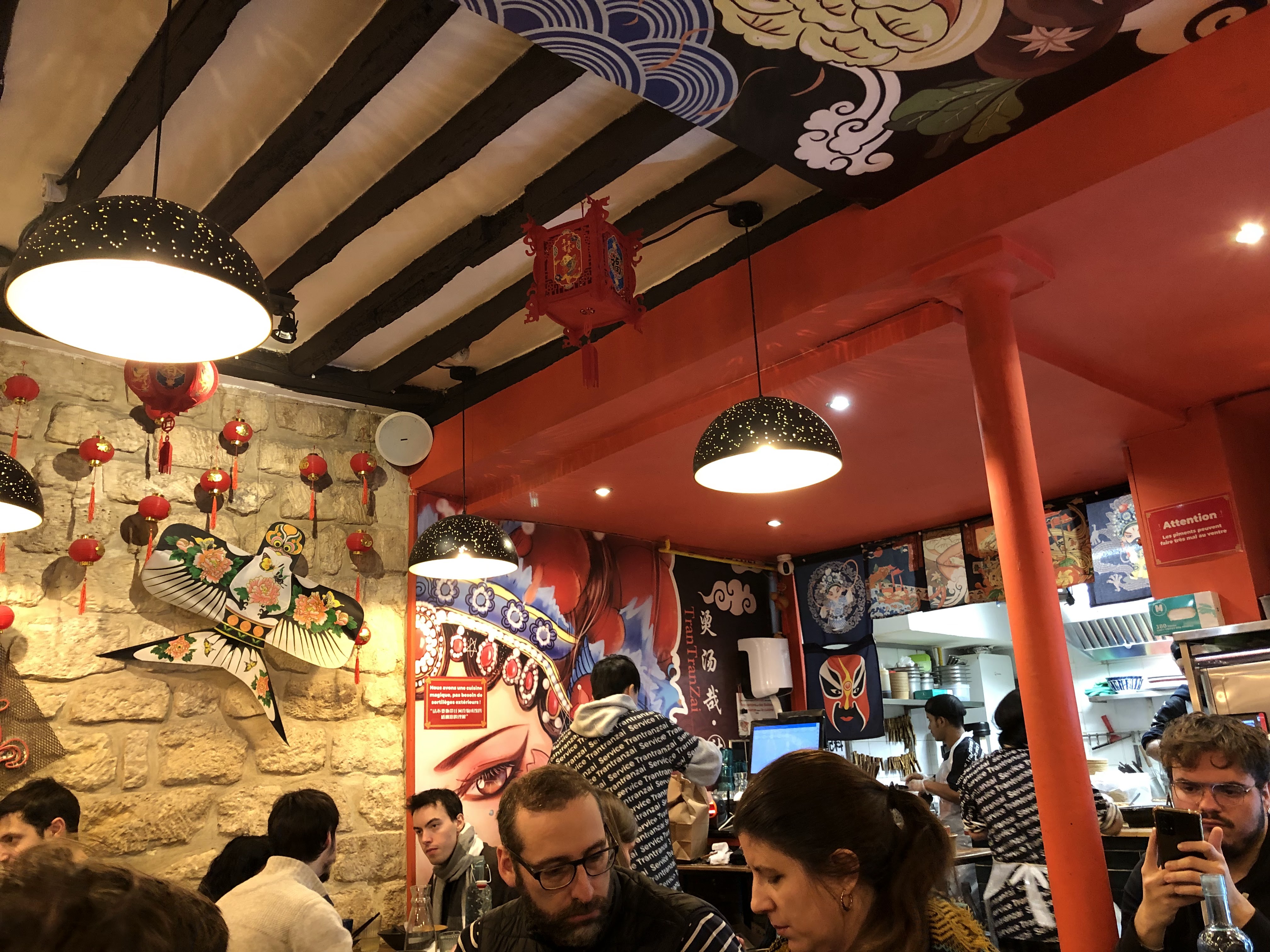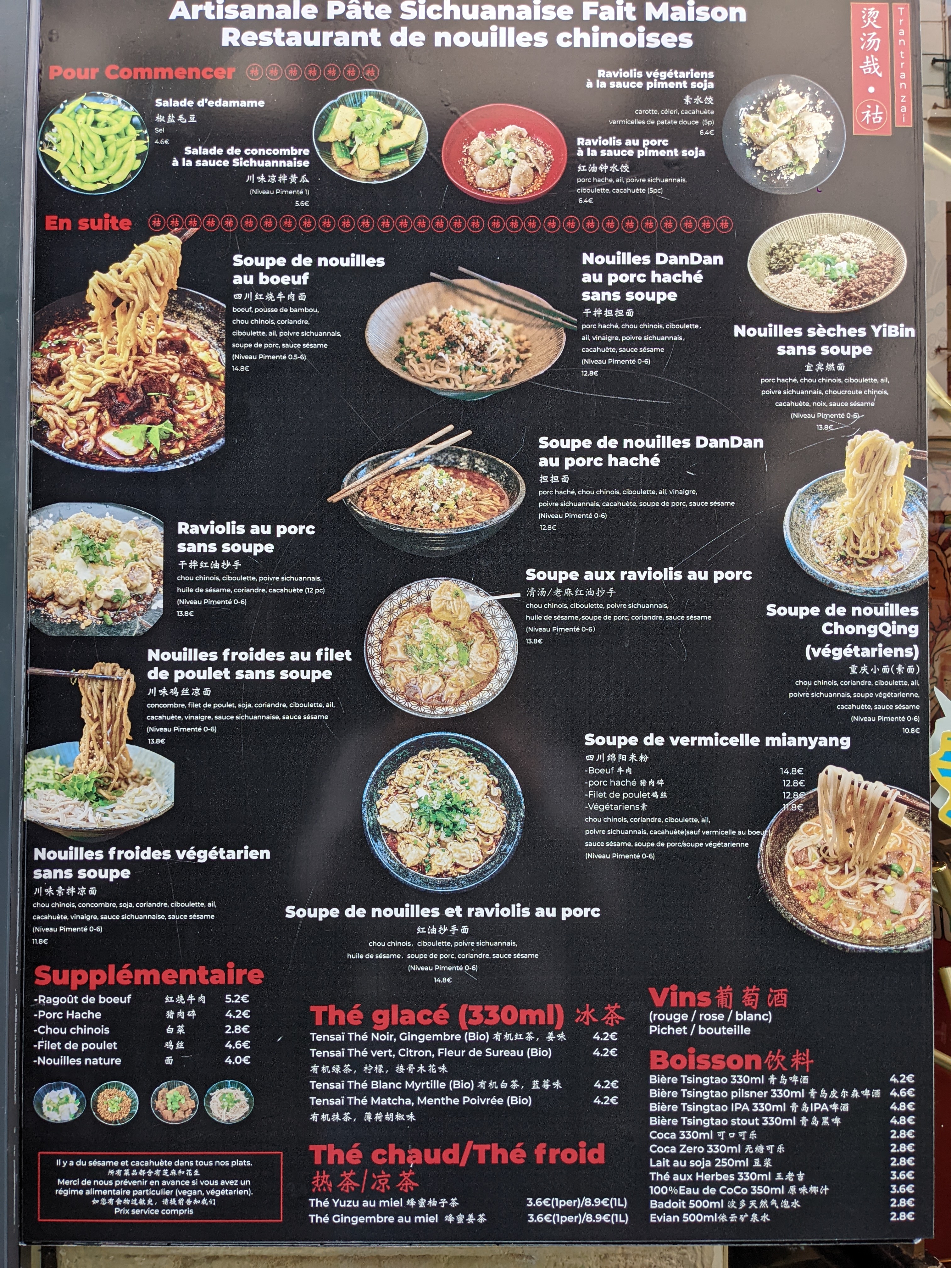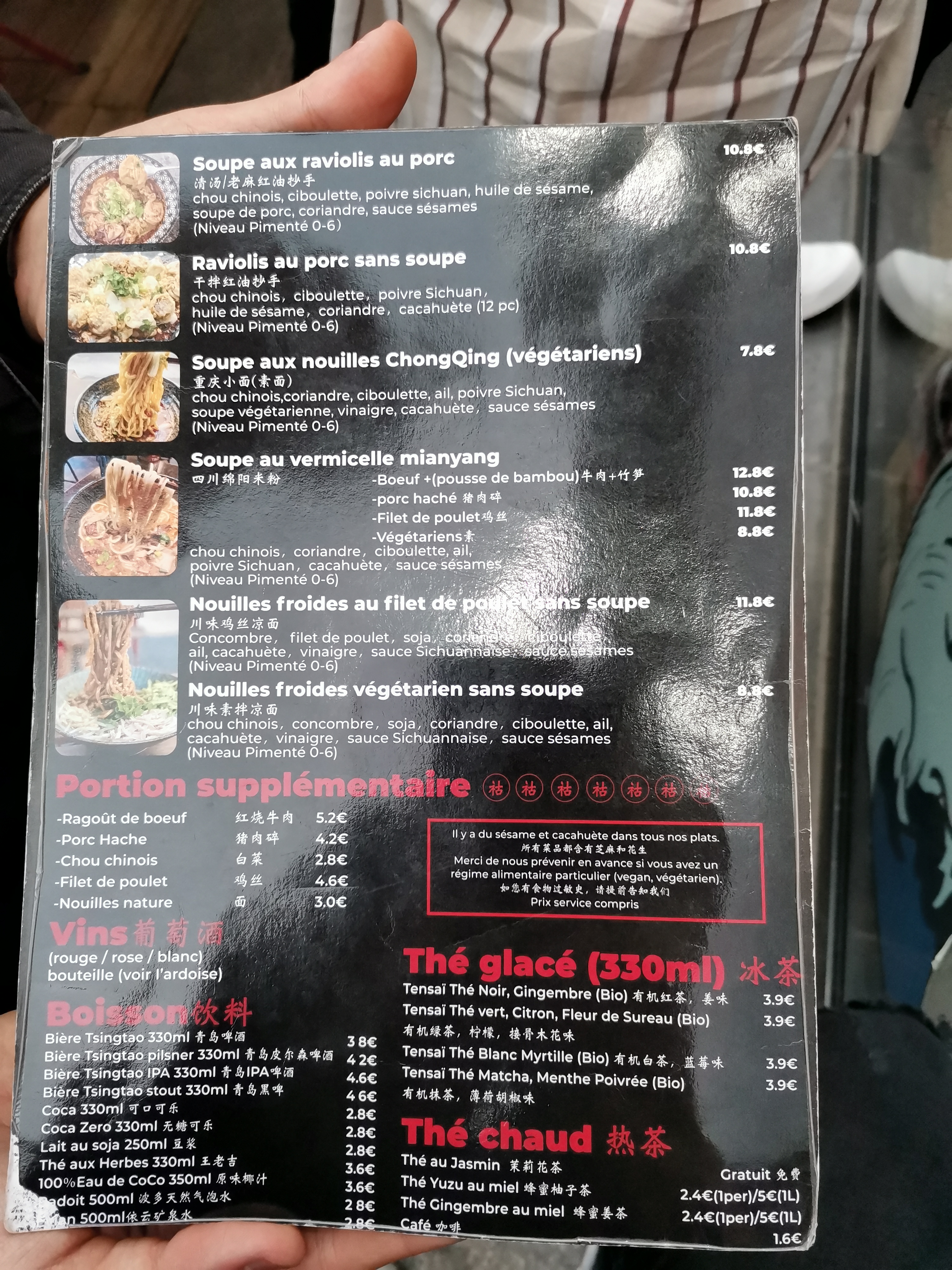 Les plats sont très bons que ce soit la soupe de nouilles au bœuf, les raviolis au porc, les nouilles DanDan ou les nouilles végétariennes ! Si vous aimez le piment, je vous conseille de prendre au moins le niveau 3, en dessous on ne sent pas trop. Concernant les bémols : la salle est vraiment petite, on se sent à l'étroit, c'est assez bruyant. Étant allée à leur restaurant à Montparnasse quelques mois auparavant je vous conseillerai plutôt de vous rendre là-bas. Le service était aussi désorganisé, sûrement dû à la forte affluence.