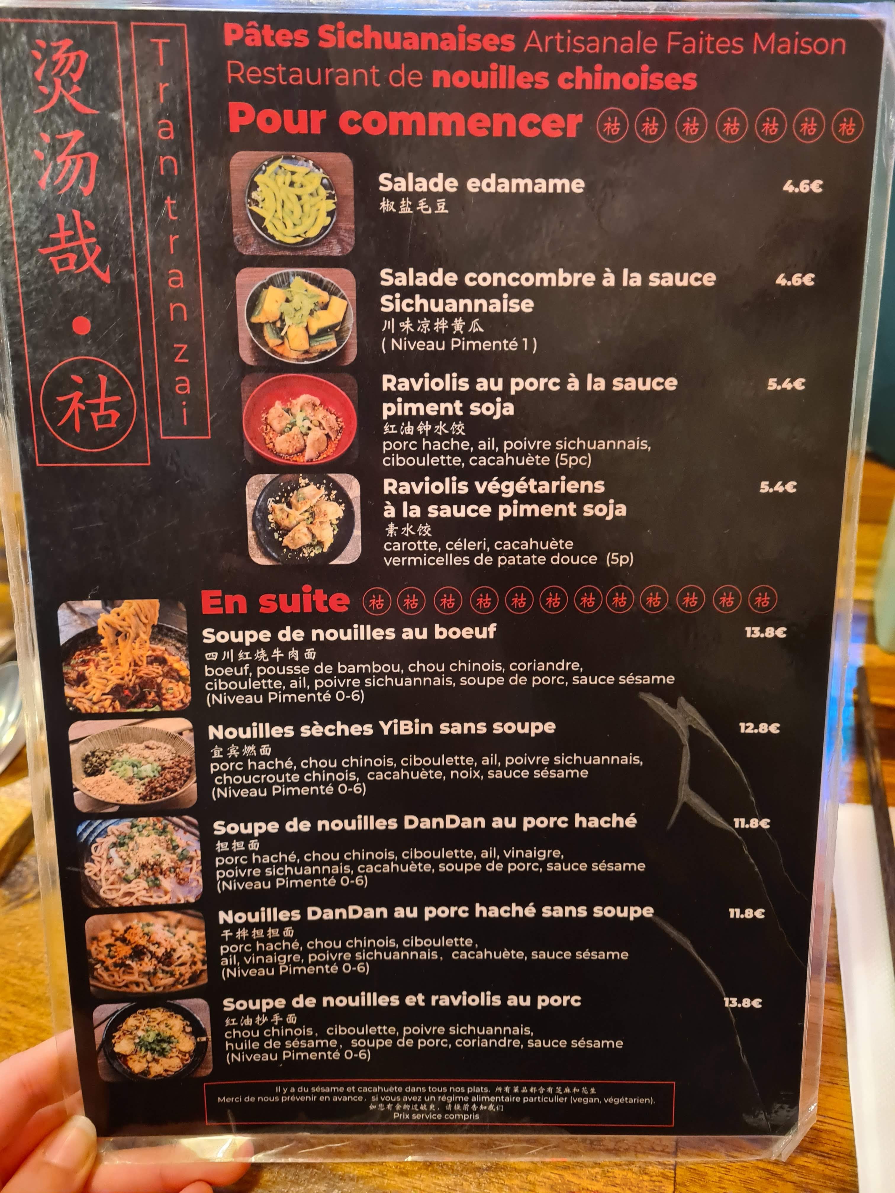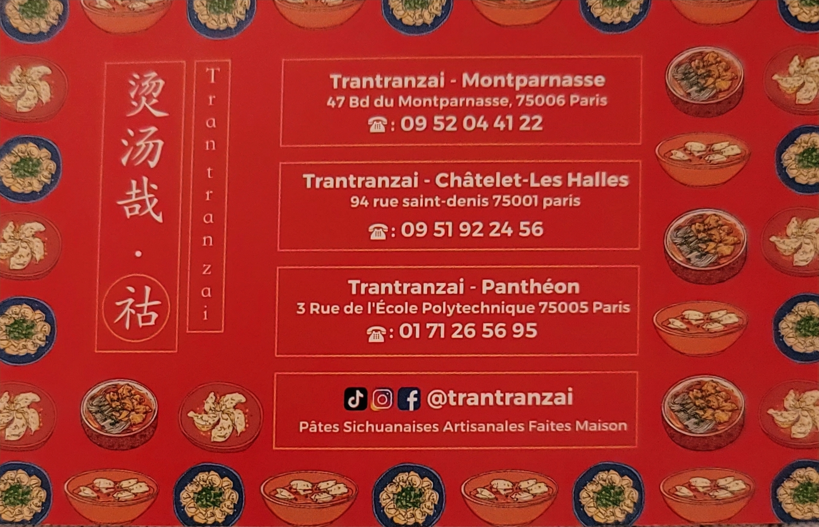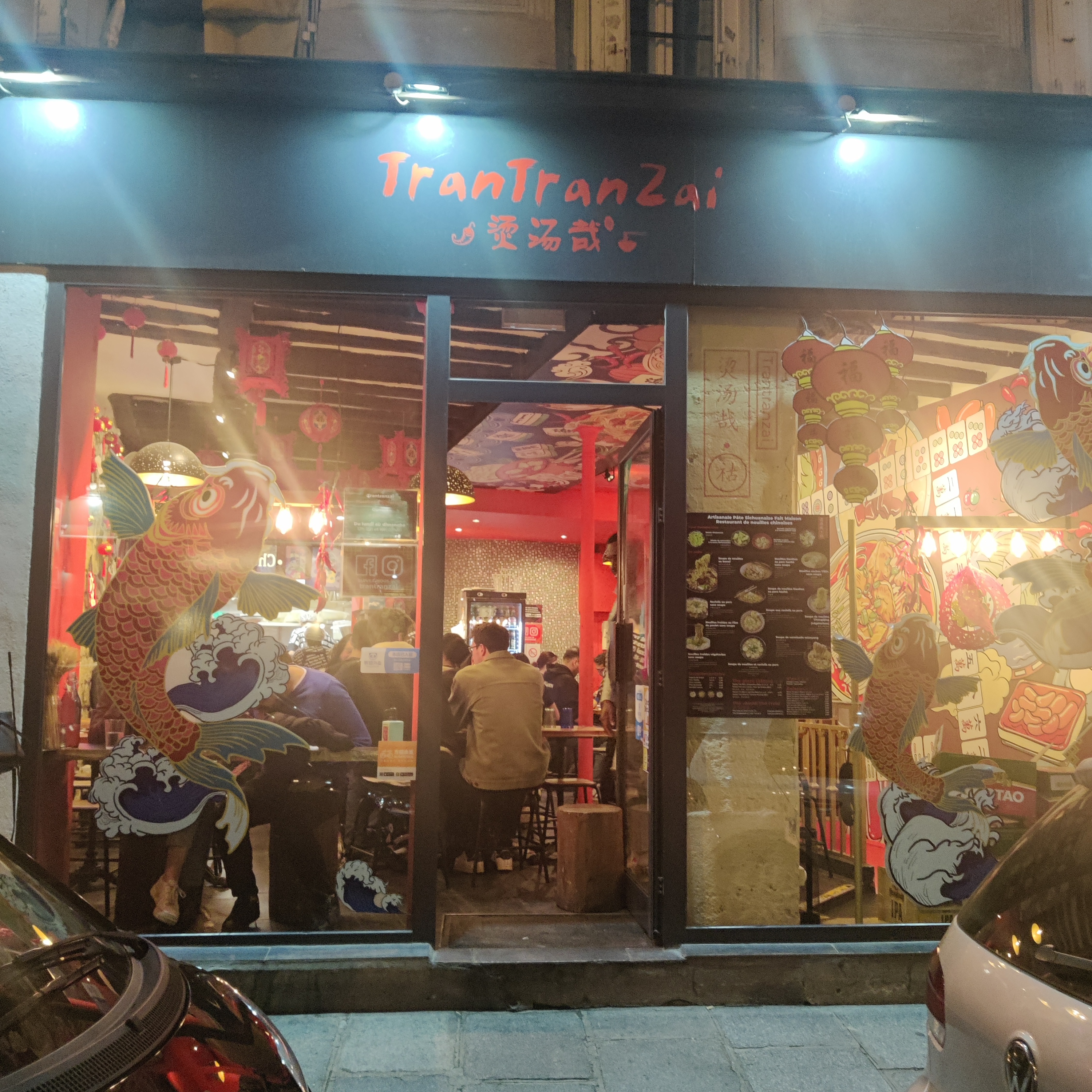 Pour fêter les vacances après un examen difficile accompagné de mes bons amis, nous cherchions un restaurant pas trop cher avec une bonne nourriture. Autant vous dire que TranTranZai est une excellente découverte !! La décoration, l'atmosphère, les employés, la nourriture, tout était très agréable ! Ayant déjà voyagé en Chine et étant un grand amateur de sa gastronomie, j'ai été très agréablement surpris de retrouver ici, à Paris, des goûts si nostalgiques et délicieux que je n'avais plus expérimenté depuis un moment. Pour finir le prix est aussi très honnête pour la qualité de la nourriture, le bouillon est excellent, la possibilité de choisir la quantité de poivre de sichuan est très appréciable, que du positif. Je recommande à 100% et j'y retournerai avec plaisir :)