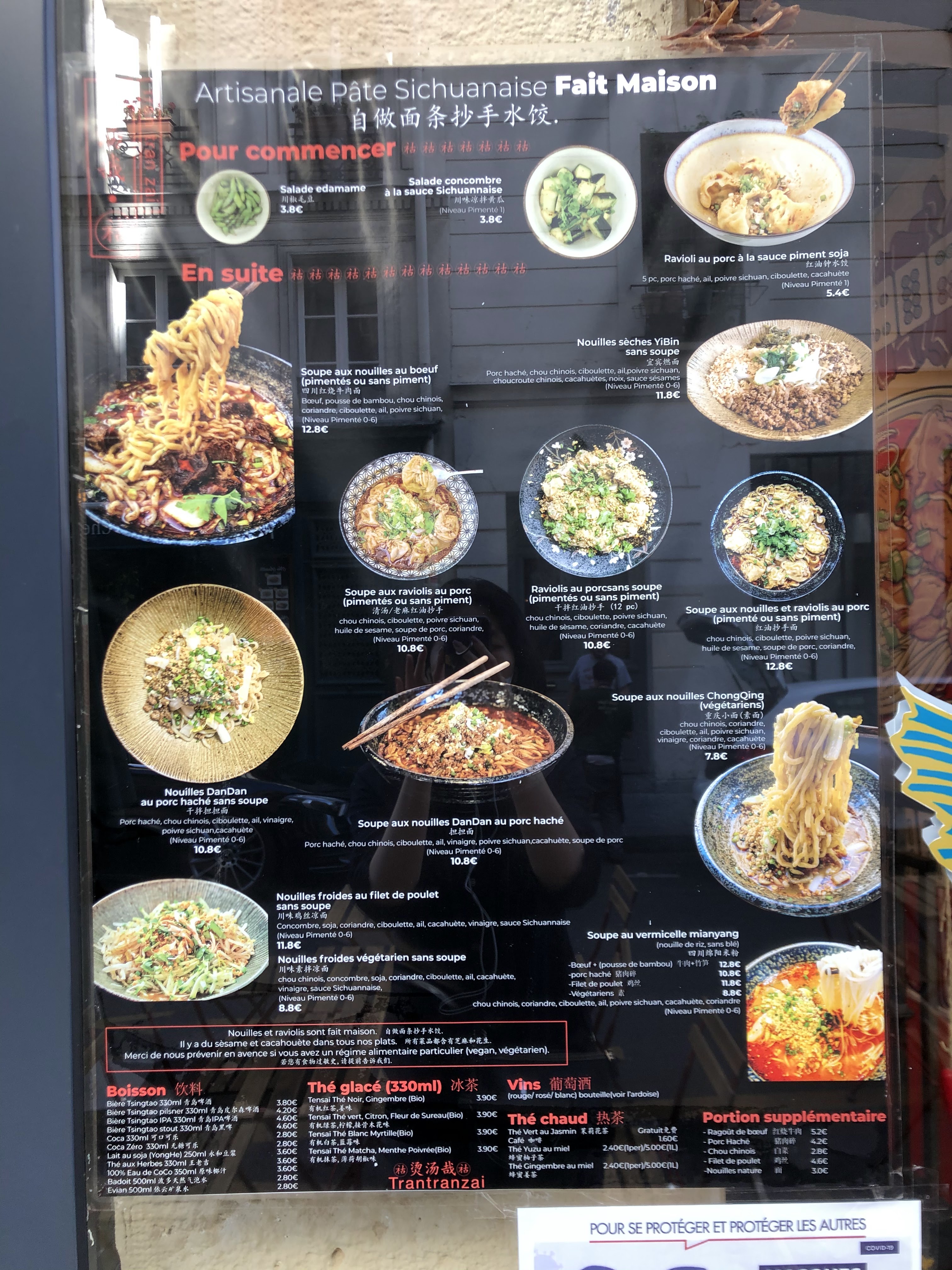Restaurant qui a ouvert récemment près du Panthéon proposant des nouilles et raviolis façon sichuanaise. Les raviolis sauce pimenté et soja (1er sur la carte) et les raviolis sans soupe pimenté (type wonton 抄手)sont à tester absolument, ce sont des purs délices. Super rapport qualité/prix avec un accueil chaleureux !