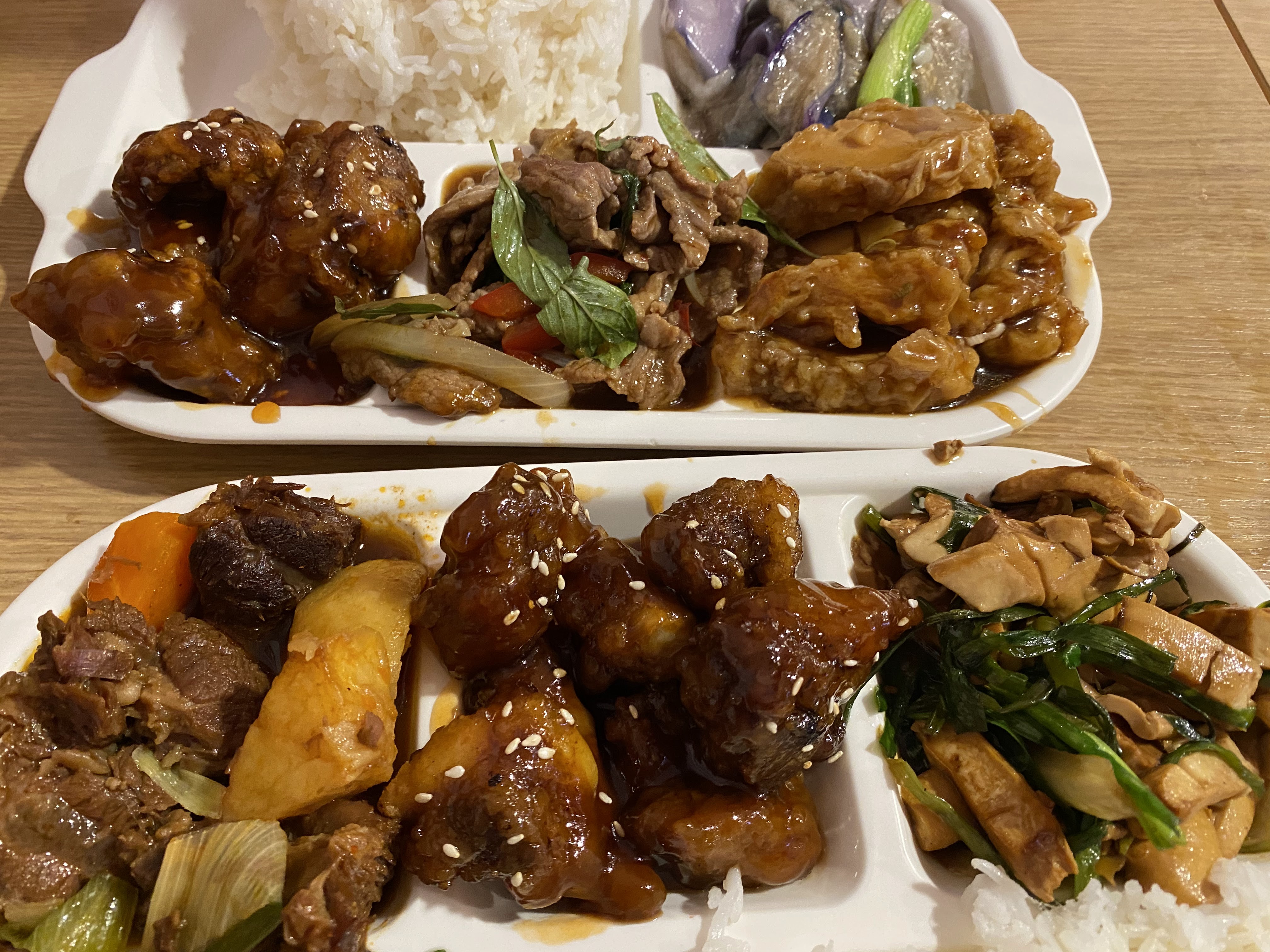 Très bon restaurant avec possibilité de manger sur place ou de prendre à emporter. Nous avons pris la formule Bento avec 3 plats au choix, du riz blanc, 2 raviolis et une boisson pour 11 euros. Il faut rajouter un petit supplément si vous préférez le riz cantonnais ou les nouilles sautées. Il y a bien sûr plein de plats aux choix, nous nous sommes régalez !