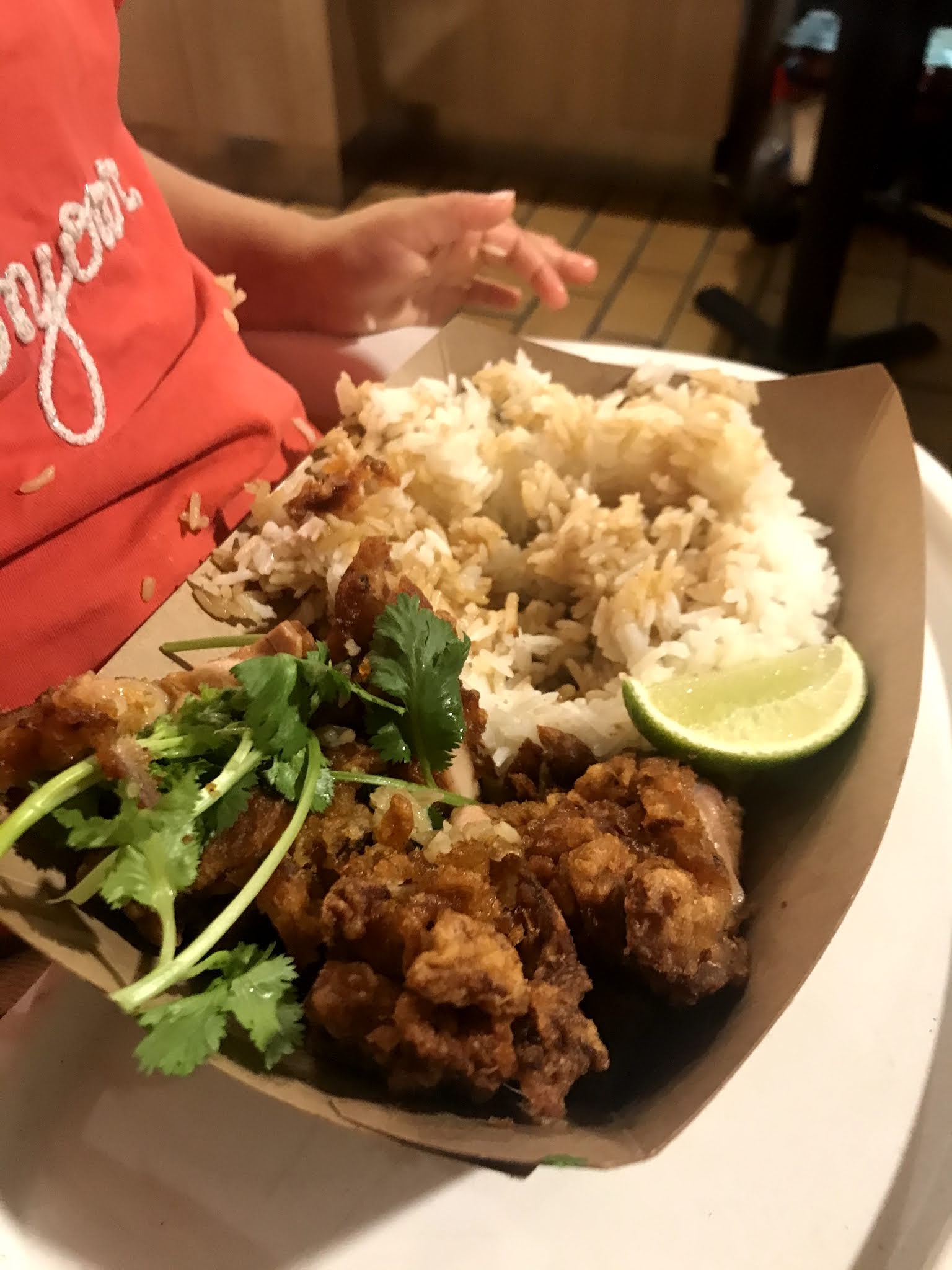 Le riz était tiède, collant et gluant. Comme s'il avait été cuit plusieurs jours auparavant et juste décongelé quelques minutes avant. Le poulet à la citronnelle était trop gras et plein de pâte à frire, si bien que les morceaux de poulet étaient rares dans le plat !!!