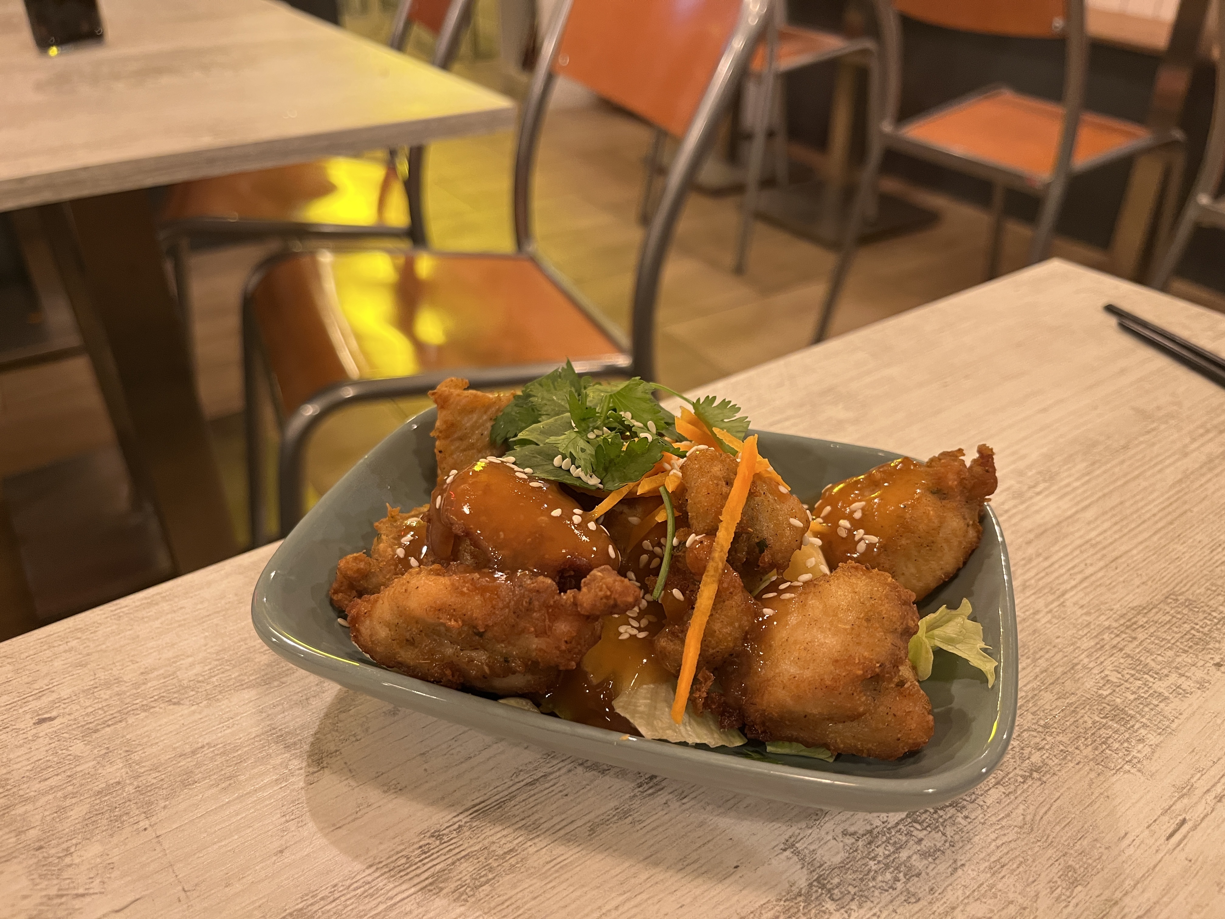 Plat de nouille mais un peu décevant (légumes crus, poulet frits correct, petite portion de nouille). Le dessert baozi est original, en quantité généreuse et bon, mais l'équilibre est légèrement off : fourrage un peu trop sucré, beignet un peu fade.